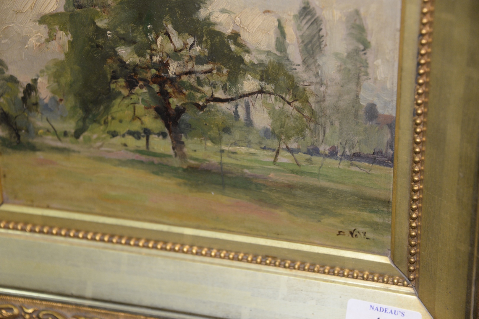 Lot 456: Douglas Volk American, 1856 – 1935 Springtime landscape oil on canvas laid on board signed lower right: D Volk To My Friend, Wyat…
