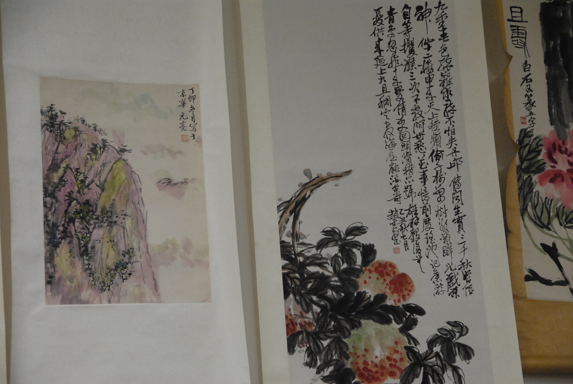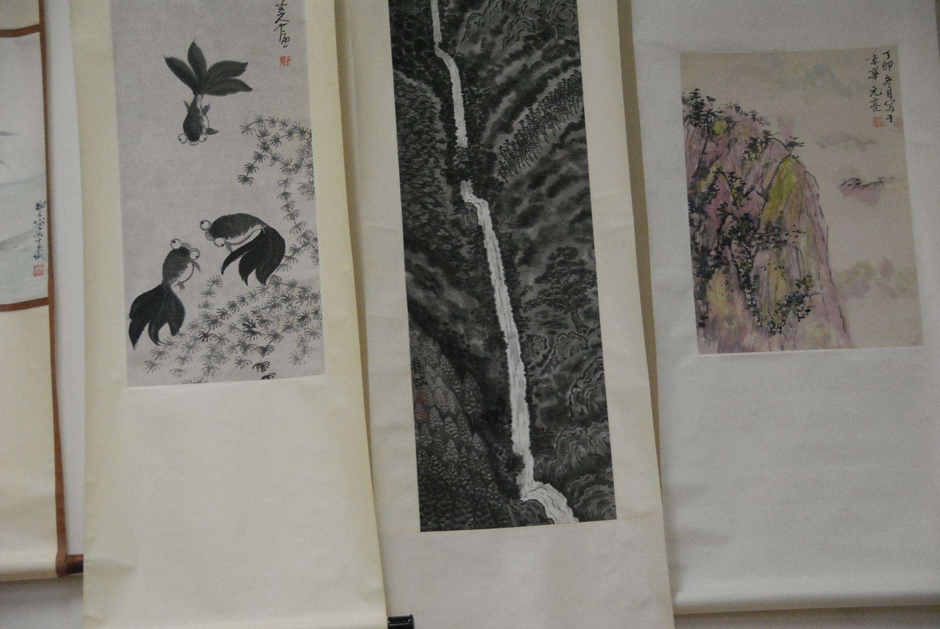 Lot 456: Group of five Oriental scrolls, two mountainous landscapes, one of tree, one of birds and one of coy.
