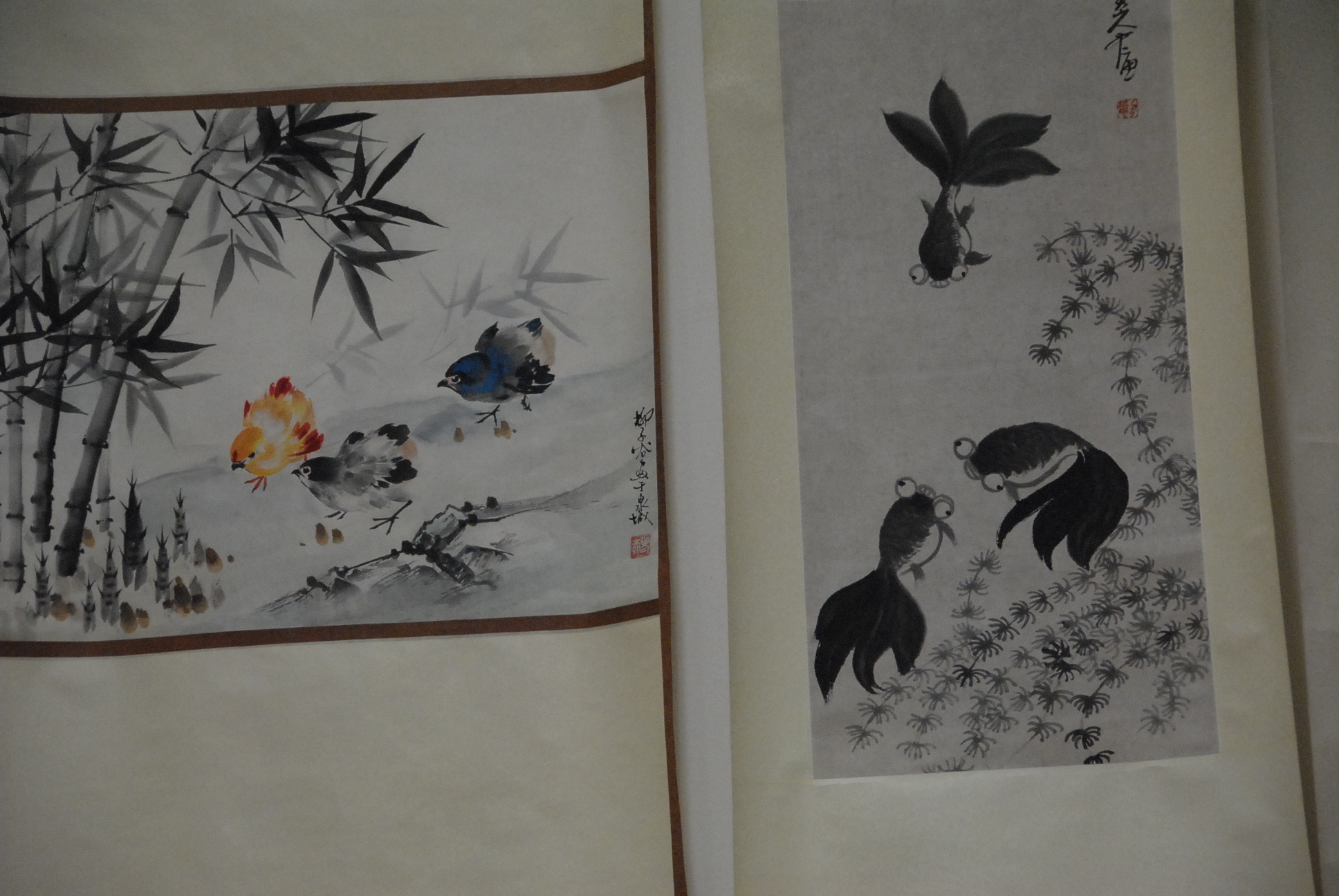 Group of five Oriental scrolls, two mountainous landscapes, one of tree, one of birds and one of coy.