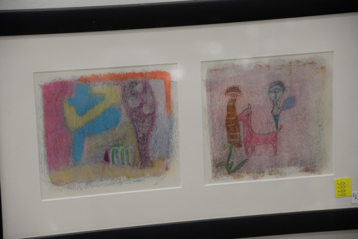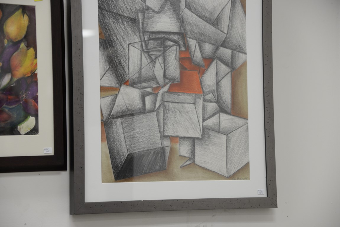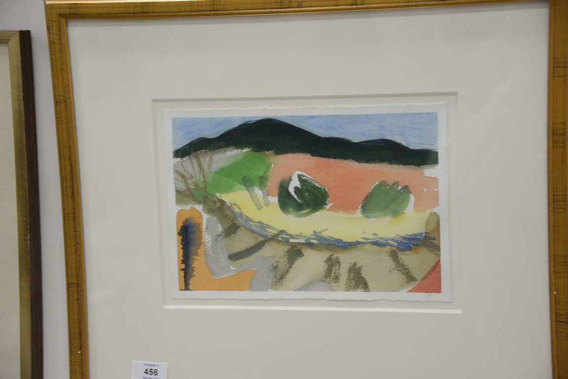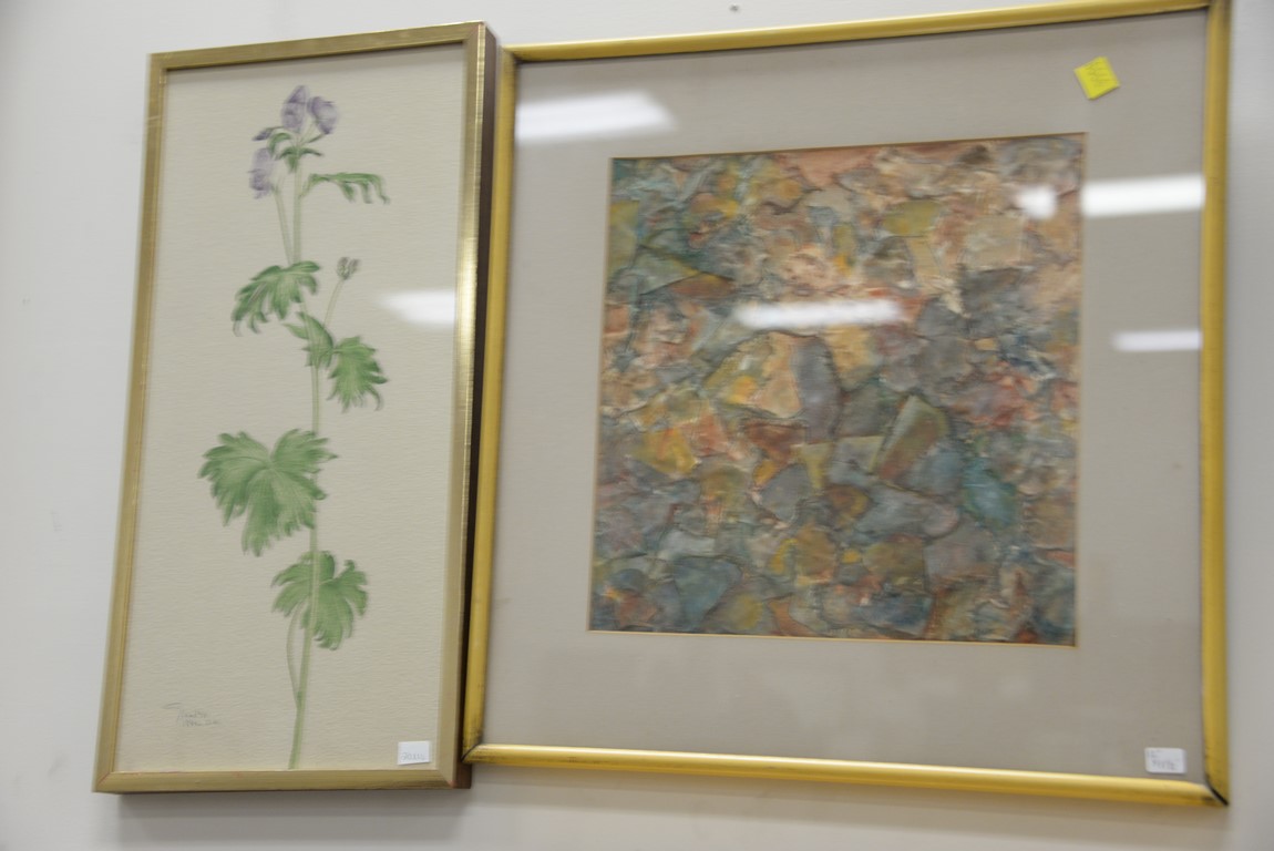 Lot 456: Group of seven paintings to include geometric designs by Liza Cowen, three dimentional colors initialed EER, pair of plant watercolo…