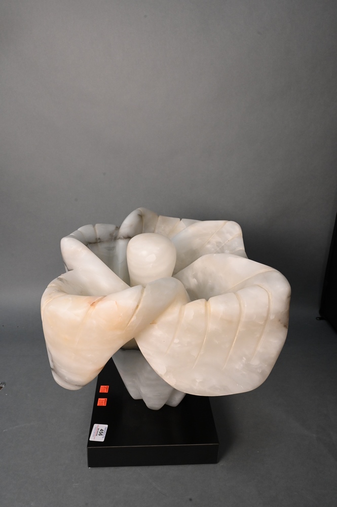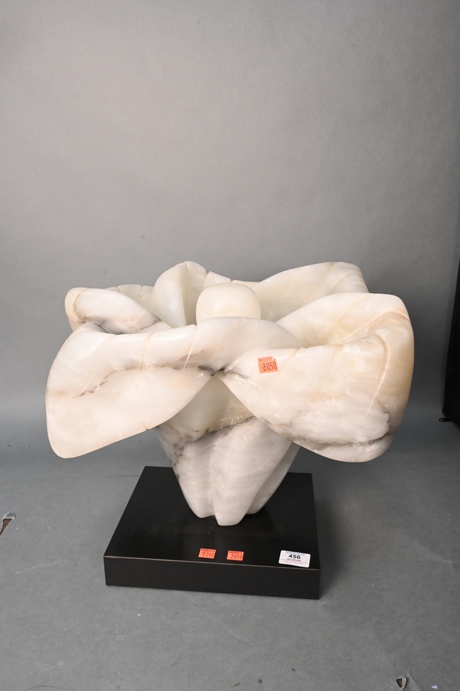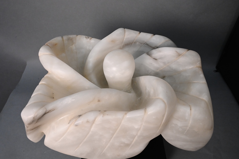 Lot 456: Helene Simone (20th century), marble sculpture of a flower on a swivel base, signed and dated near base H. Simone 77′, height 13 inches width 16 inches.