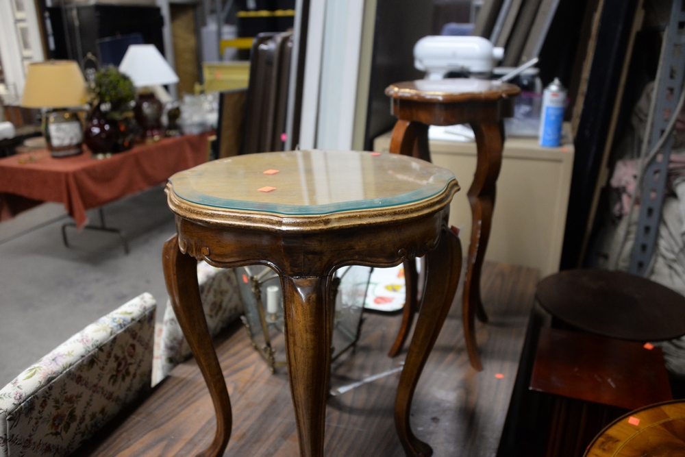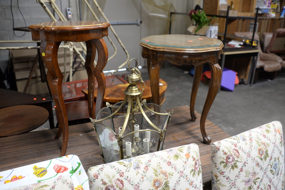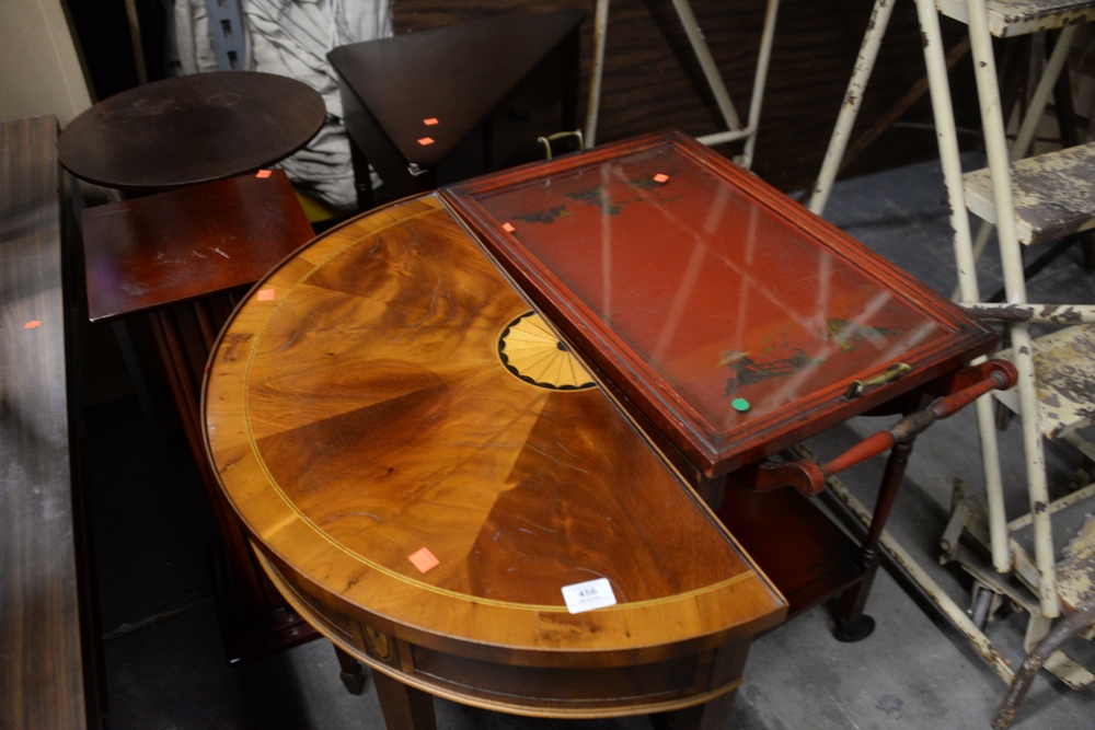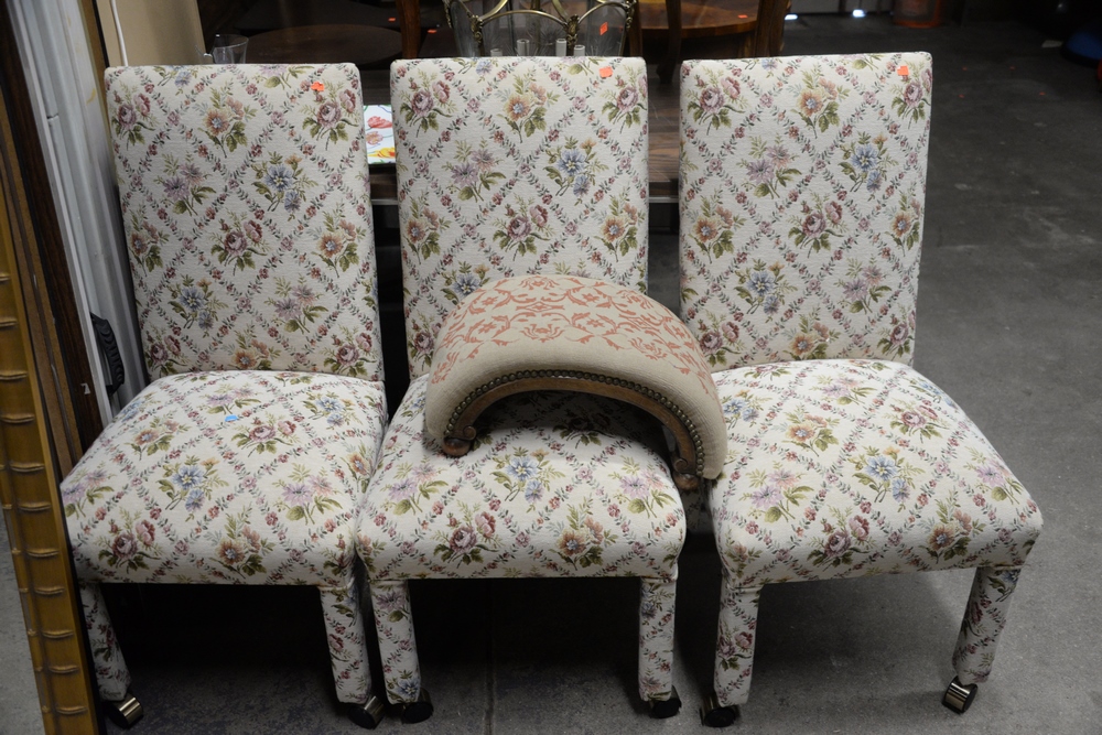 Lot 456: Large Group of Furniture, to include three floral upholstered side chairs, a chinoiserie style cart, two small side tables, an inlai…
