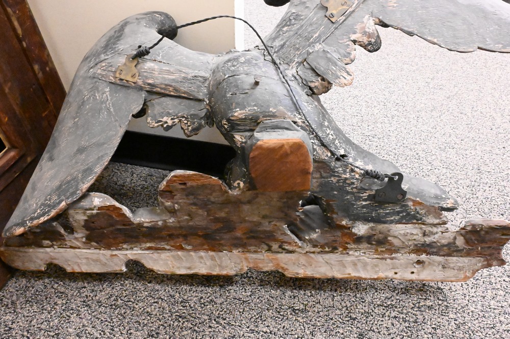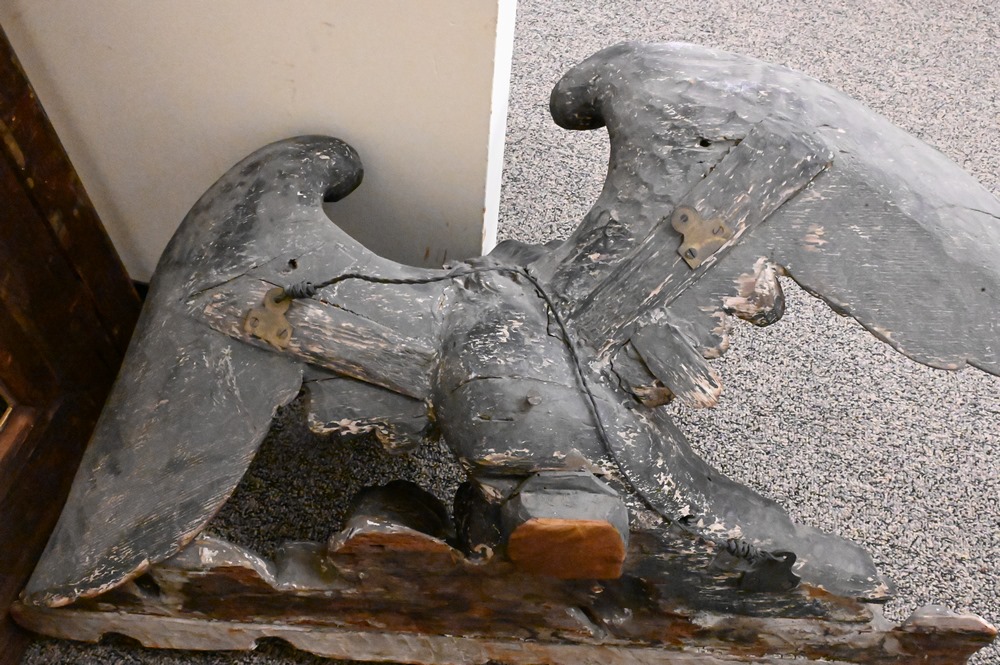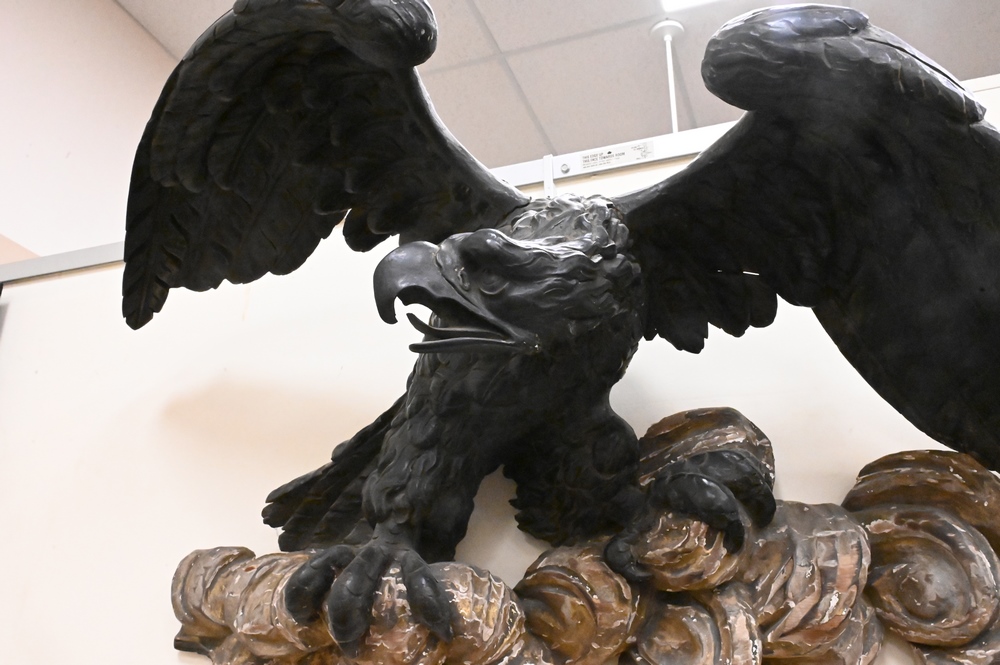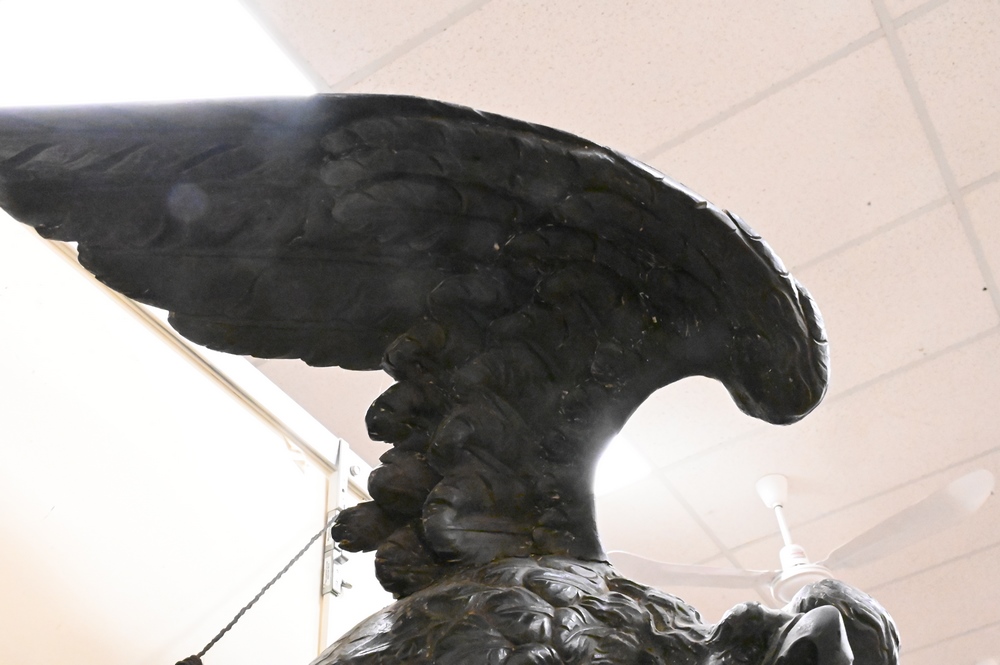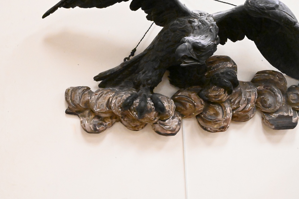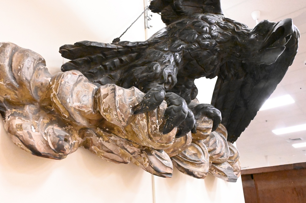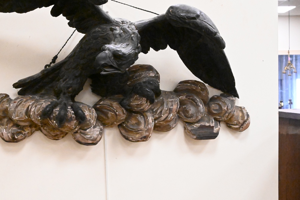 Lot 456: Majestic Carved Eagle, having full wingspan on gilt scrolled base, height 23 inches, width 39 inches.
