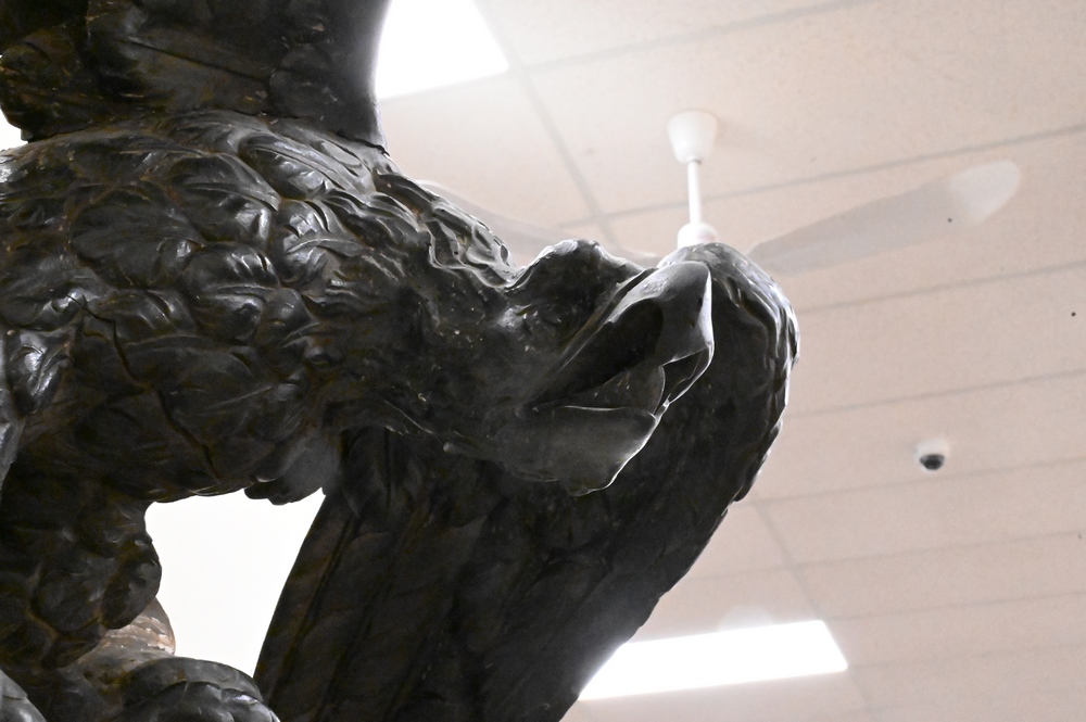 Majestic Carved Eagle, having full wingspan on gilt scrolled base, height 23 inches, width 39 inches.