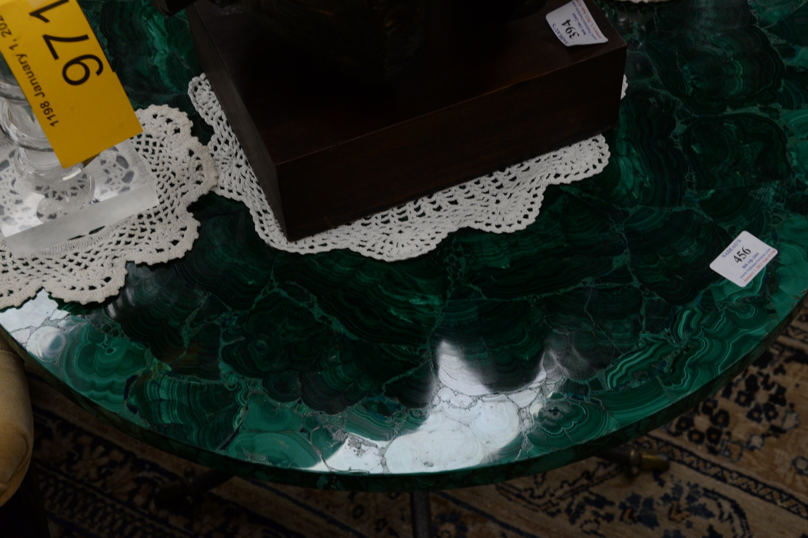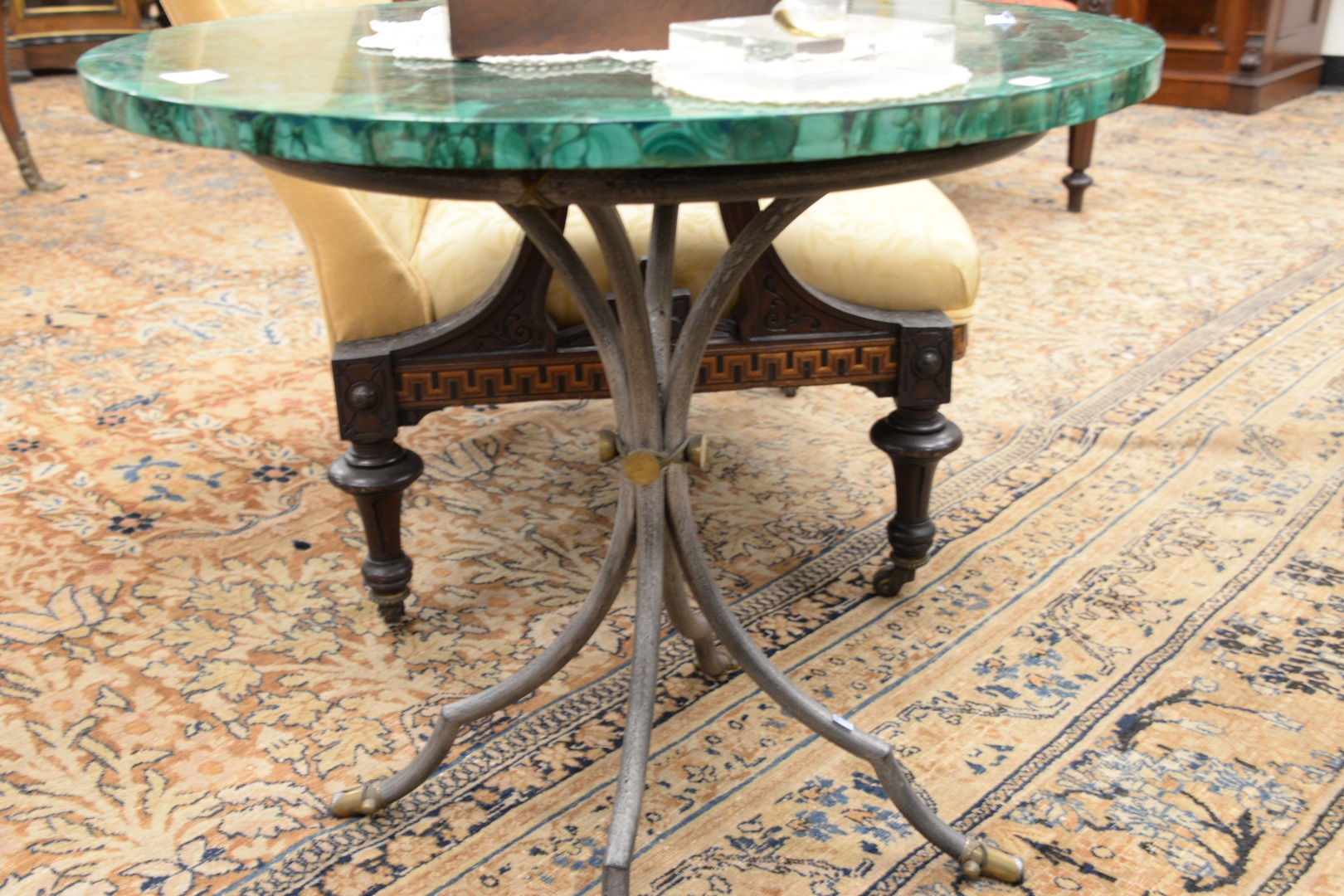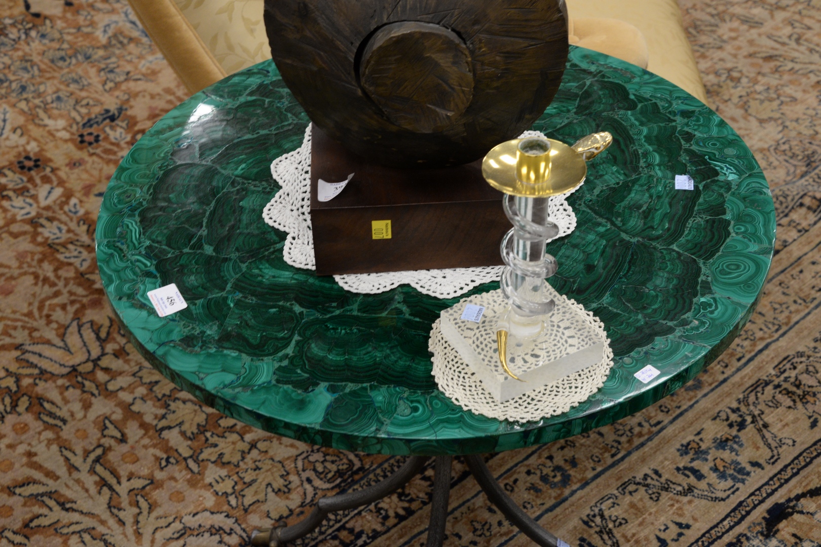 Lot 456: Malachite Top Round Table with iron brass trimmed base height 24 inches, diameter 25 1/2 inches Provenance: The Estate of Alin…