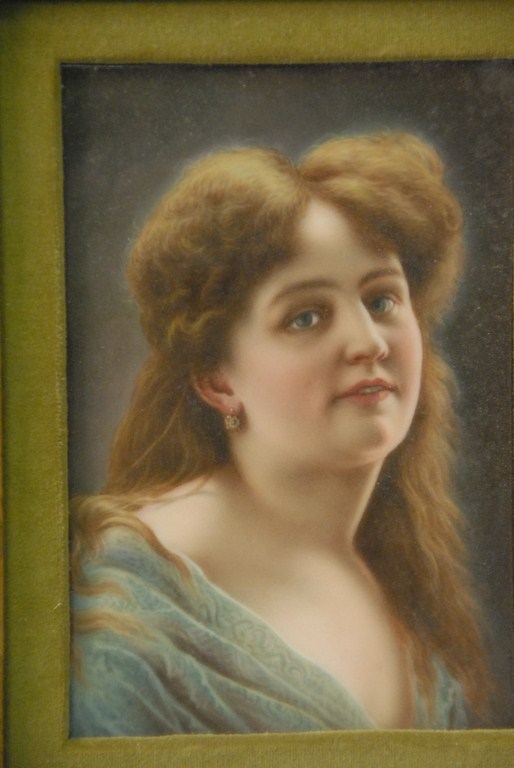 Painting on porcelain plaque, bust of woman. 6 x 4
