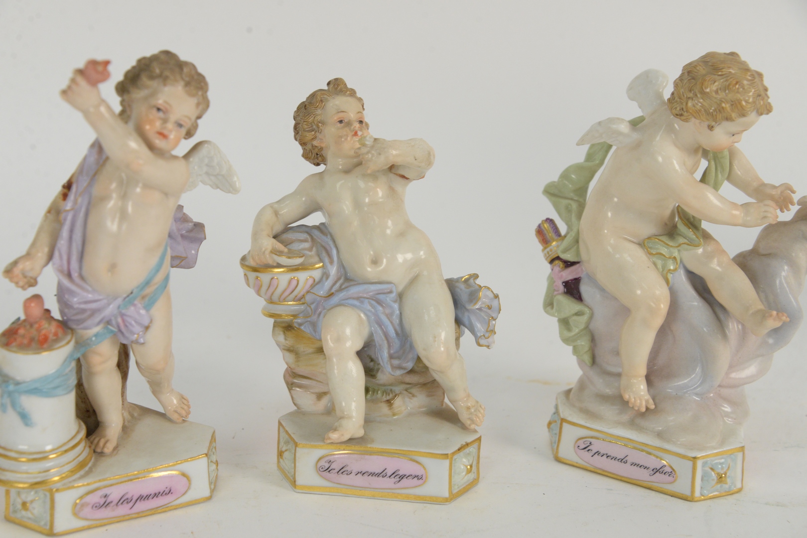 Set of Four Meissen Cherubs, to include Te les Rends Legers, Te les Punis, Te les Balance, and Te Prends Mon Efsor, possibly by Acier, after drawings by Schoenau, 1775 one having Davis Collamore, New York label on bottom, and marked with crossed swords, repaired, heights 5 to 5 1/2 inches.