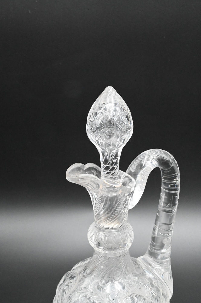 Cut Crystal and Etched Decanter, having scrolling fern vine and flower decoration on petal foot, height 13 1/4, (chipped foot).