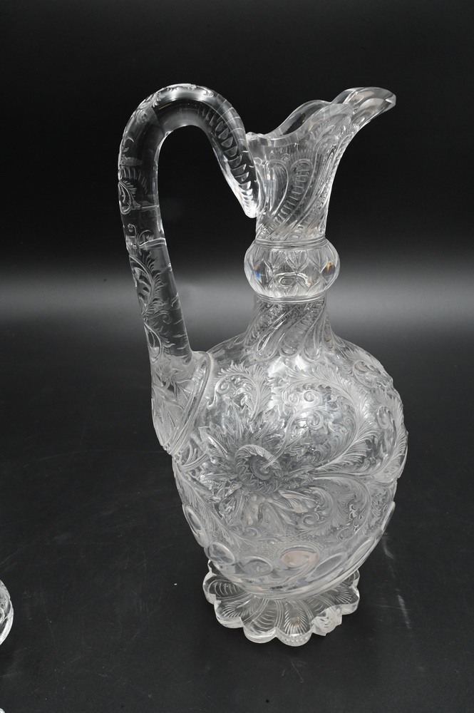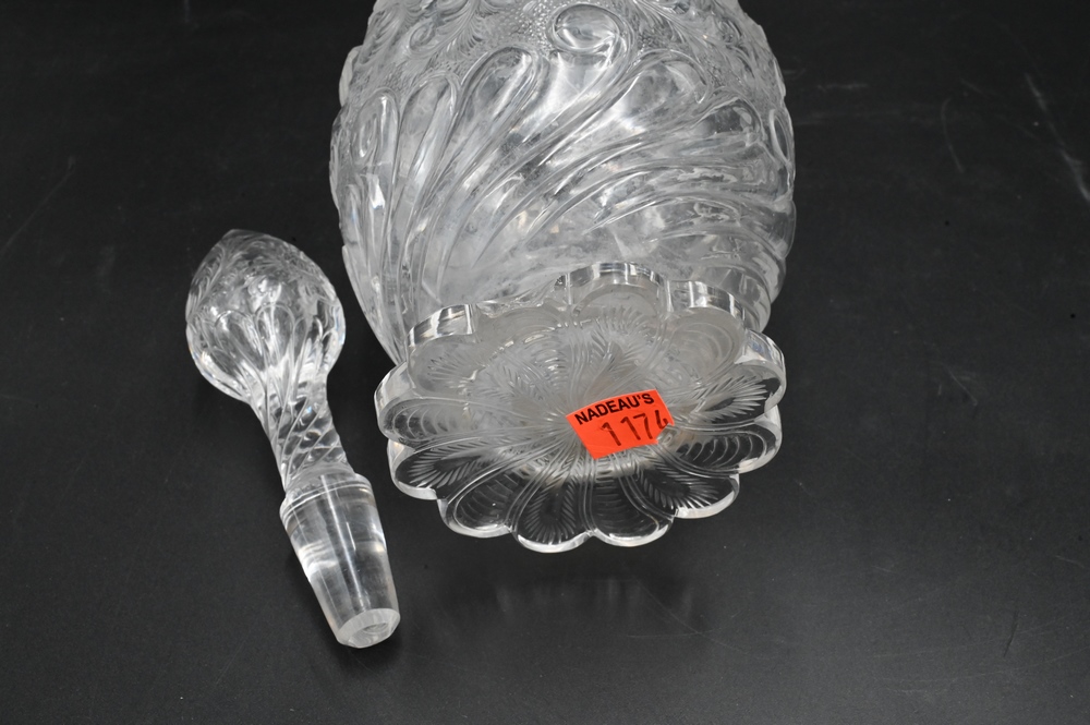 Lot 457: Cut Crystal and Etched Decanter, having scrolling fern vine and flower decoration on petal foot, height 13 1/4, (chipped foot).