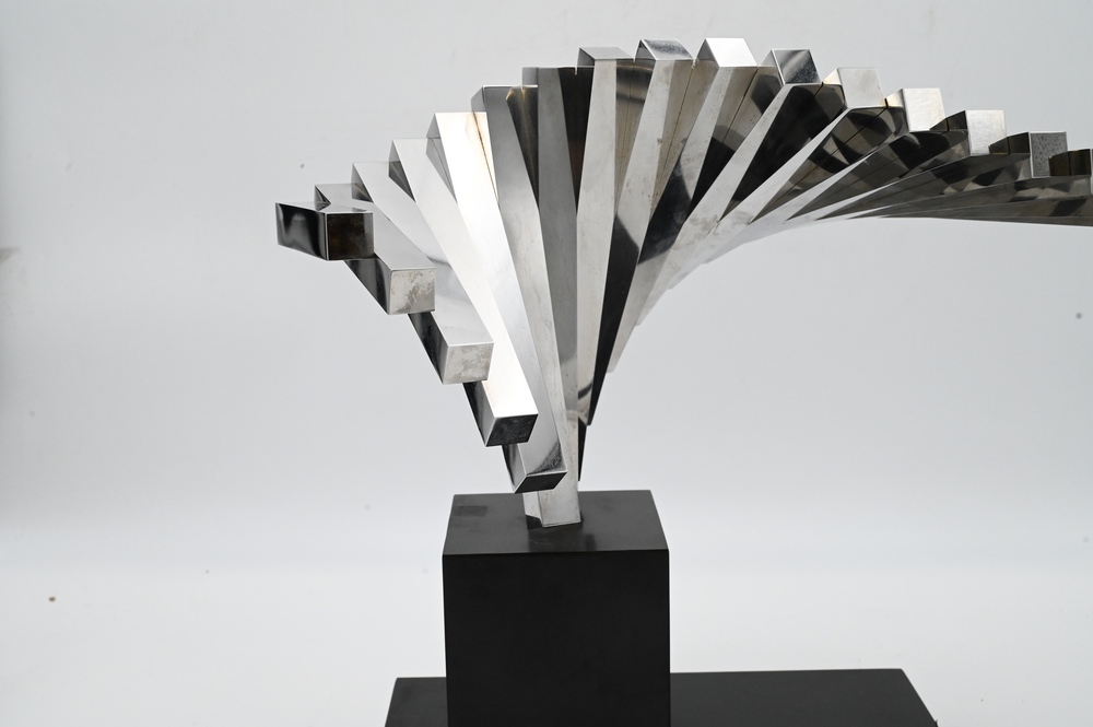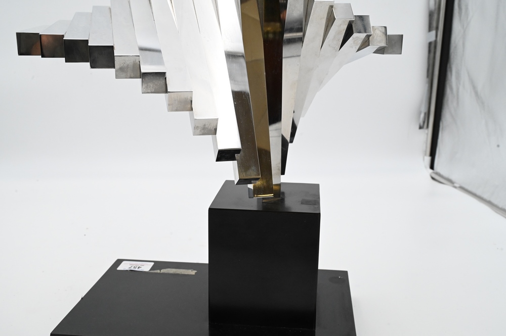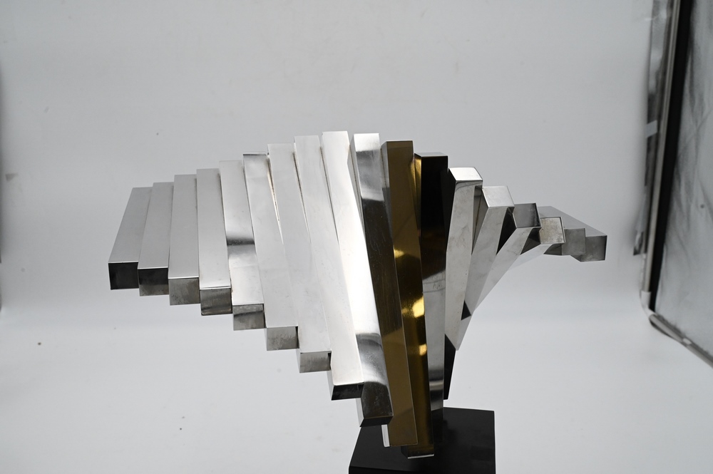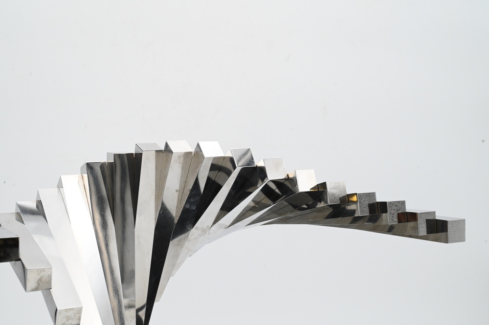 Lot 457: David Lee Brown (American, 1939-2016), “1-70”, 1970, stainless steel, signed with the artist name on the underside of a bar, overall height 15 inches, width 15 inches, depth 10 inches.