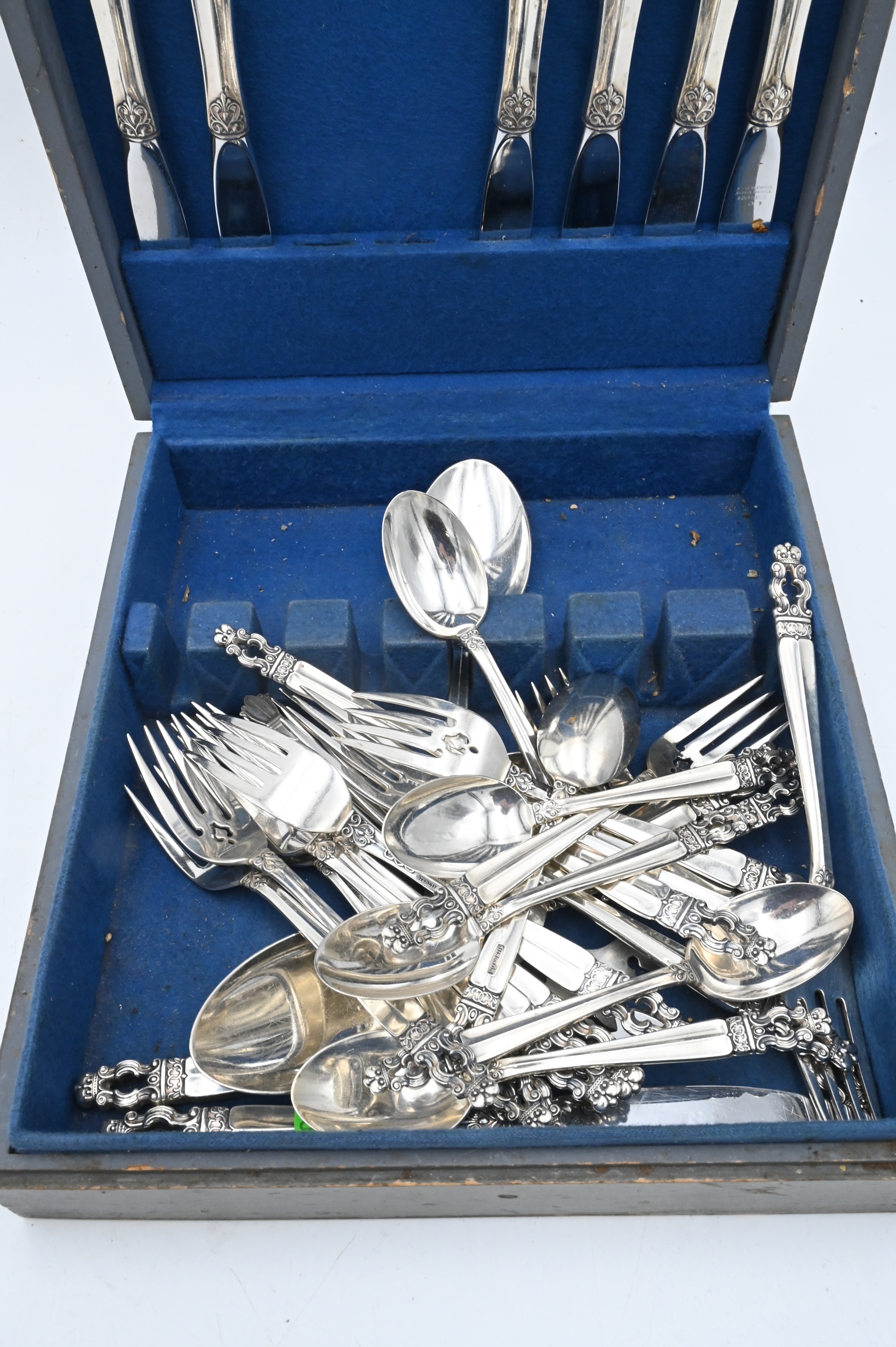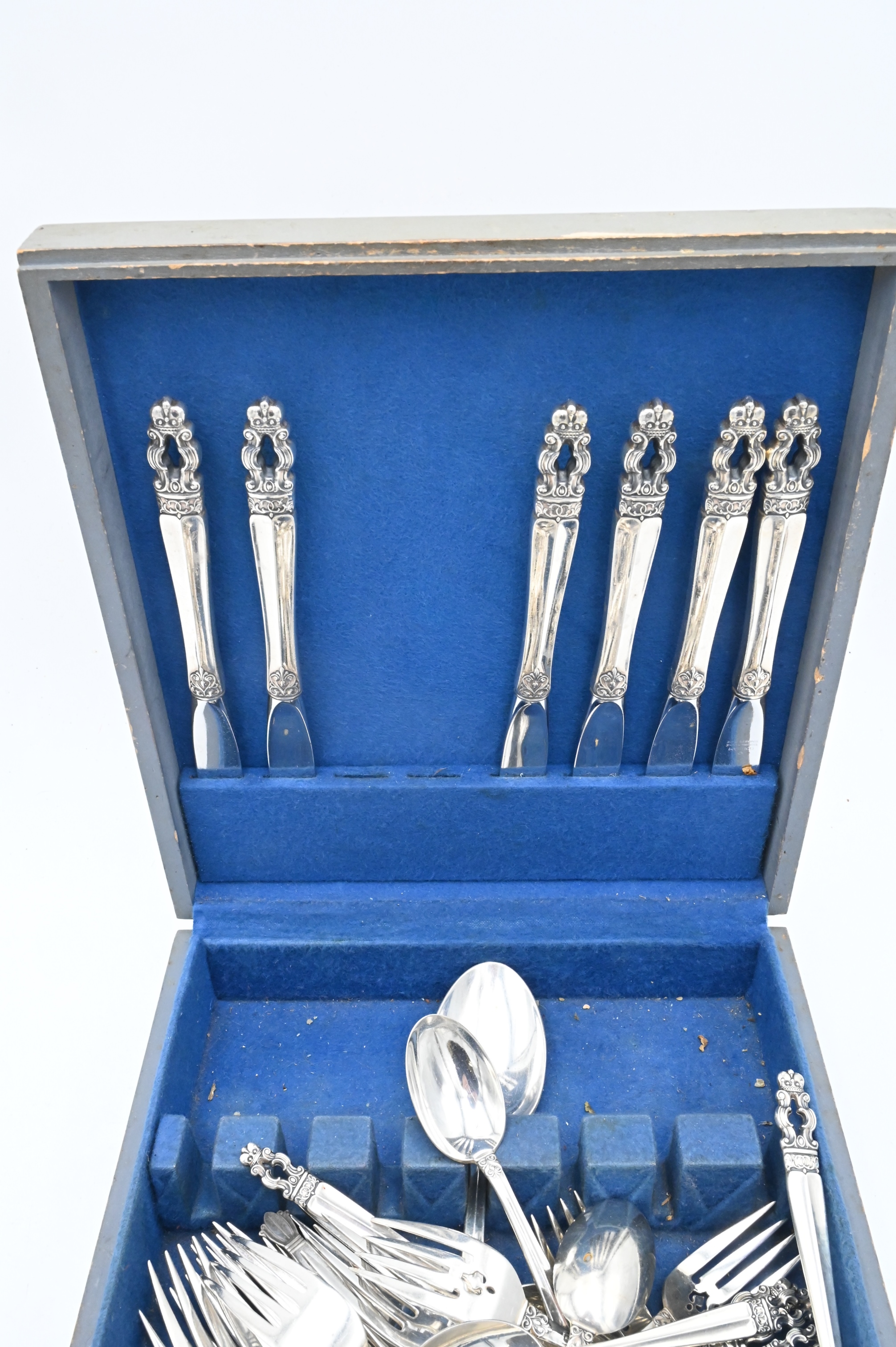 Gorham Sterling Silver Hispana Flatware Set, in a fitted box, with 8 dinner forks, 8 salad forks, 8 tea spoons, 2 place spoons, 1 sugar spoon, 8 dinner knives, 1 cake knife, plus one additional sterling serving item, 43.6 t.oz., plus handles.