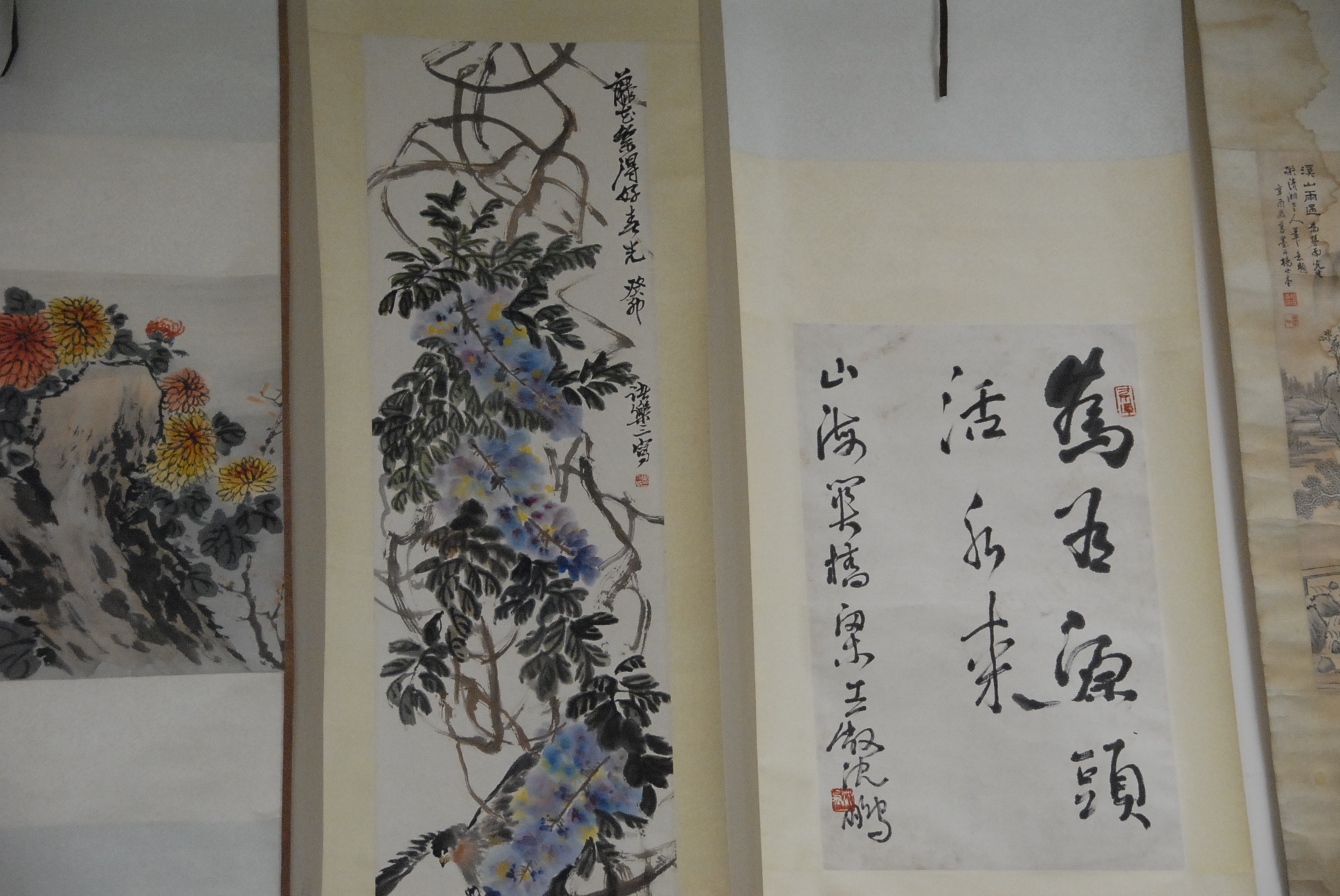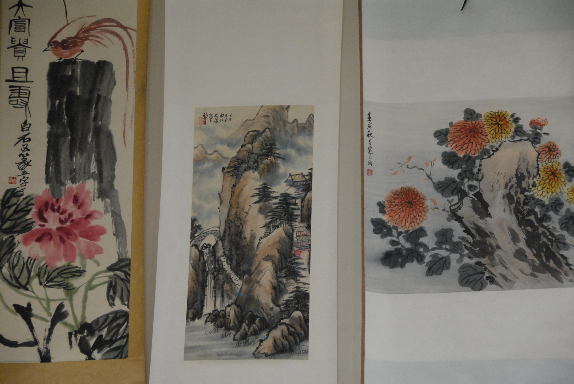 Lot 457: Group of five Oriental scrolls, three of blossoming trees, one landscape and one of calligraphy.
