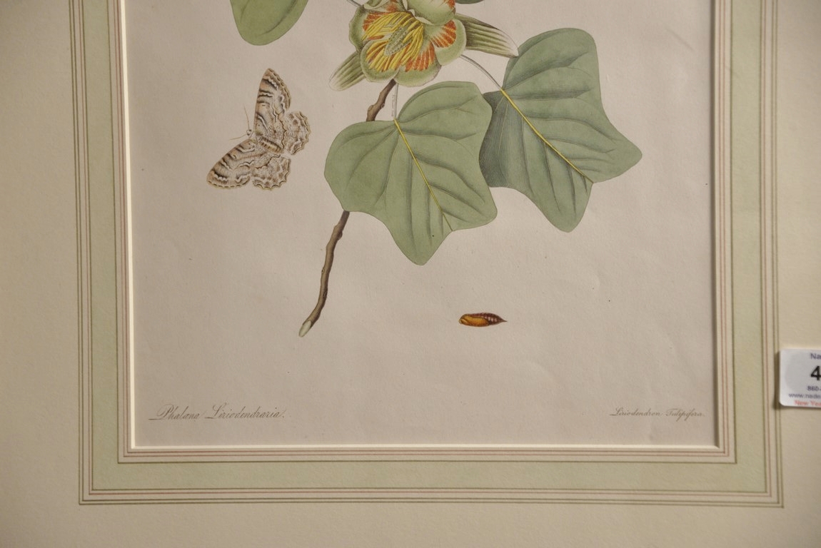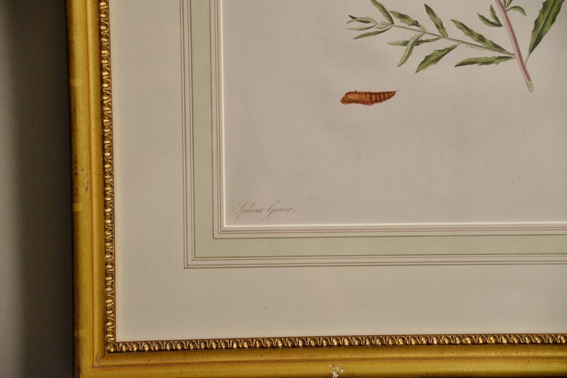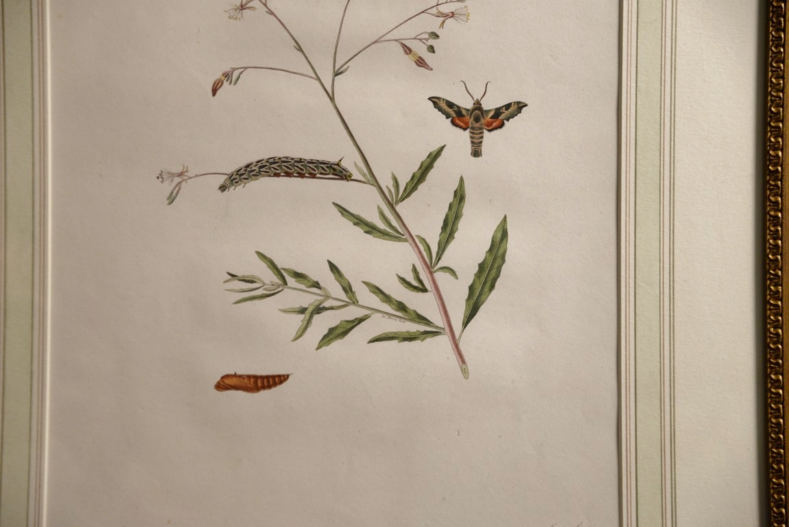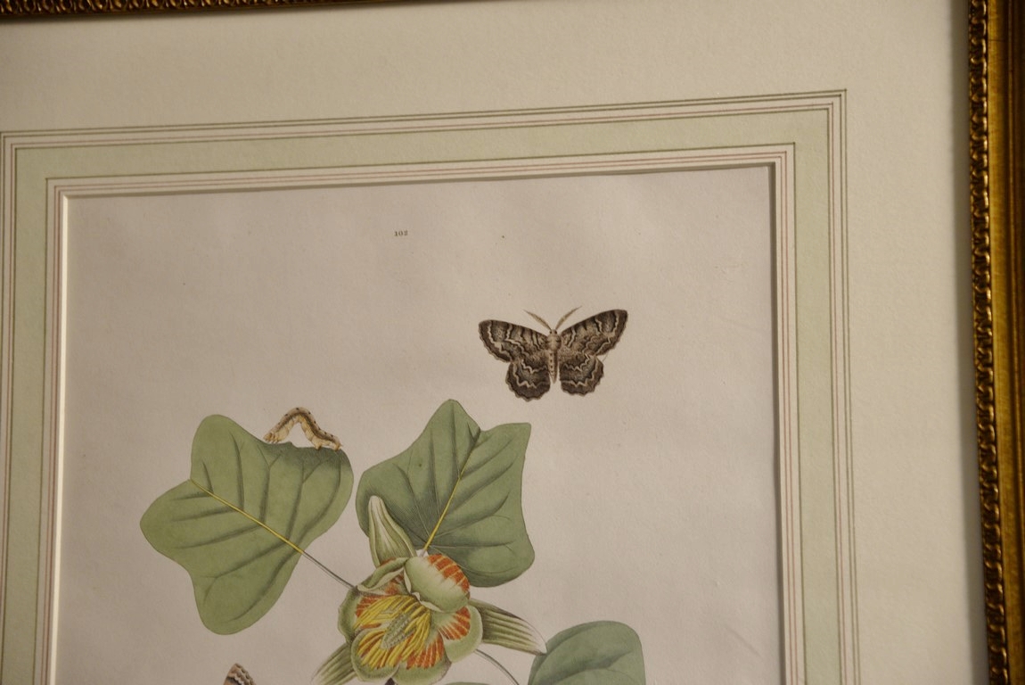 John Abbot 1751-1839 pair of hand colored aquatint engravings Phalaena Gaurae, Clouded Crimsonmoth Plate #99 and Phalaena Liriodendraria, Carpet or Tuliptree Beauty Moth Plate #102 From The Natural History of the Rarer Lepidoterous Insects of Georgia Published by James Edward Smith 1759-1828 framed and matted by W. Graham Arader III sight size: 14 x 11 Provenance: Property from Credit Suisse’s Americana Collection