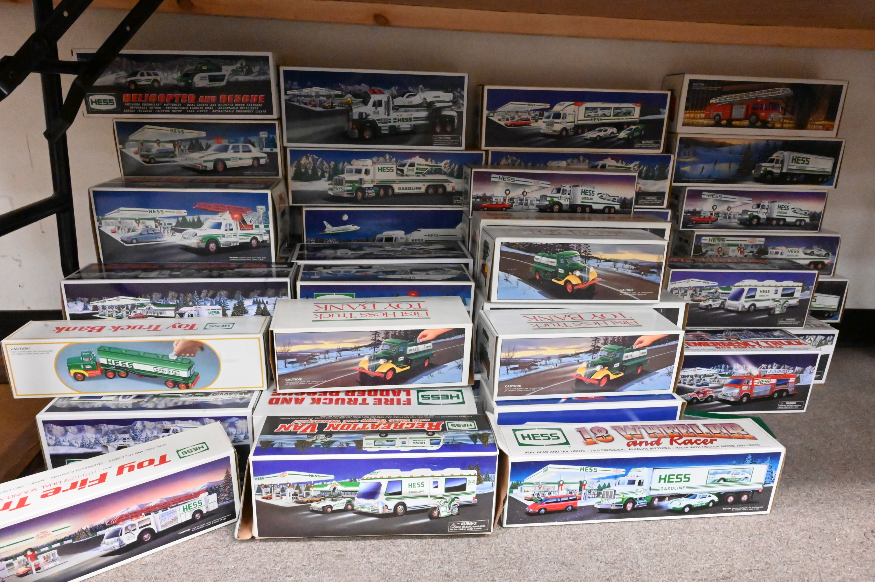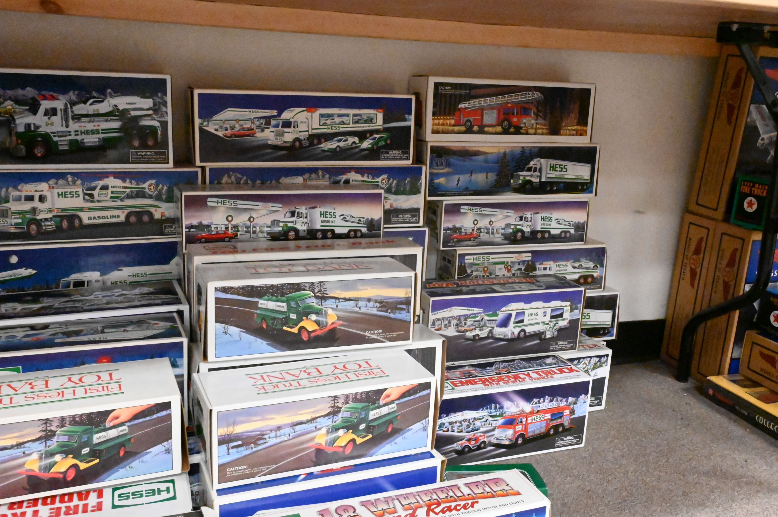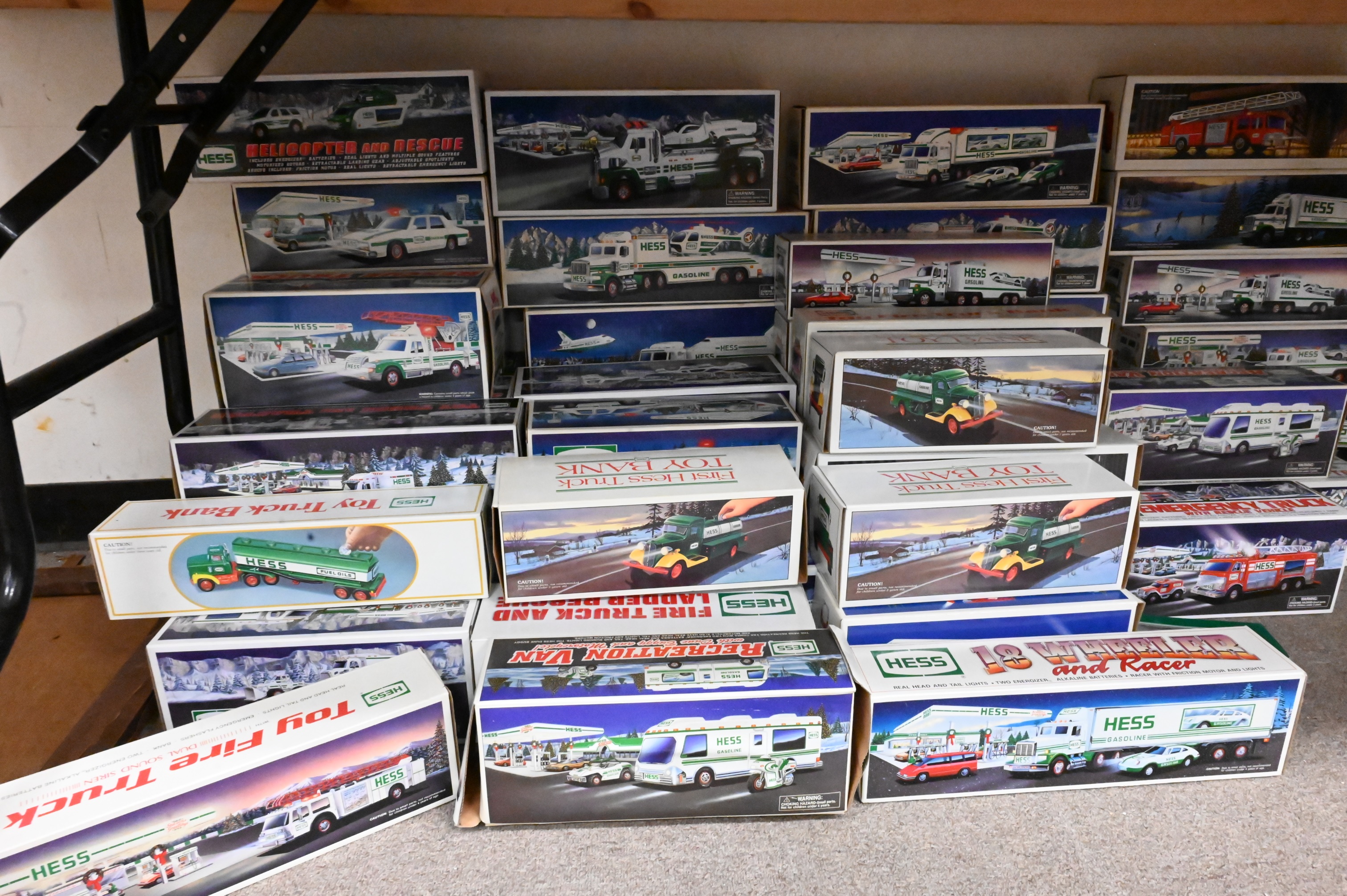 Large Collection of Hess Toy Trucks, to include 18 wheeler and racer, emergency truck, fire truck, etc..
