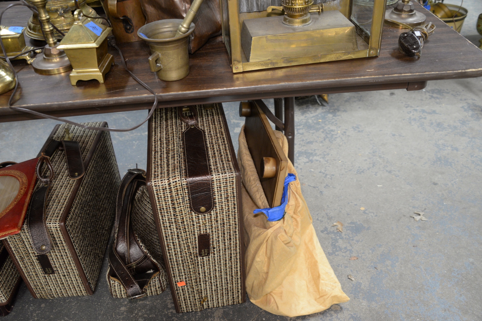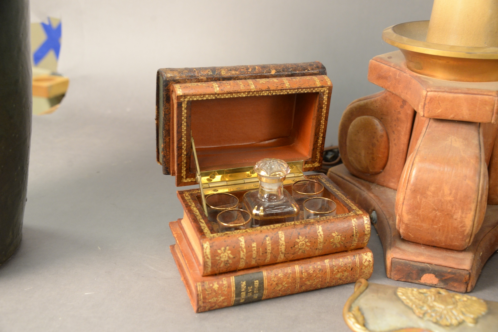 Large Group of Assorted Items, to include leather desk items, leather chess board, leather wrapped lamp, along with four Hartman suitcases.