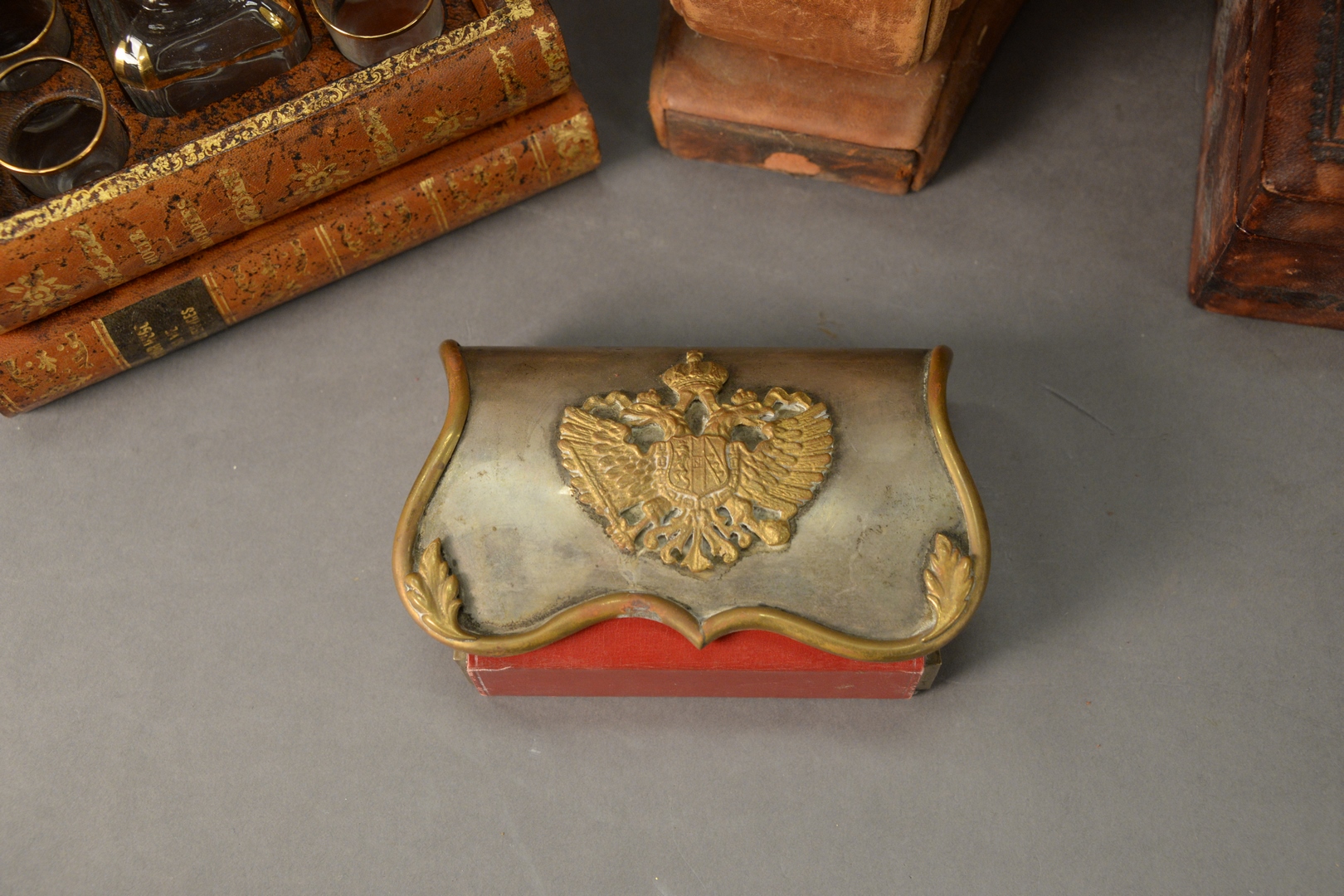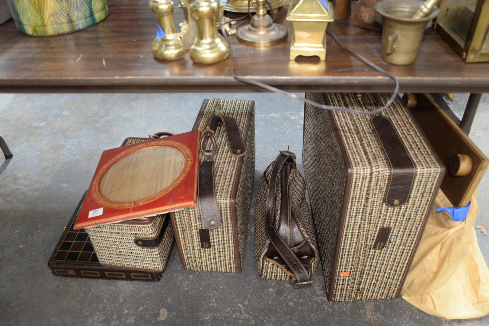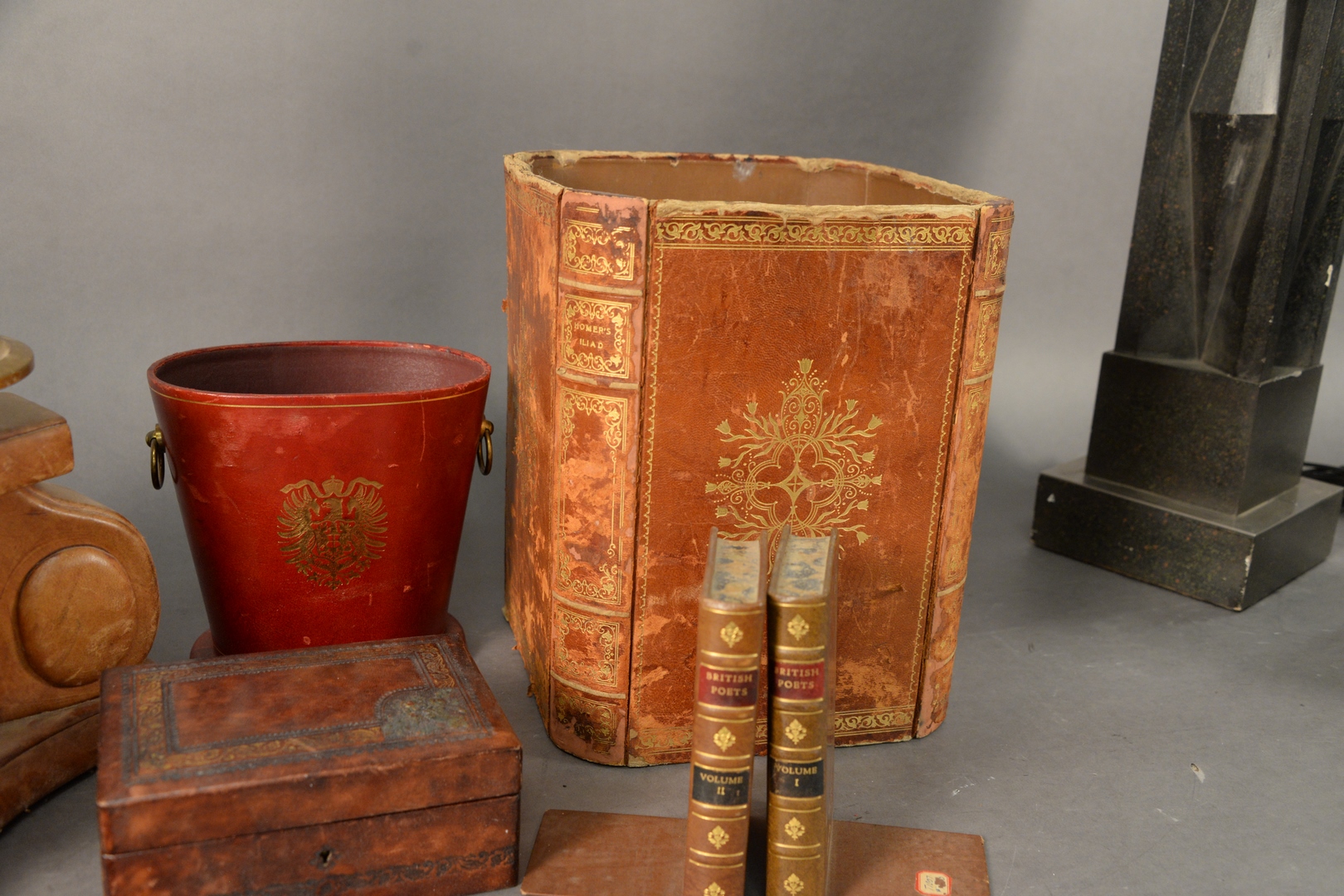 Lot 457: Large Group of Assorted Items, to include leather desk items, leather chess board, leather wrapped lamp, along with four Hartman suitcases.