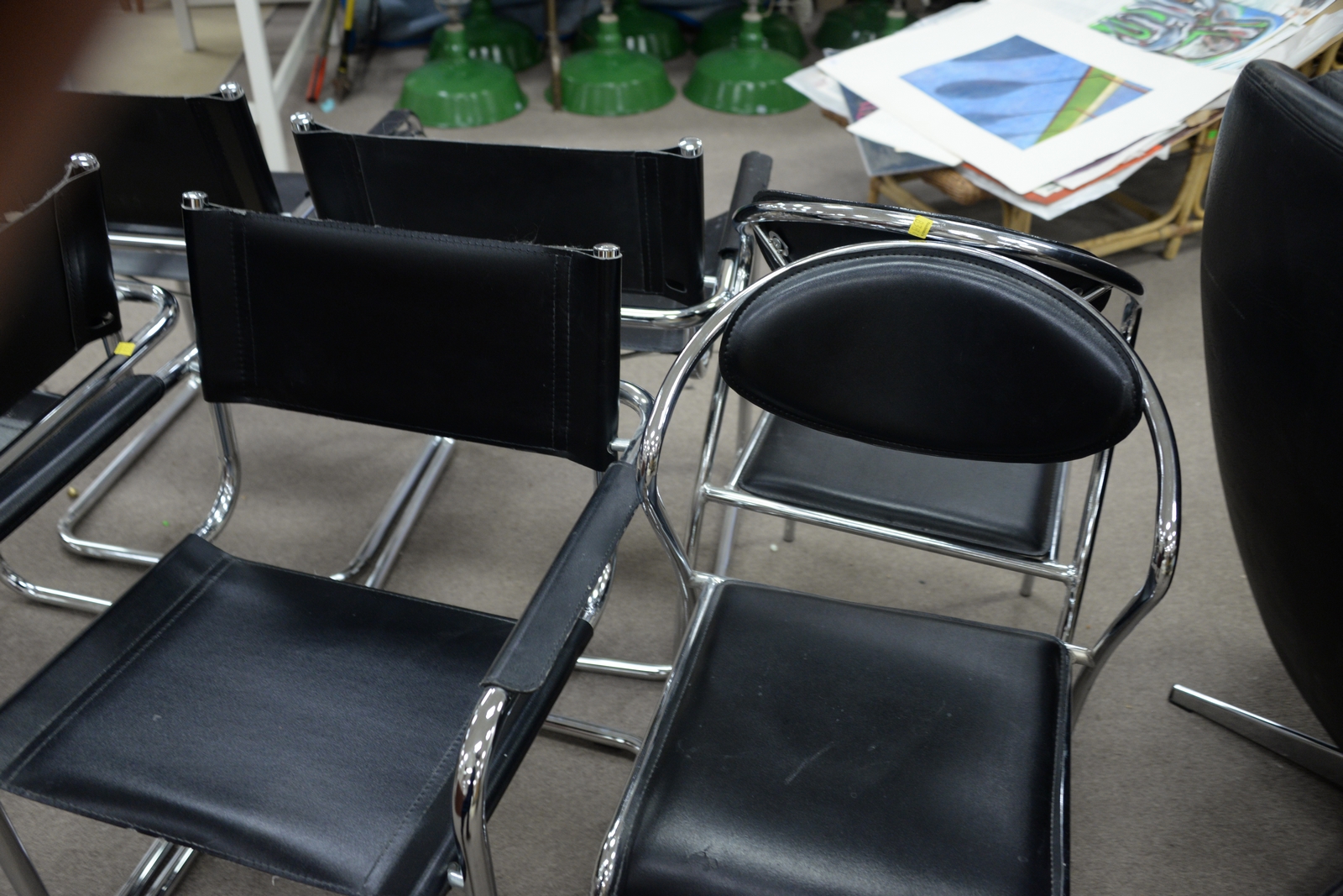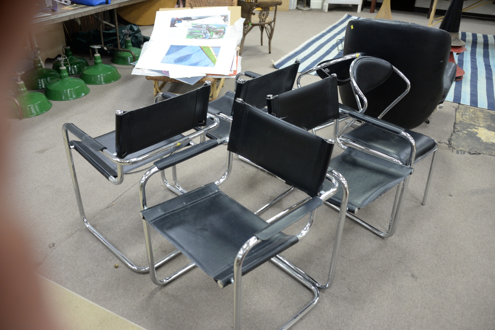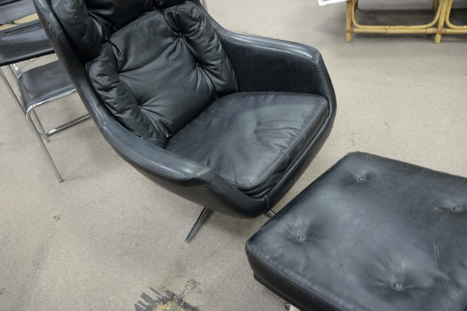 Lot 457: Mid-Century group of six chrome and black leather chairs along with black leather chair and ottoman.