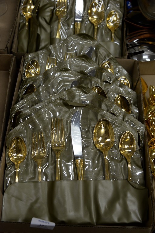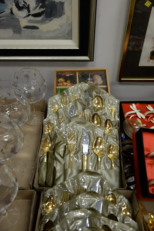 Lot 457: Six box lots with gold flatware set, horn napkin rings, and set of etched red wine stems.