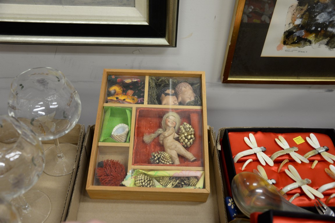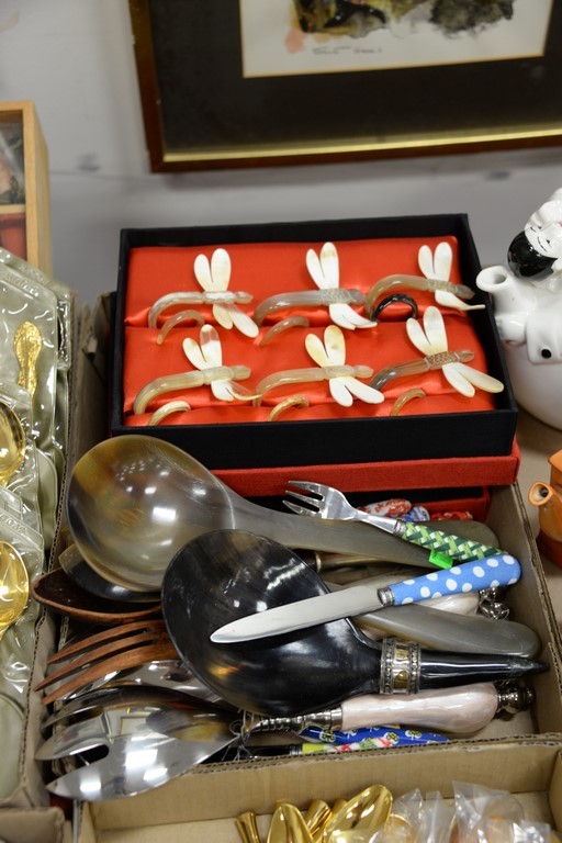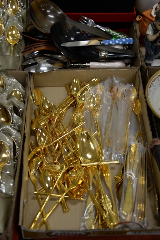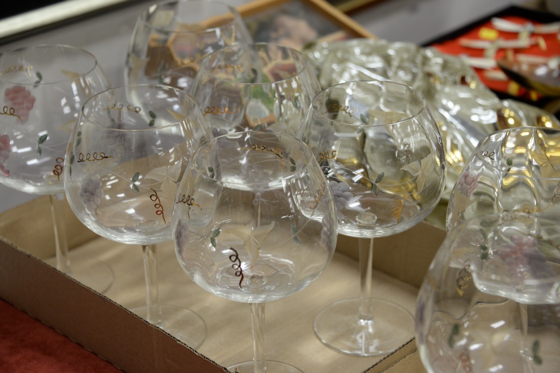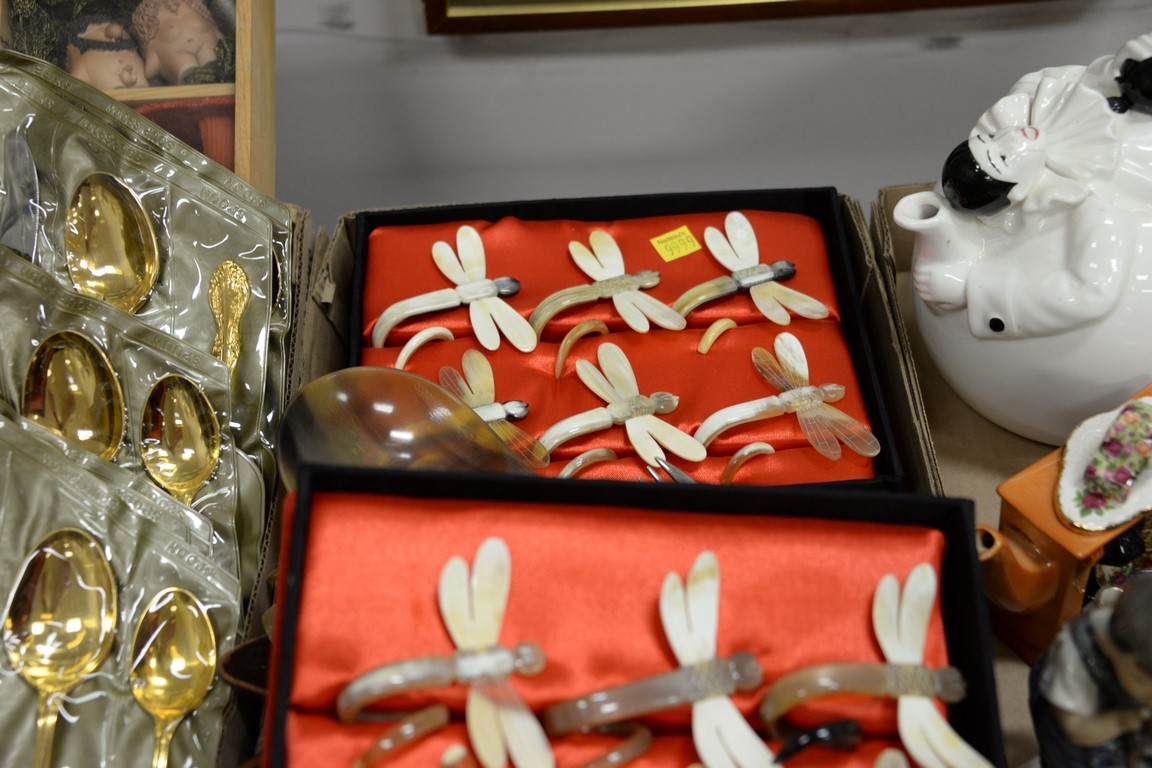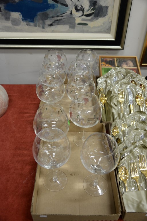 Six box lots with gold flatware set, horn napkin rings, and set of etched red wine stems.