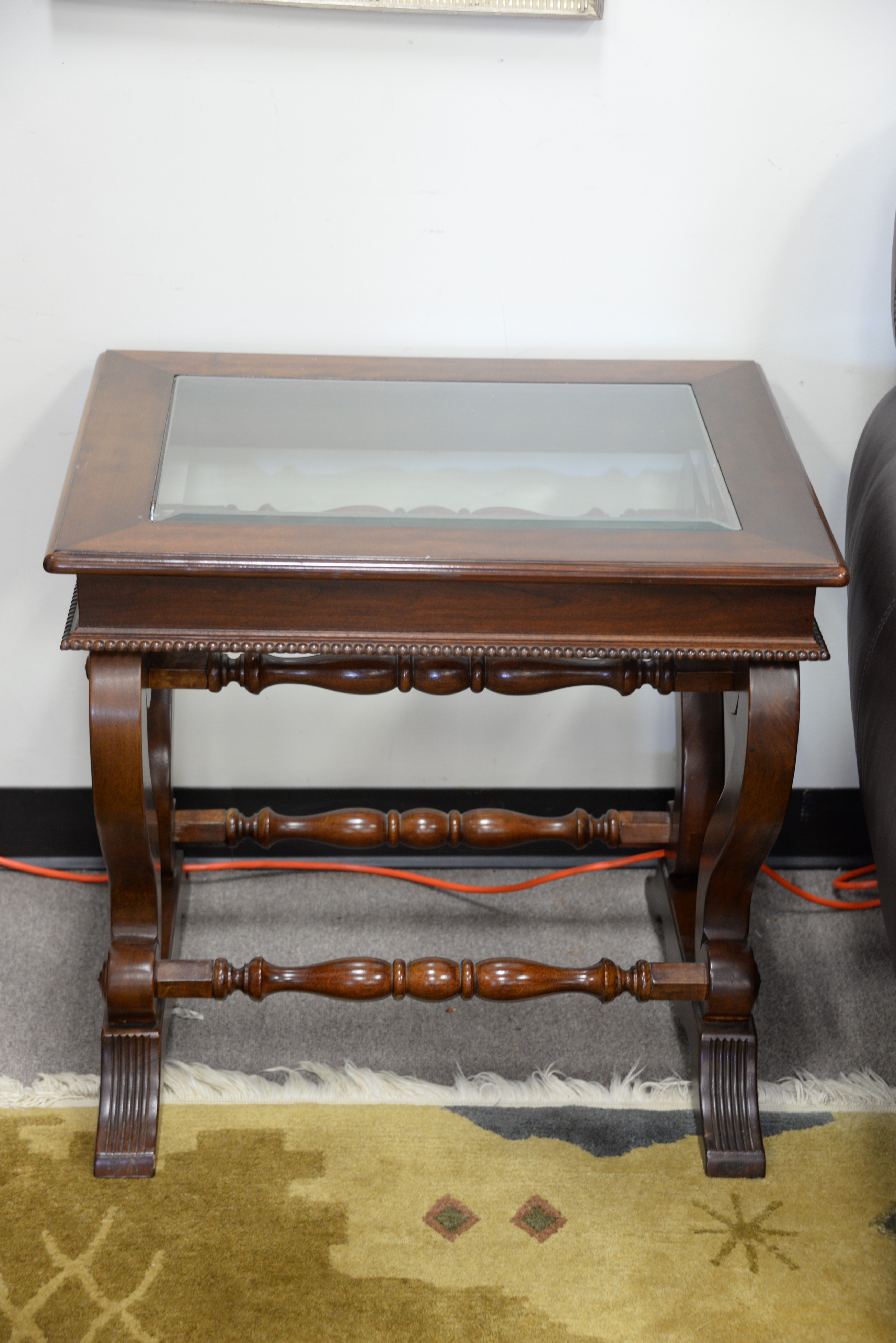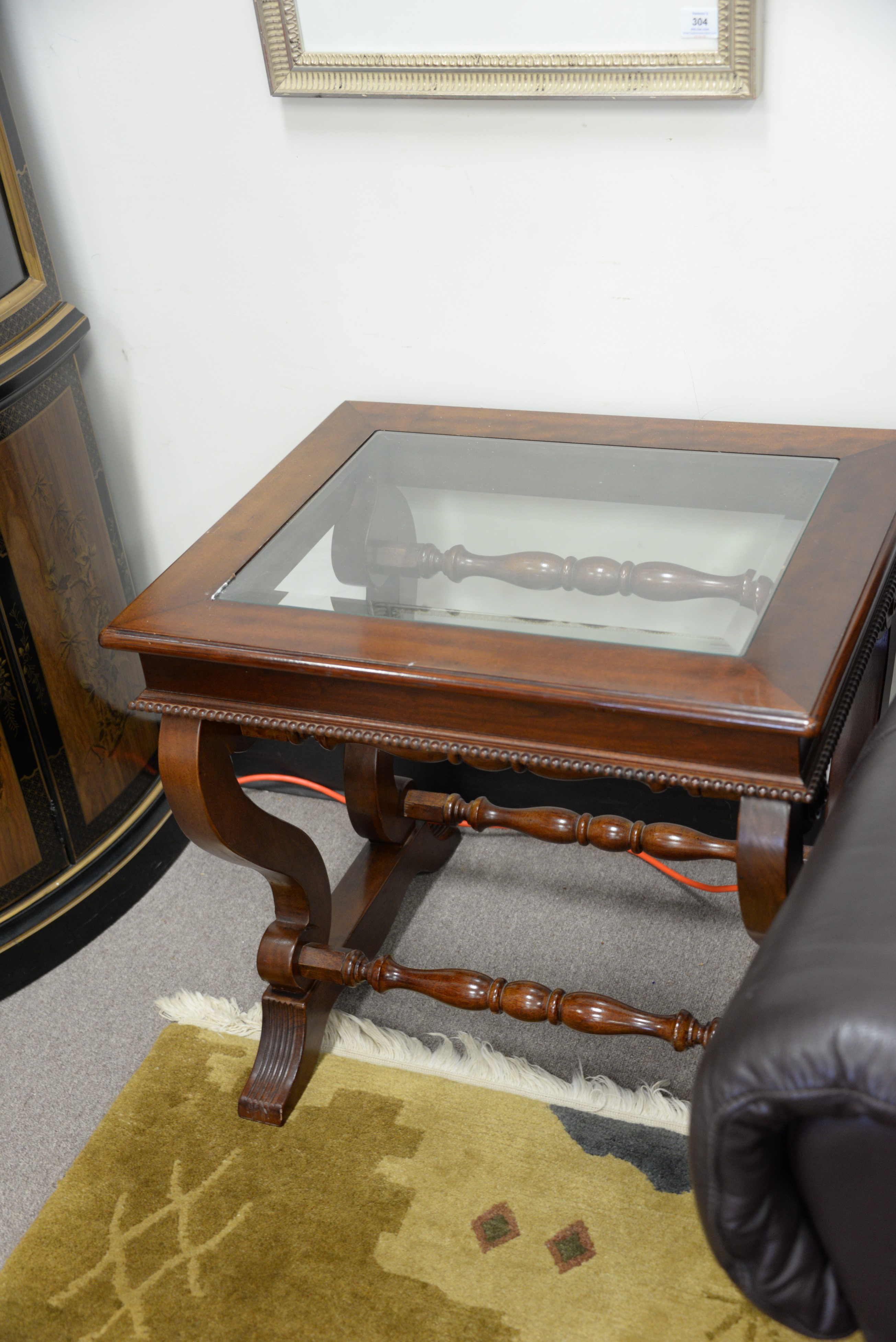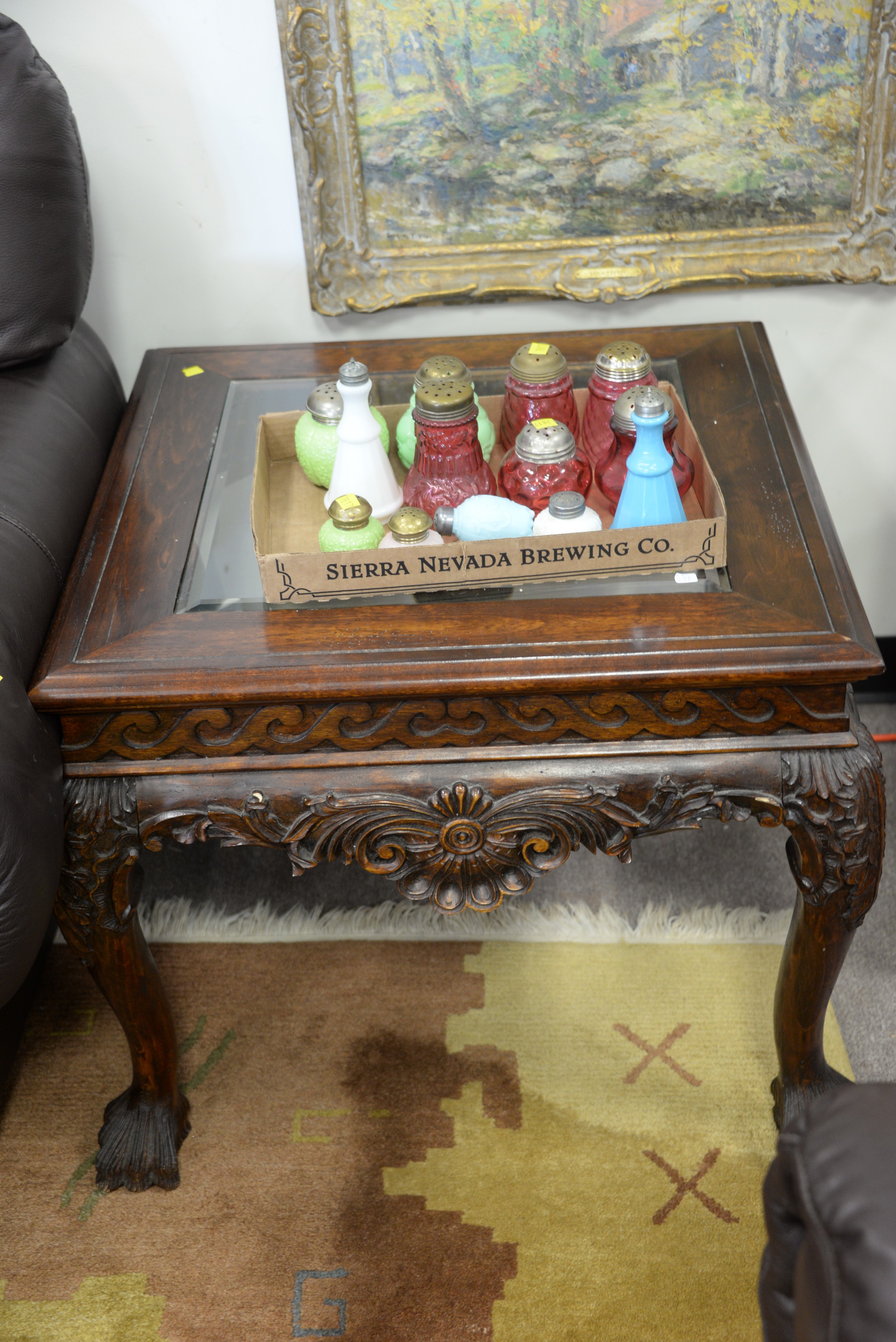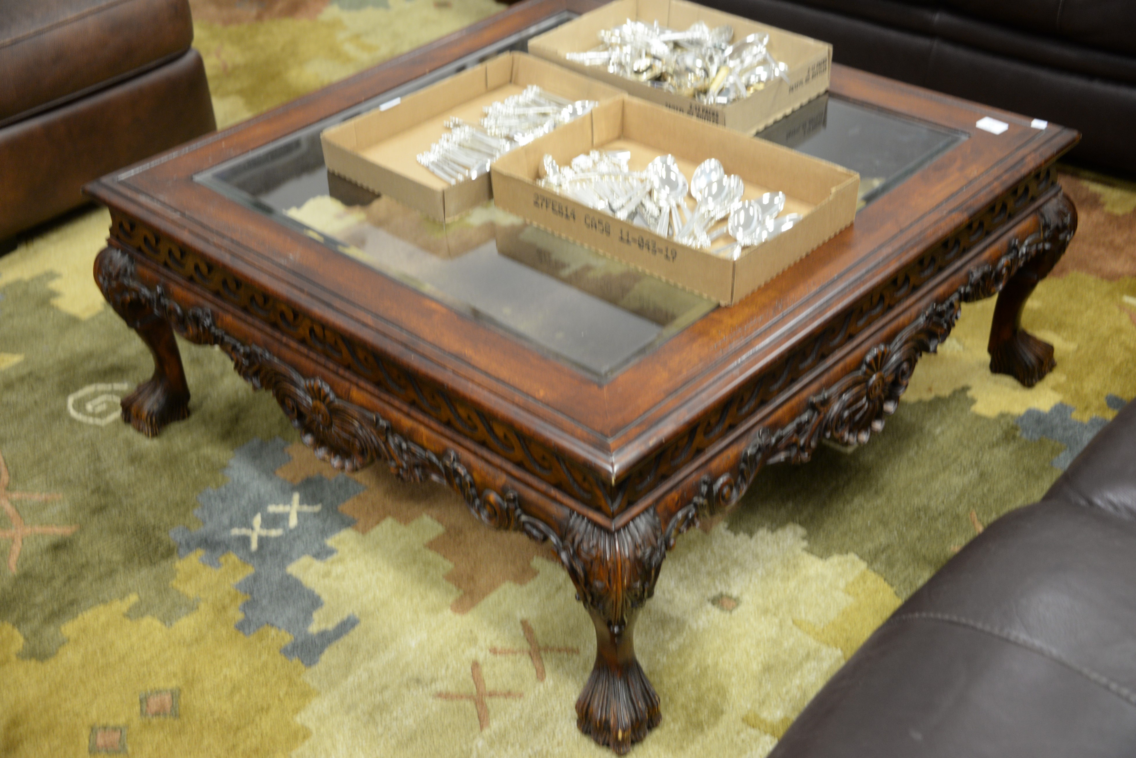 Three contemporary glass top tables, two with paw feet. ht. 17 in. top: 40 x 40.
