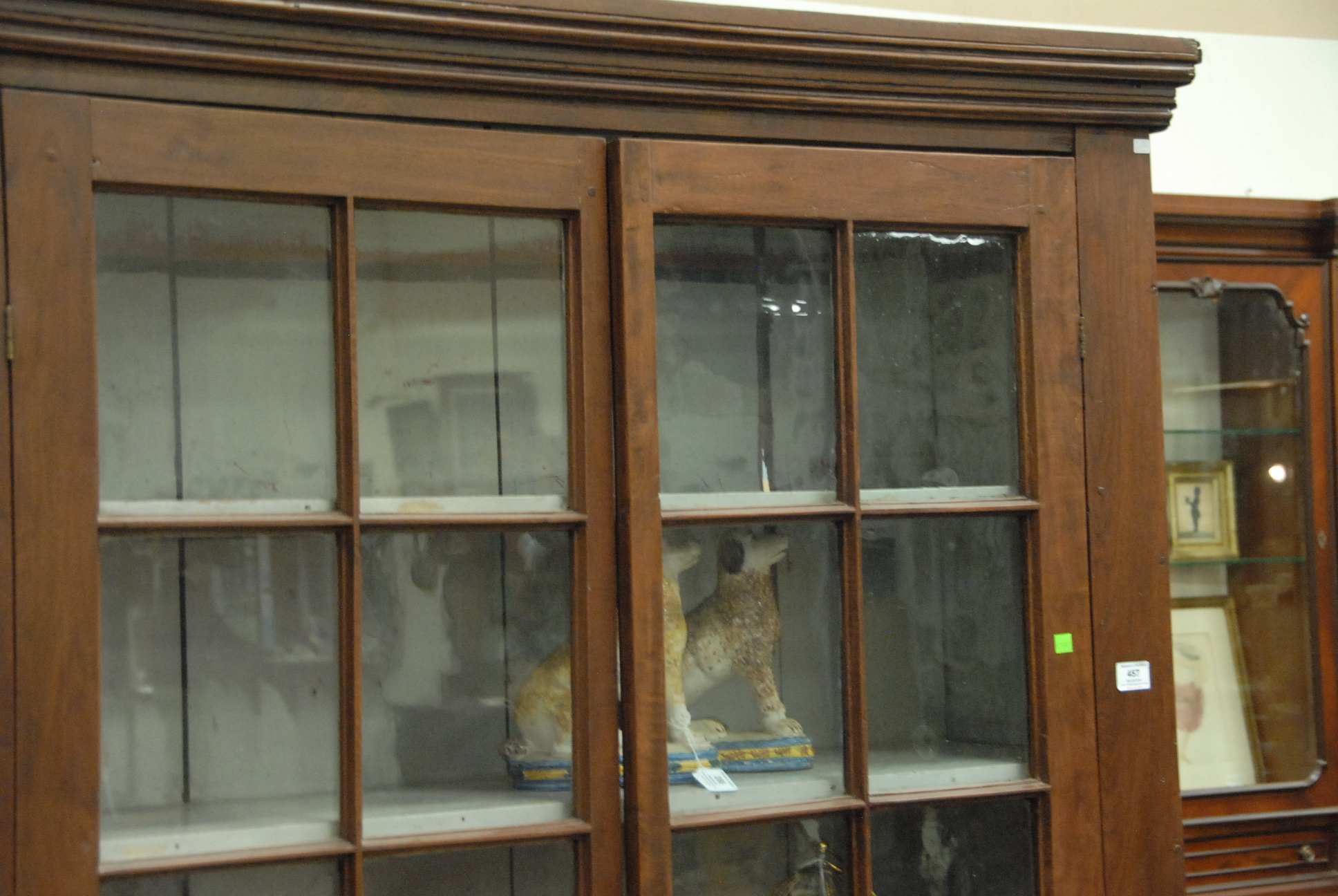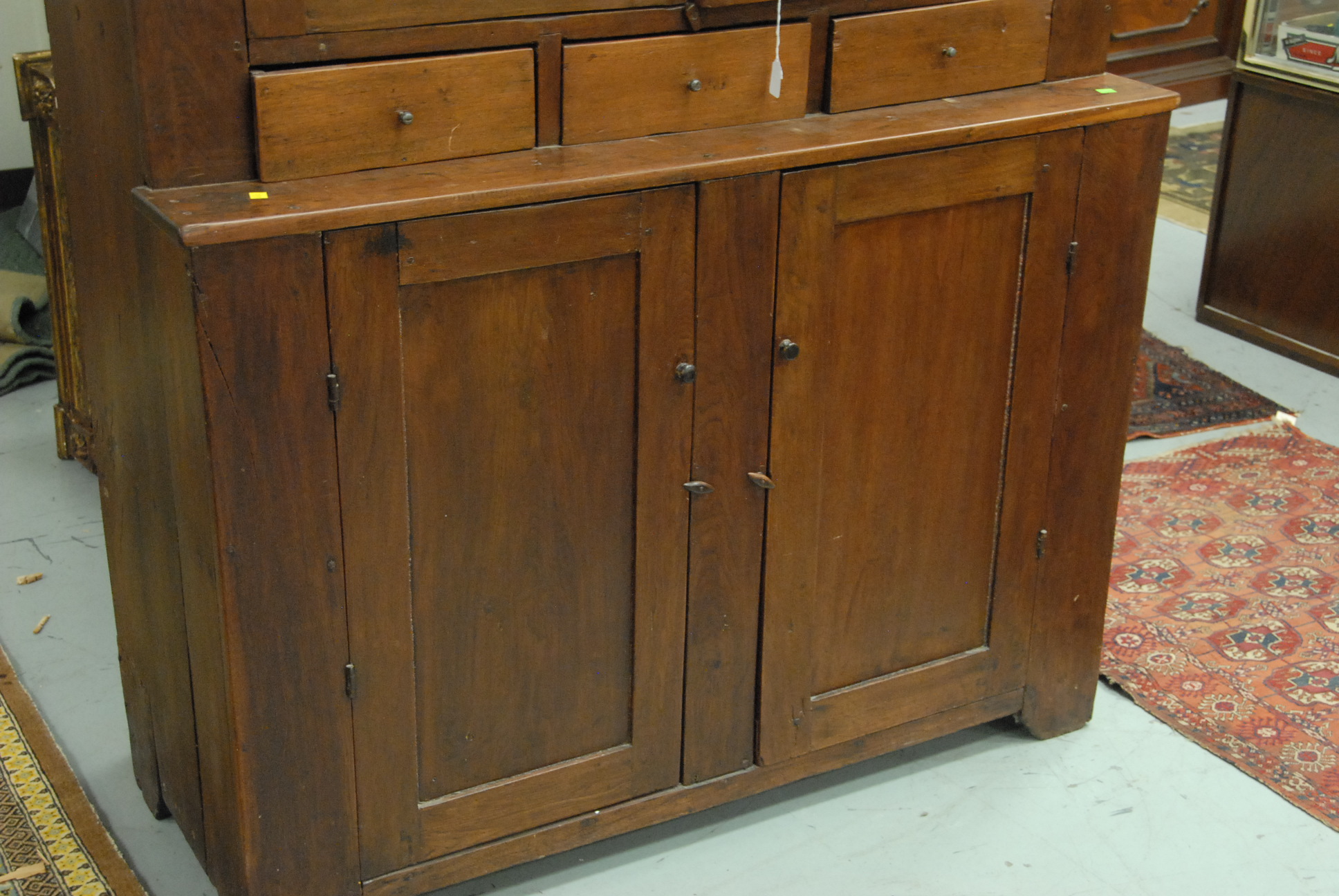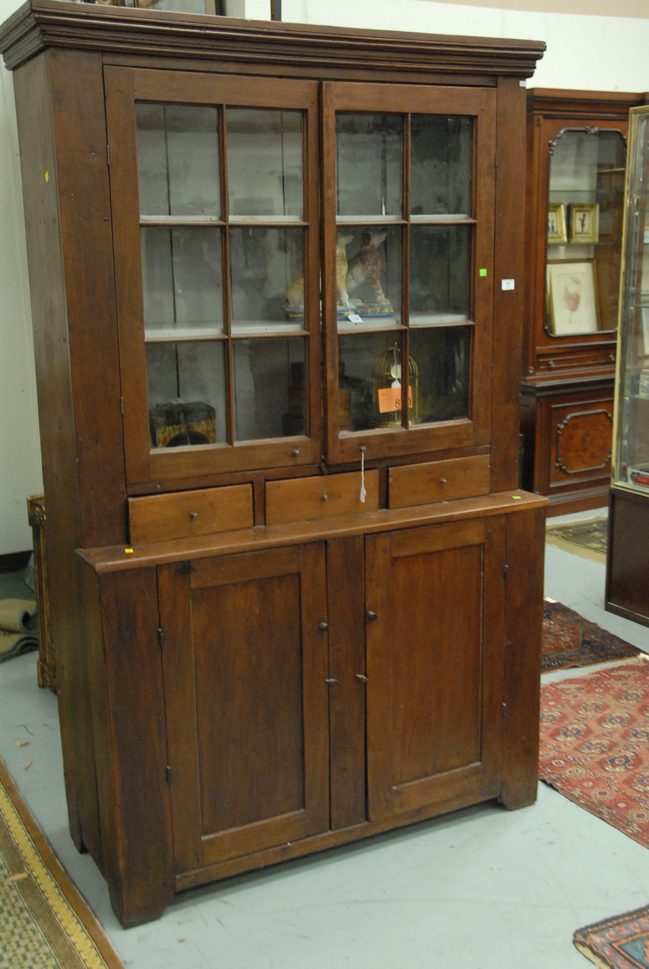 Lot 457: Walnut cupboard, one piece with cornice molded top over two glazed doors over three short drawers over two paneled doors on bracket feet. ht. 82in. wd. 49in.