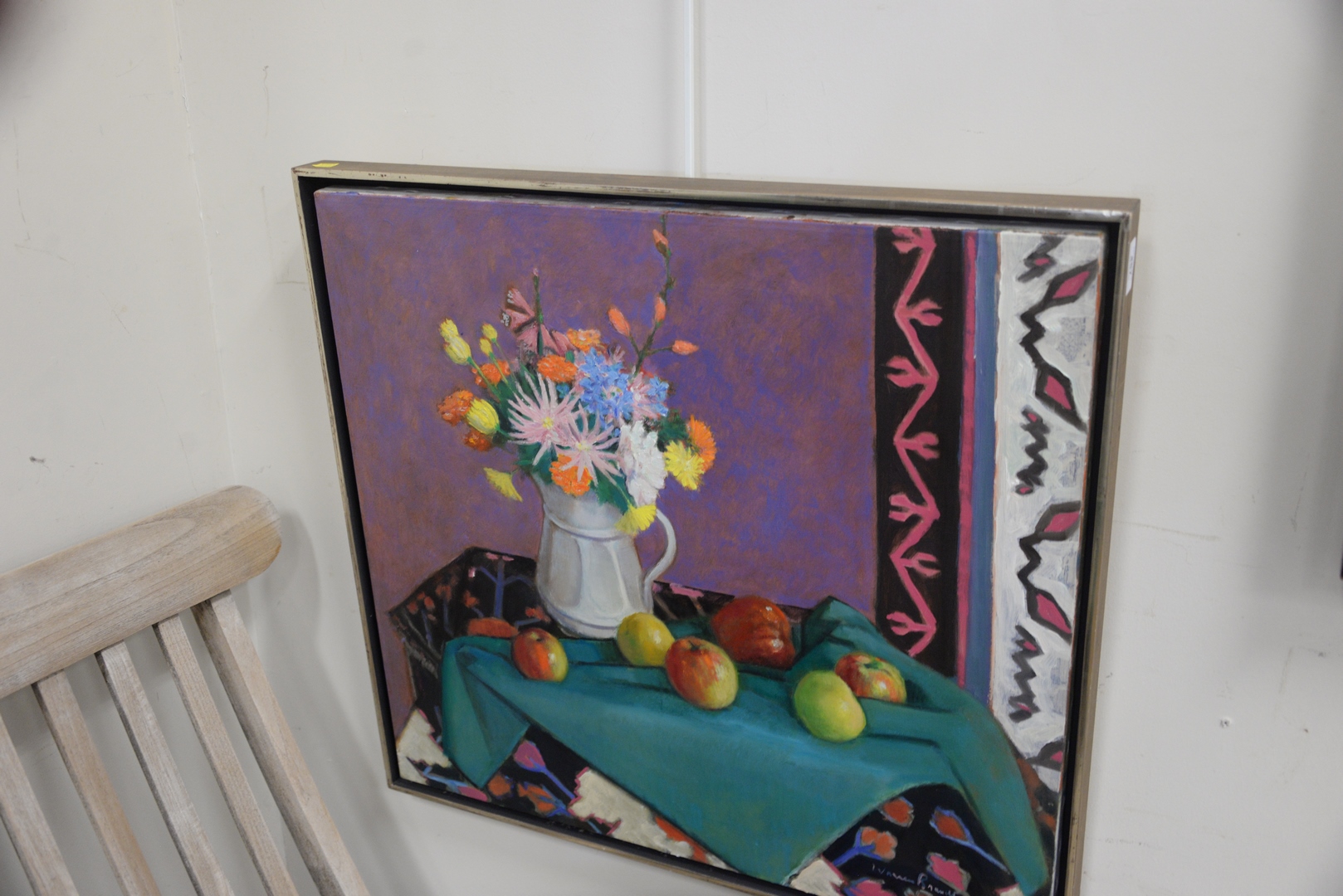 Lot 457: Warren Brandt (American, 1918-2002), November Flowers, 1972, oil on canvas, signed lower right “Warren Brandt”, 26″ x 28″.