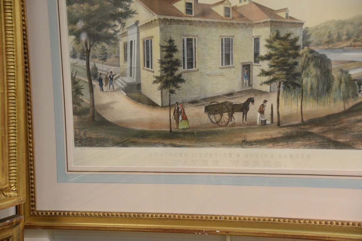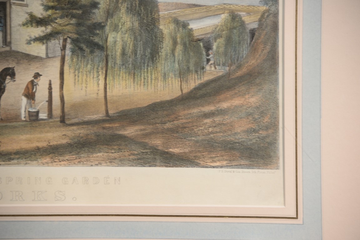 After Thomas M. Scott, colored lithograph, Northern Liberties & Spring Garden Waterworks, marked lower left: Drawn From Nature by Thos. M. Scott, marked lower right: P.S. Duval & Co’s Steamlith Press Philad, 19 x 25 1/2. Provenance: Property from Credit Suisse’s Americana Collection