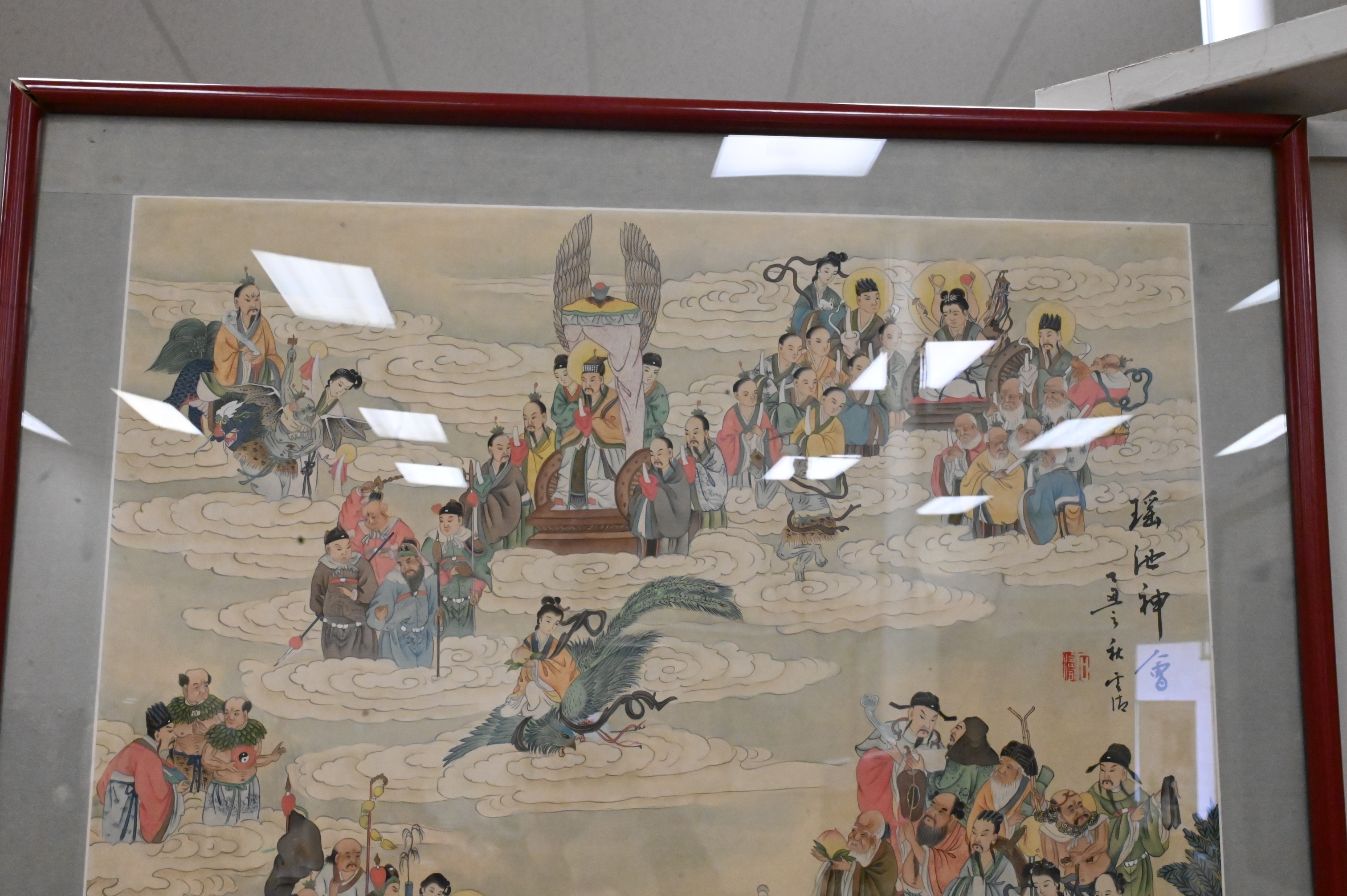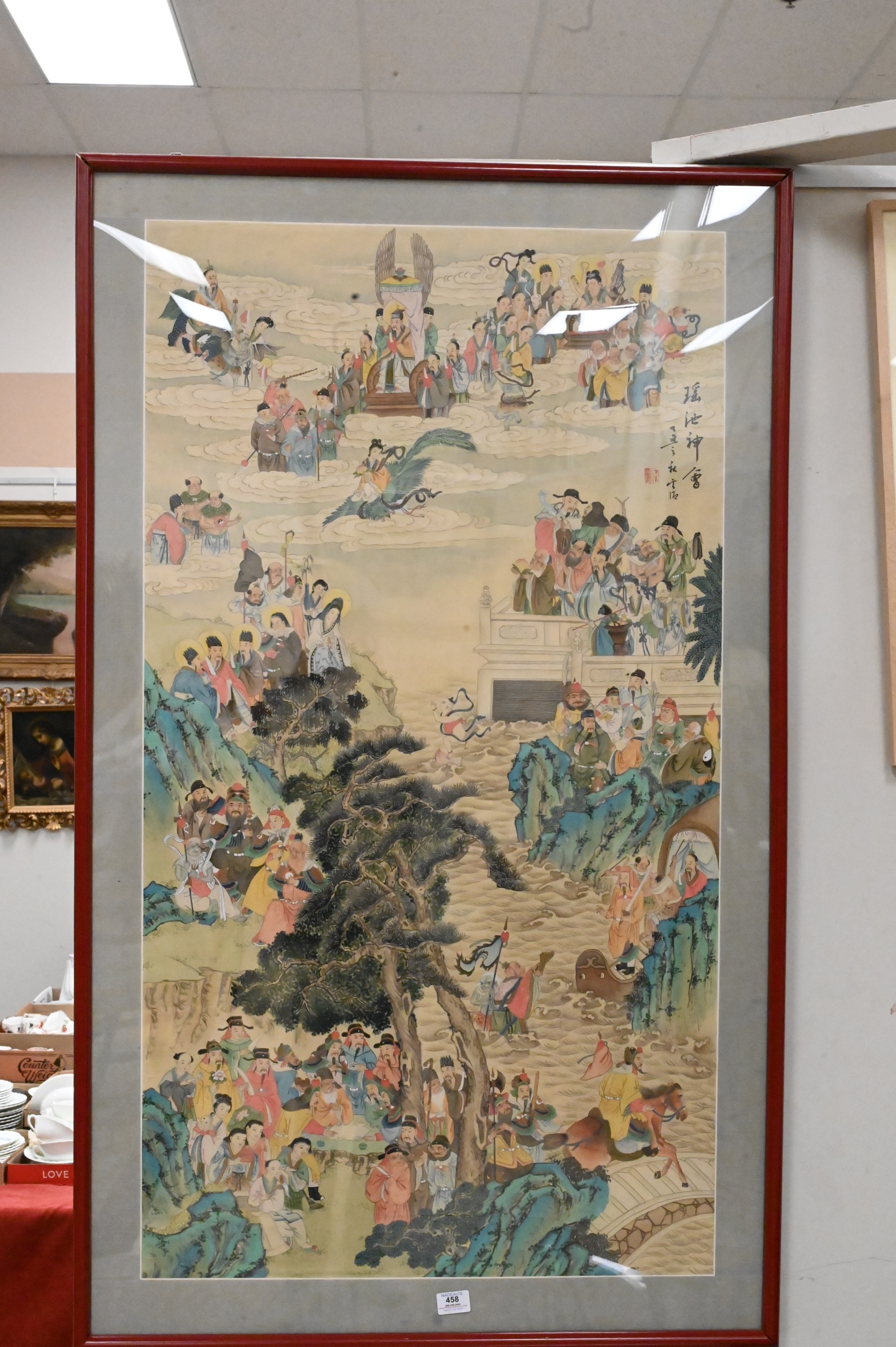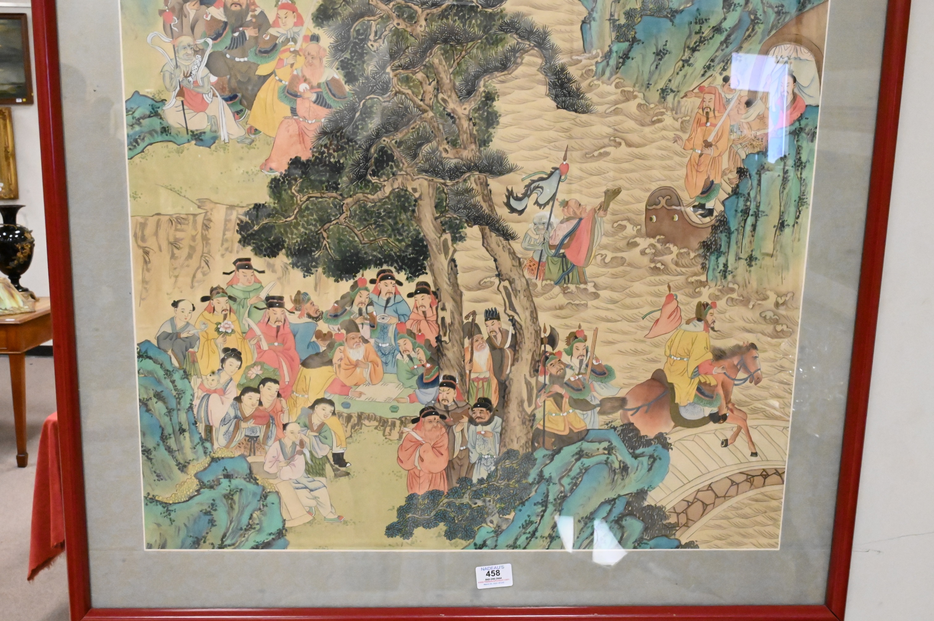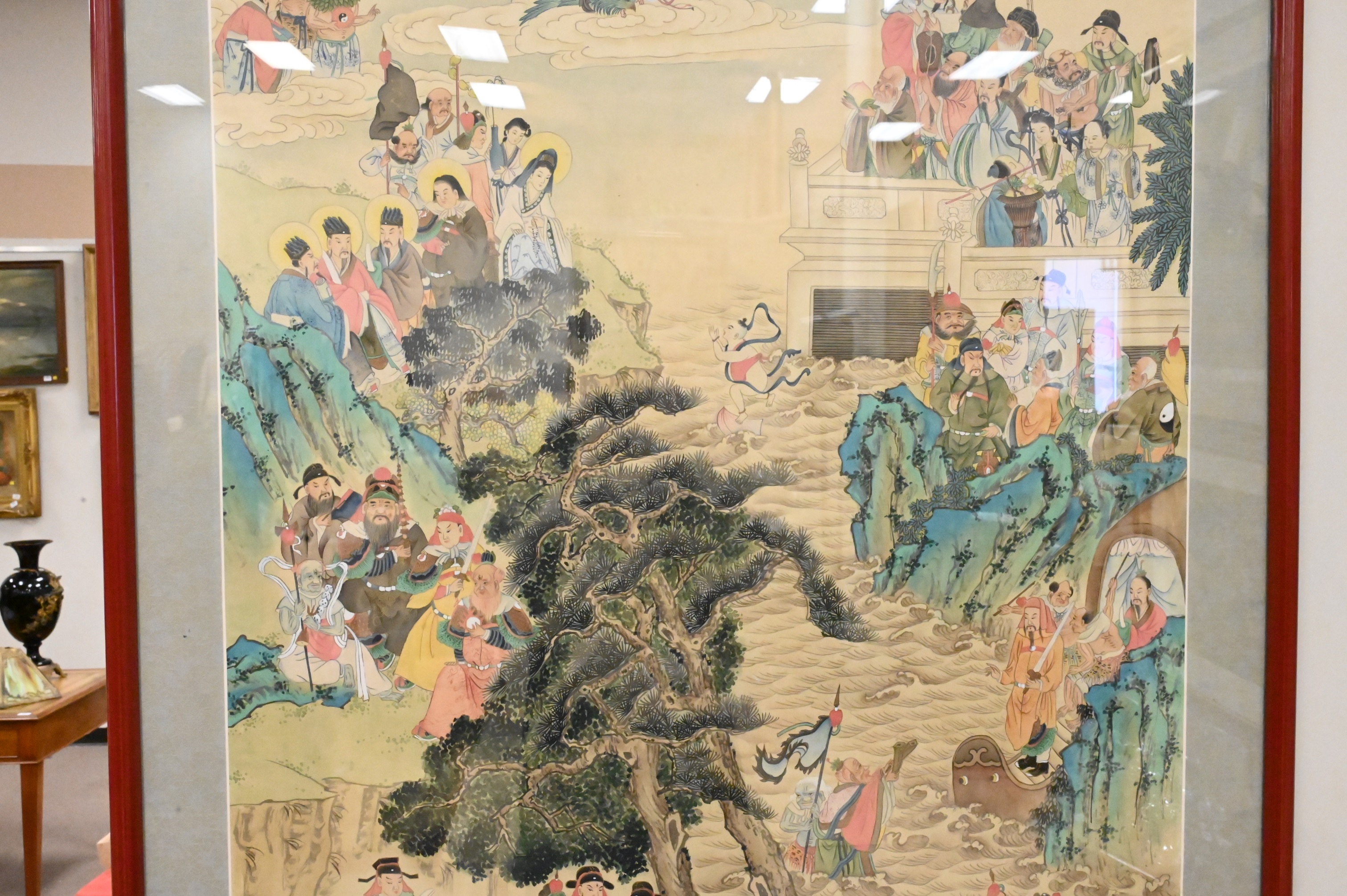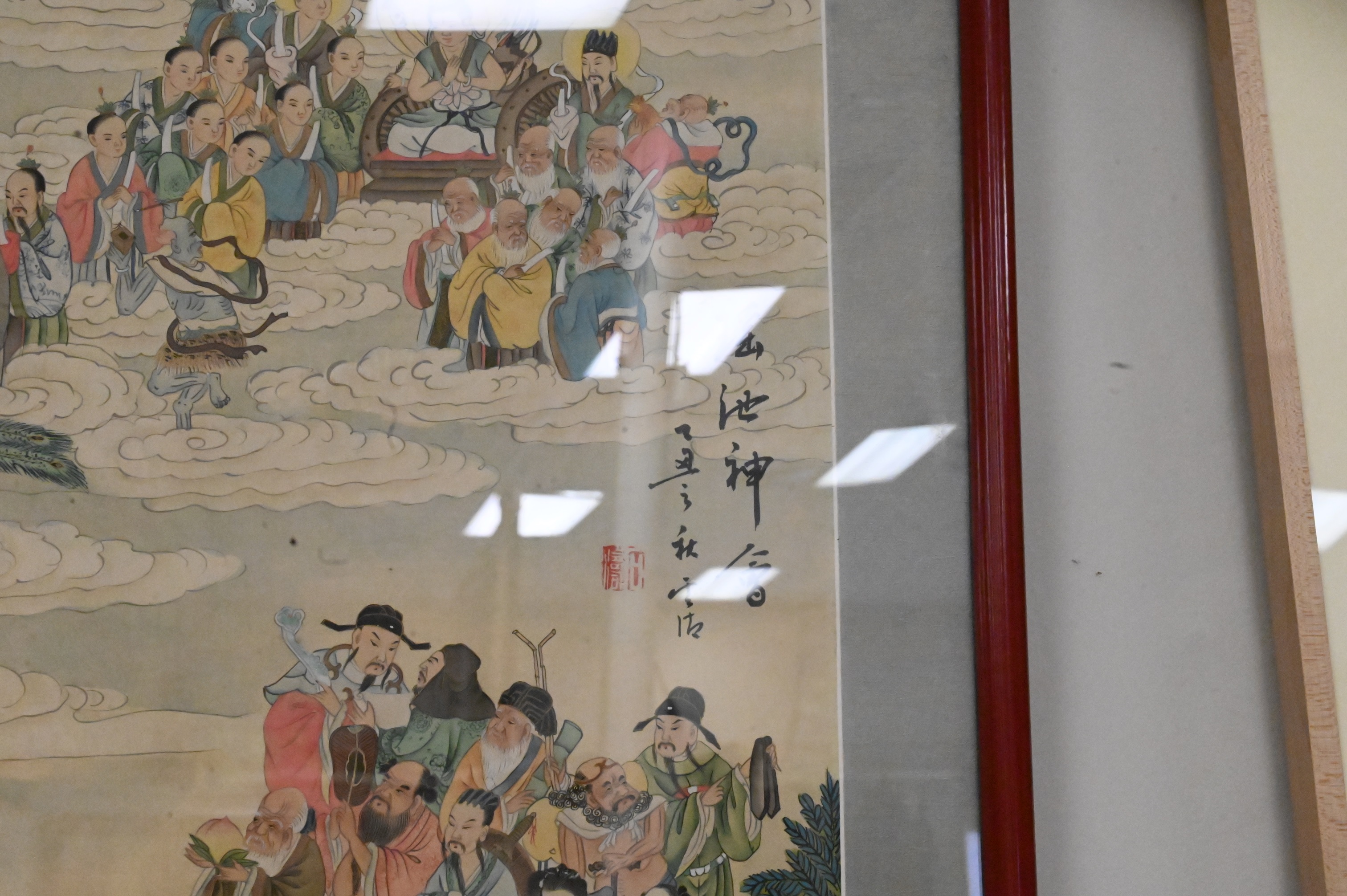 Chinese Ancestral/Mythological Watercolor on Silk, professionally framed and matted, having red seal, signed top right, image size 48″ x 26″.
