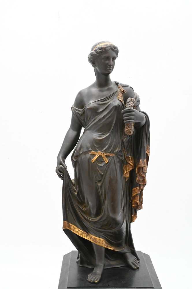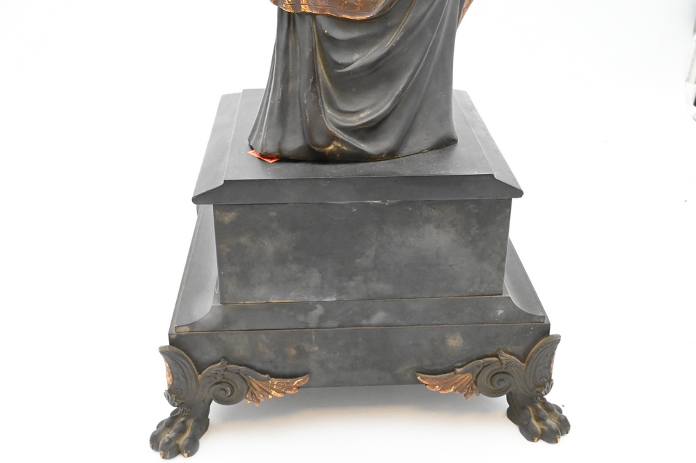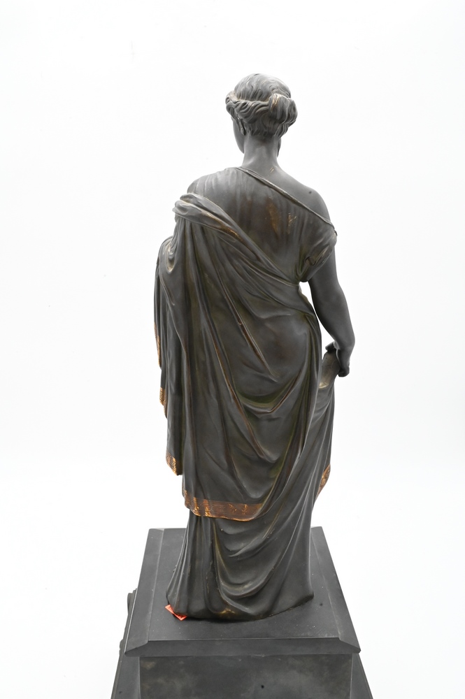Lot 458: Classical Figure of a Woman, wearing a robe with gilt edge, belt and wreath, standing on a square slate base on bronze claw feet, height 22 1/2 inches.