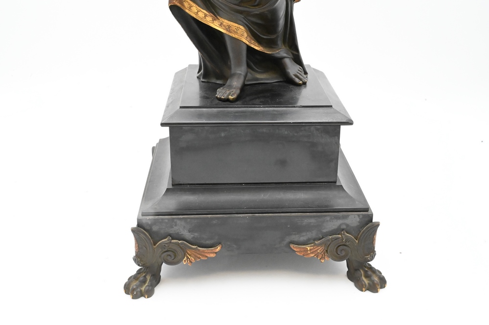 Classical Figure of a Woman, wearing a robe with gilt edge, belt and wreath, standing on a square slate base on bronze claw feet, height 22 1/2 inches.