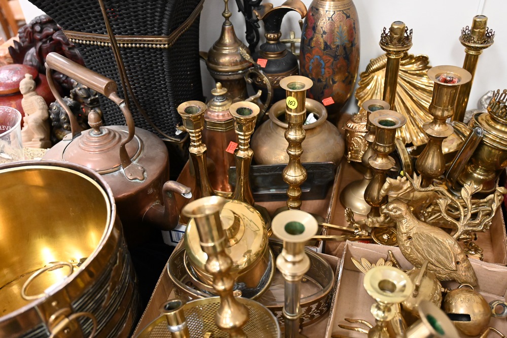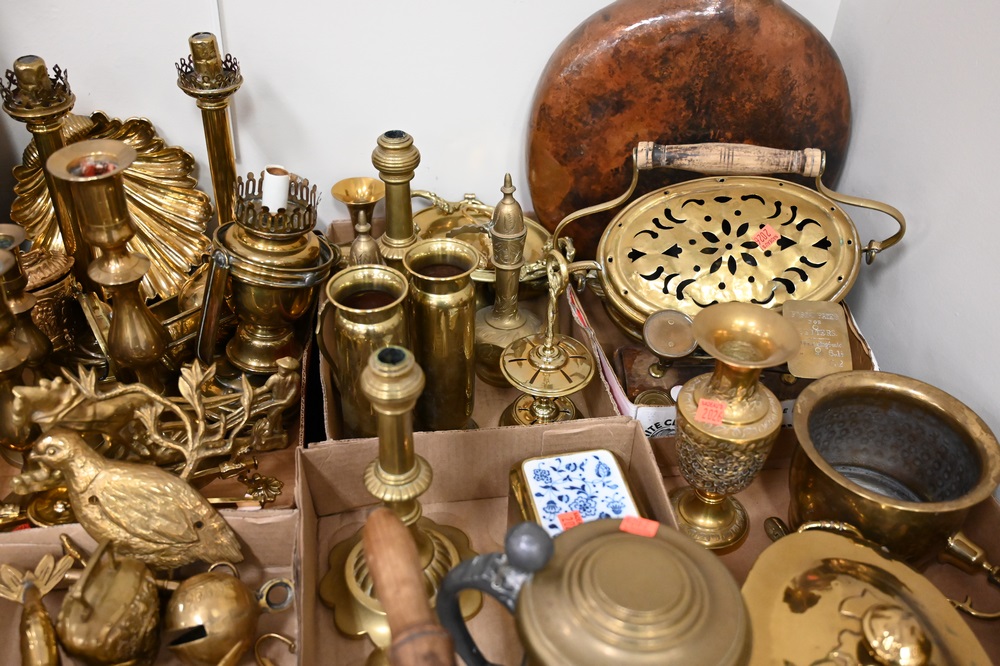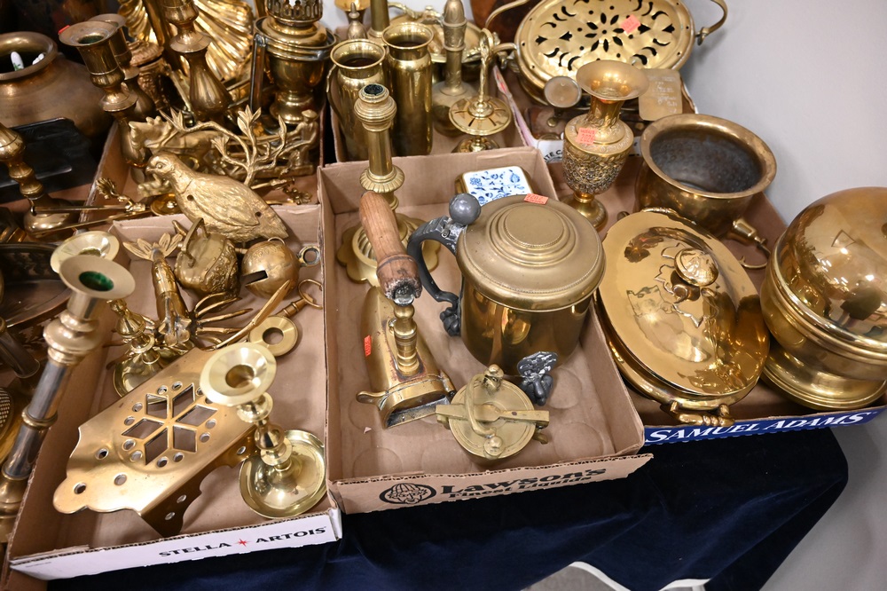 Lot 458: Eight Box Lots of Small Brass Items, to include a tray of brass candlesticks, covered tureens, several vases, a pair of table lamps, small easel, Jennings Brothers frame, 19th century French coal brass iron, brass lion door stop, along with many other items.