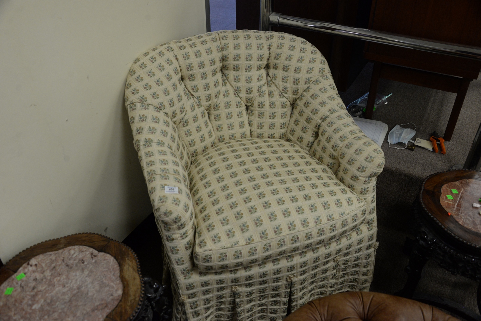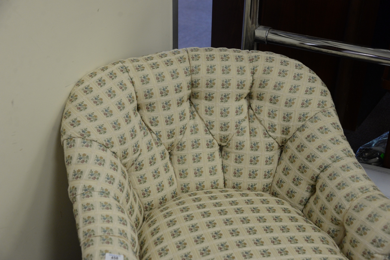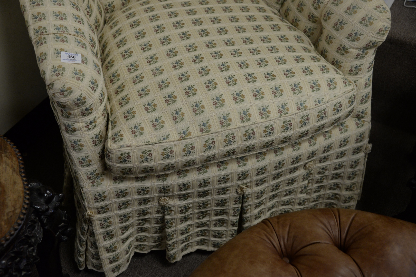 Lot 458: Fine Arts Furniture Custom Upholstered Club Chair, having tufted back and floral upholstery, height 31 inches, width 30 inches.