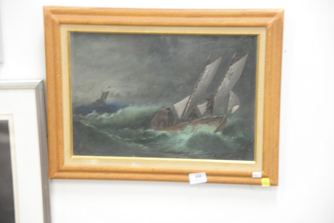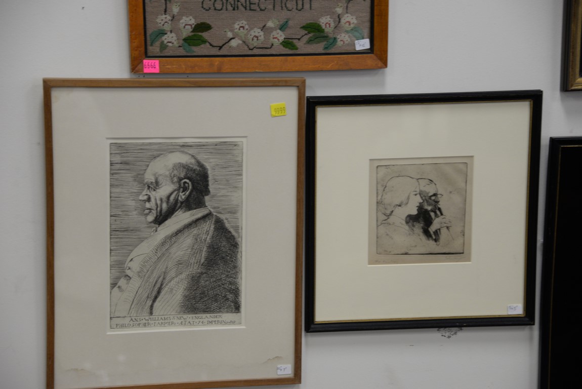 Lot 458: Five framed pieces to include two needleworks, primitive oil on board men on skiff, and two etchings.
