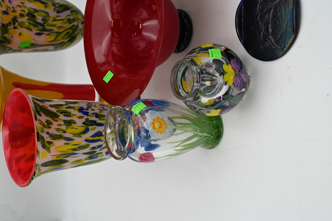 Group of Art Glass, to include Siddy Langley bottle vase, Carlsen compote, 5 tulip form vases, 3 paperweight art glass vases, tallest vase height 12 inches. Provenance: Estate of Peter Tillou, Litchfield, Connecticut.