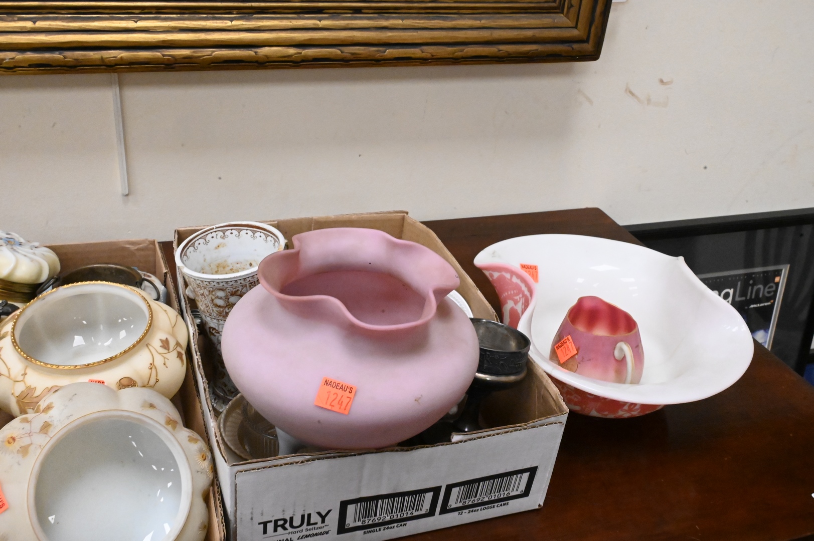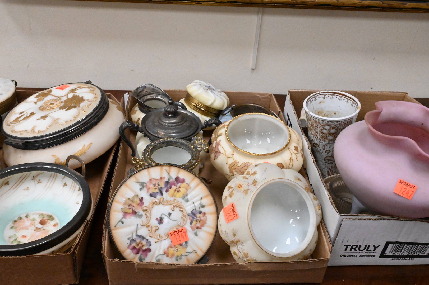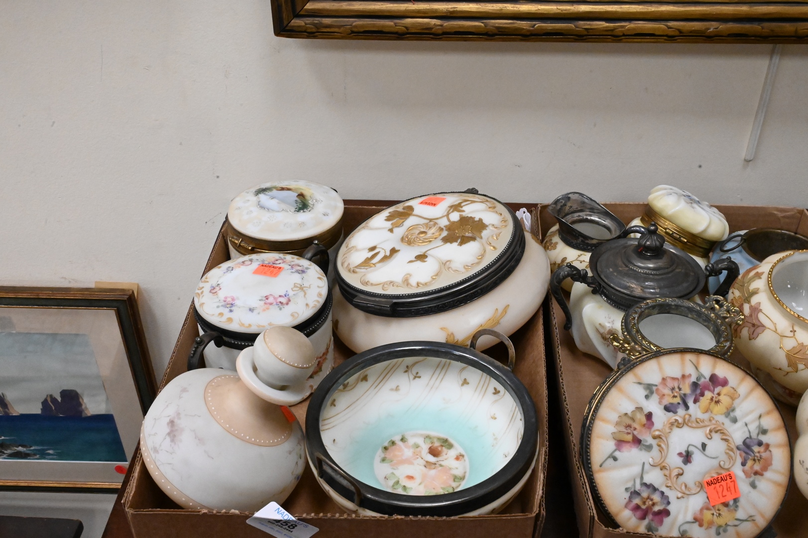 Three Box Lots of Pairpoint and Mt. Washington Glass Boxes/Containers. Provenance: From the Estate of Elwyn W. Lemon, Enfield, Connecticut.