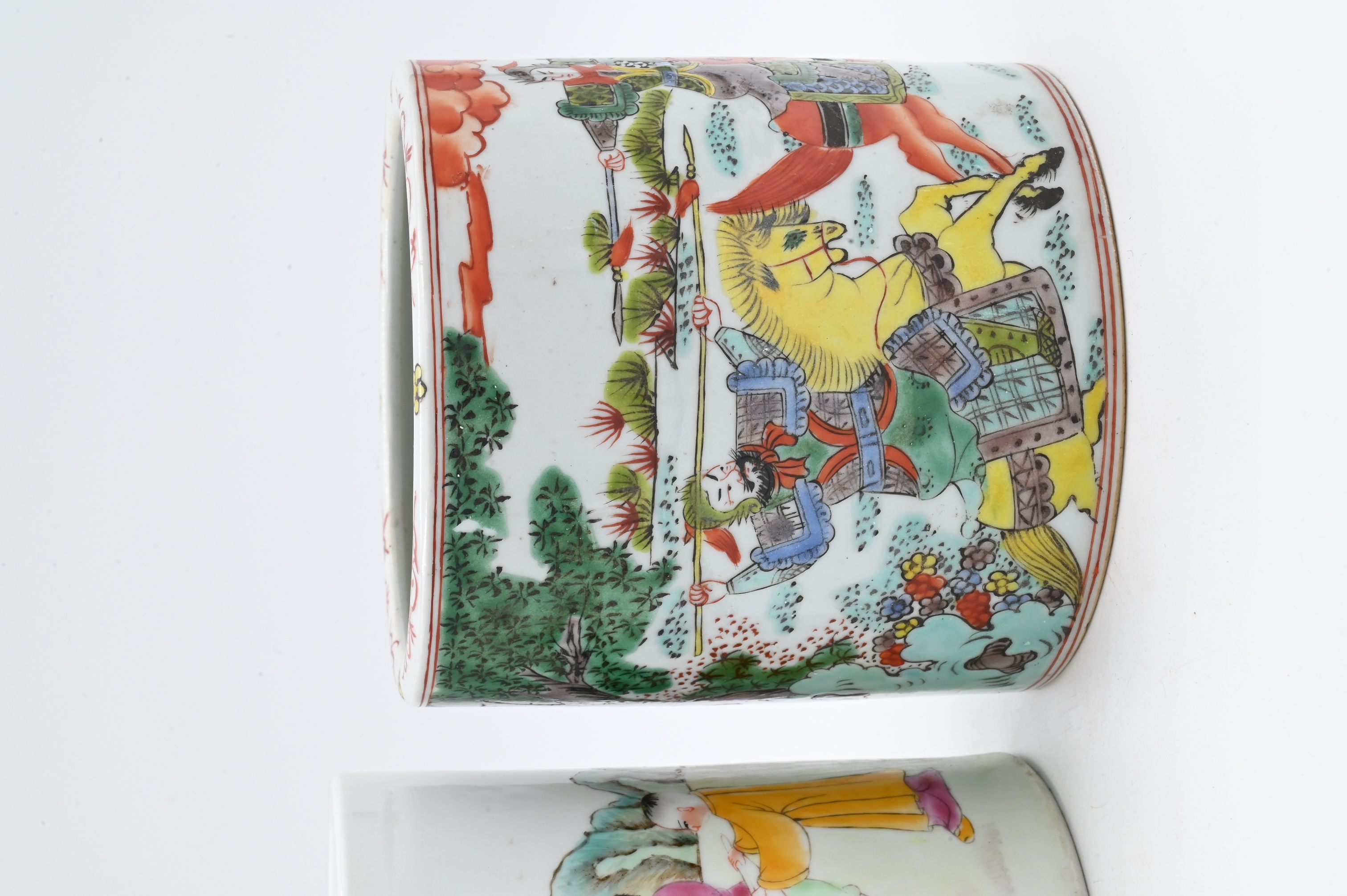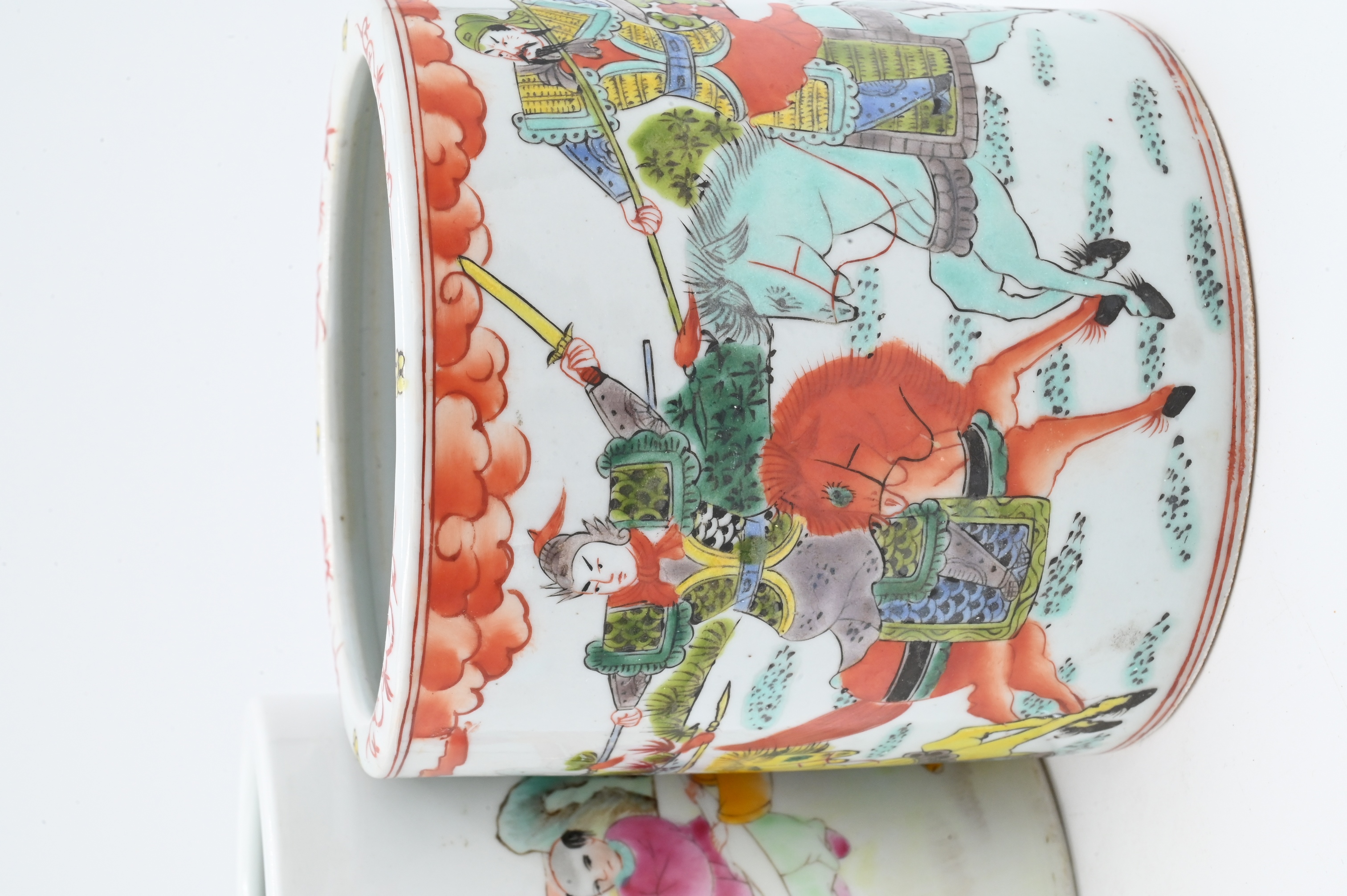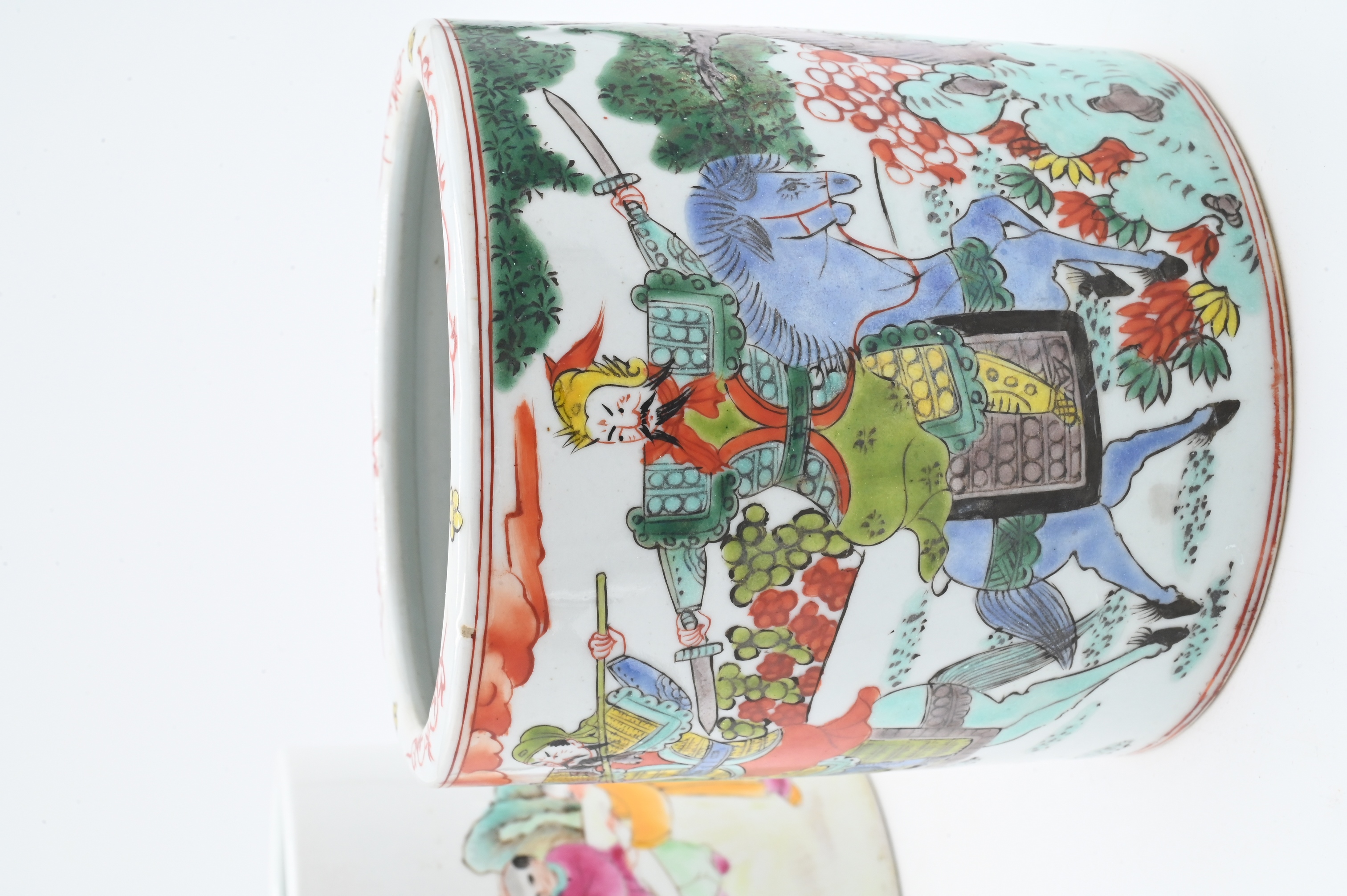 one Wucai style having warriors on horseback scene, red character seal to base, 19th century, height 5 1/4 inches