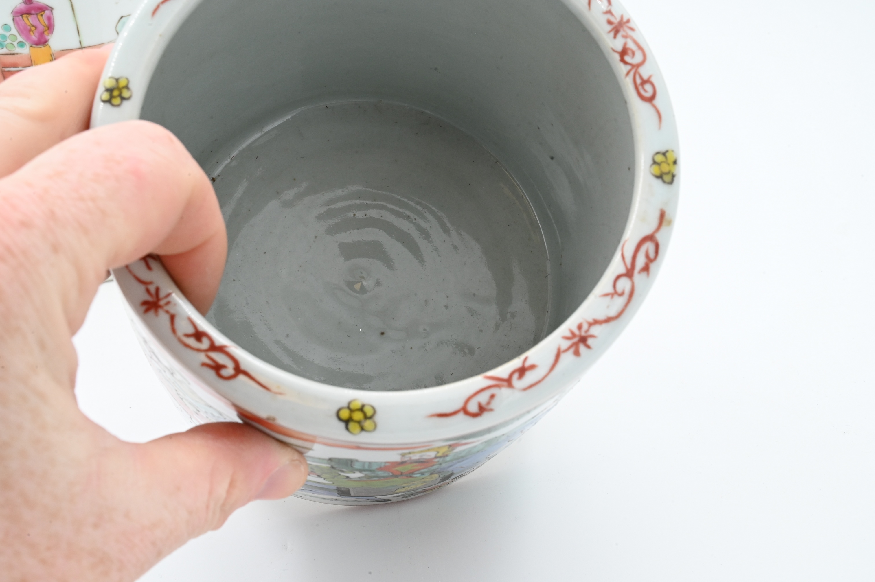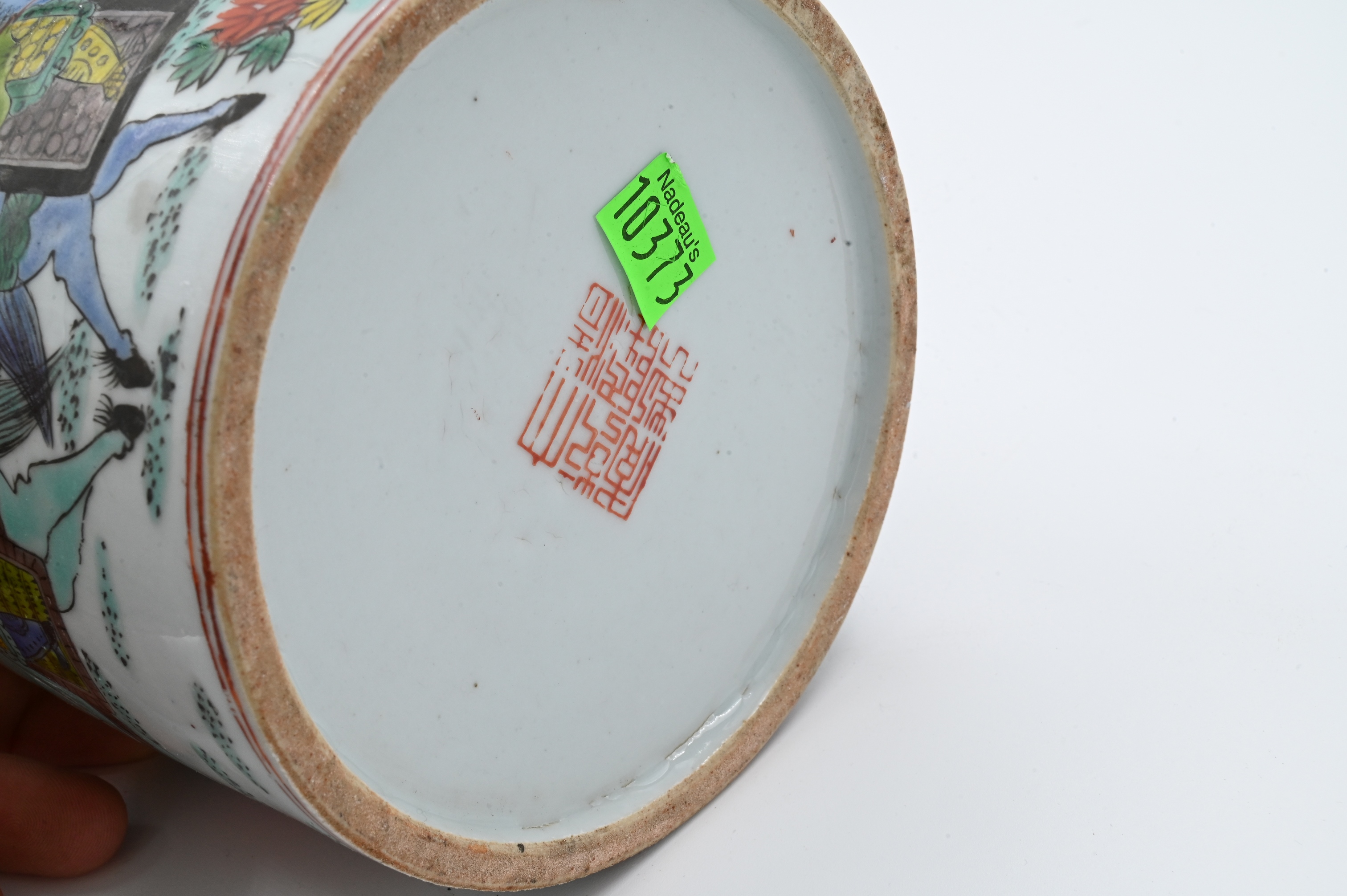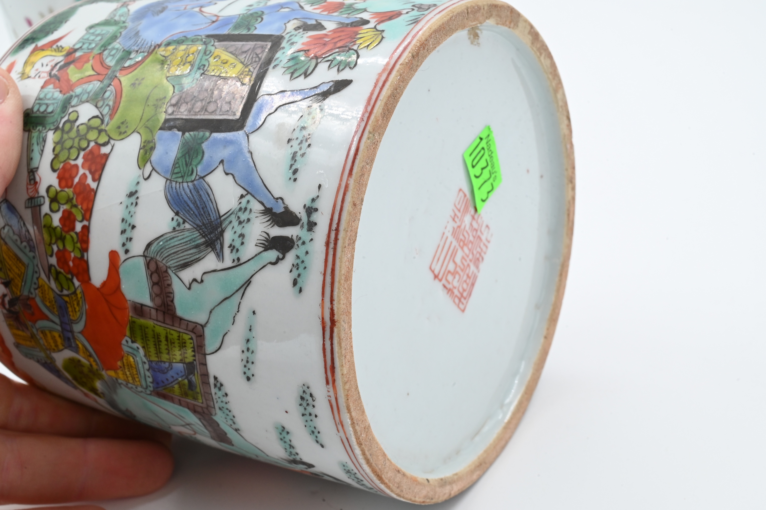 one Wucai style having warriors on horseback scene, red character seal to base, 19th century, height 5 1/4 inches