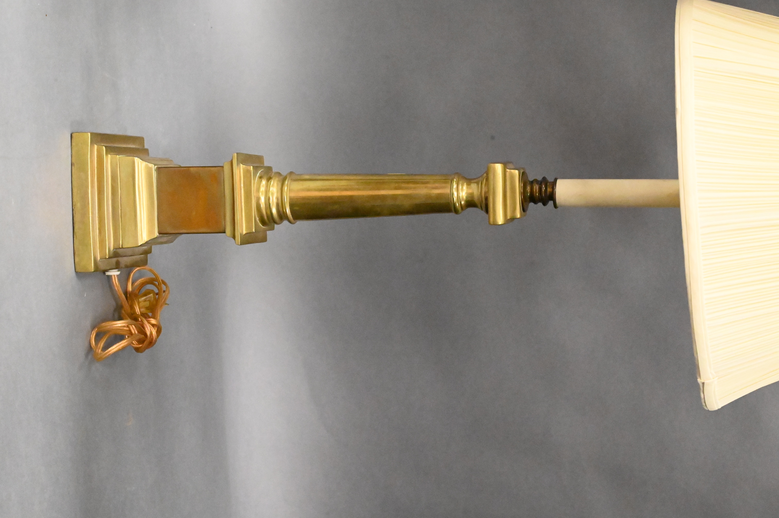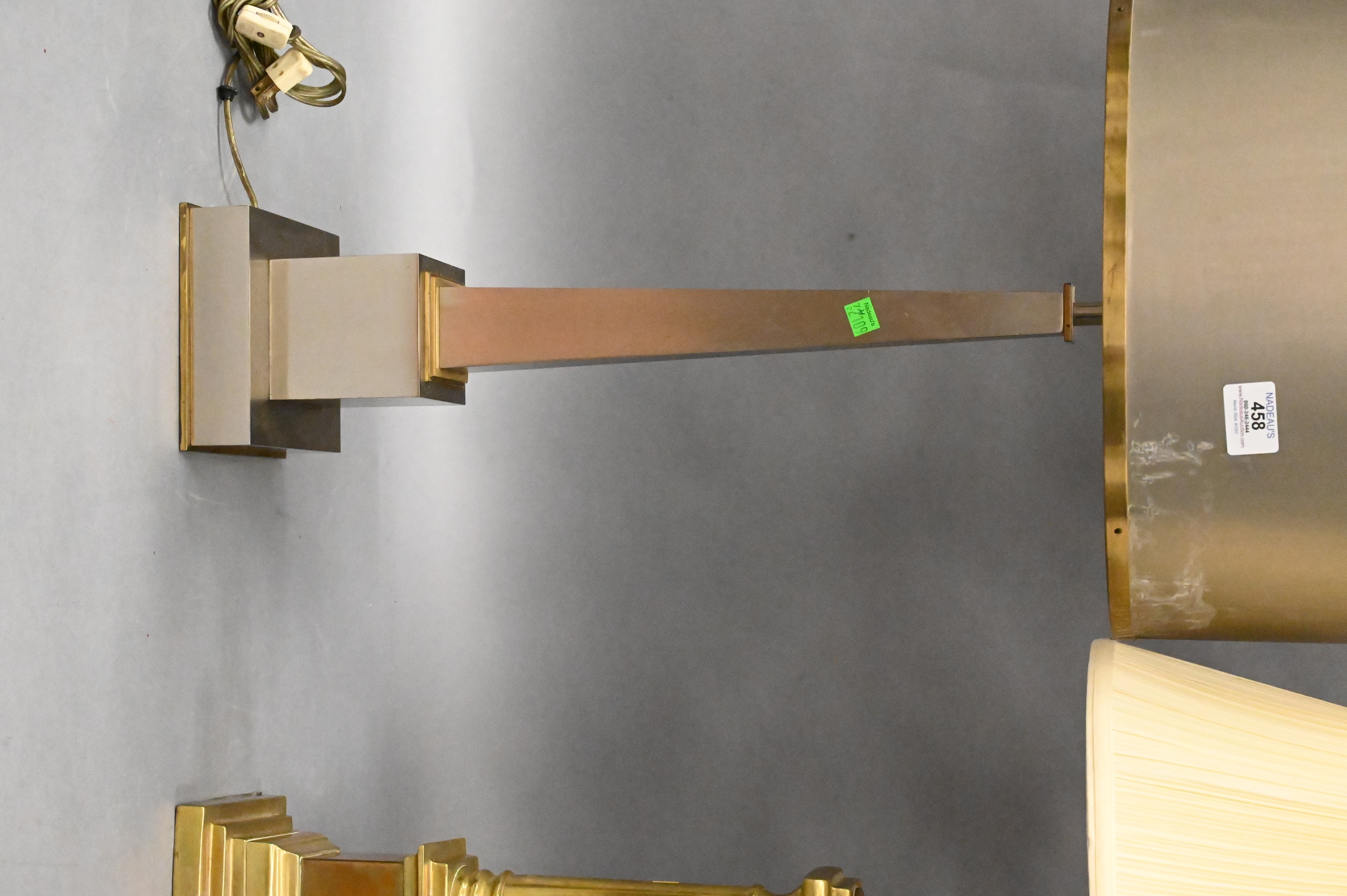 to include a pewter and brass obelisk form table lamp with pewter and brass drum shade 19th or 20th century, along with a brass column lamp