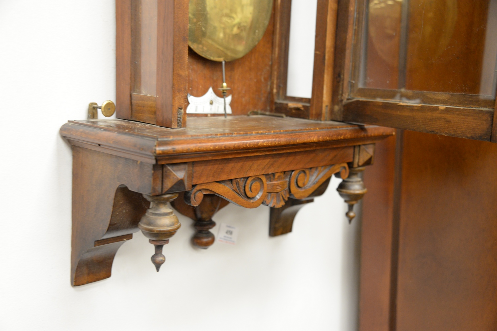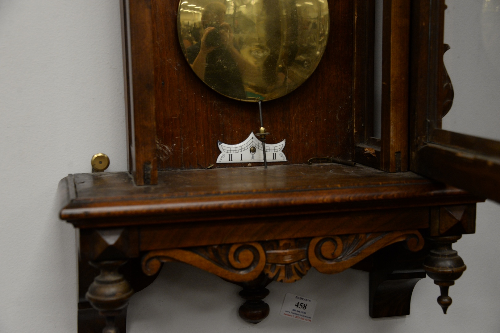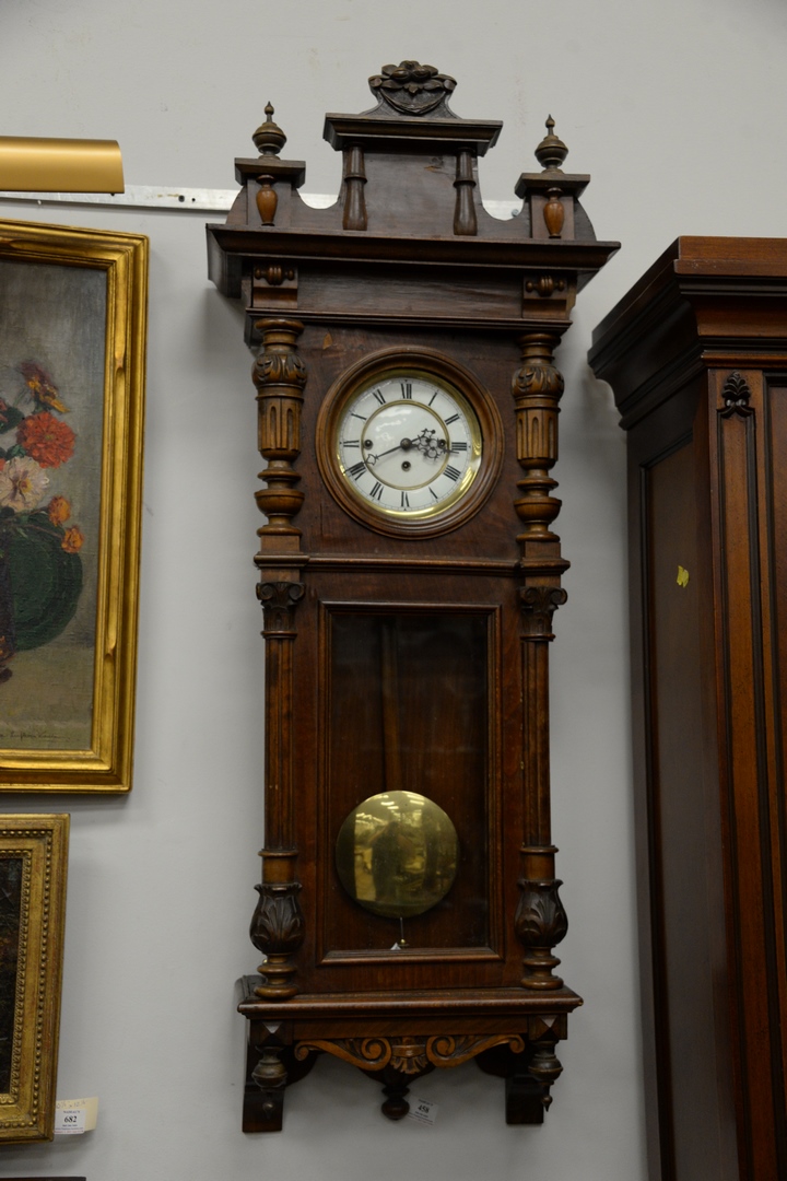 Lot 458: Vienna Regulator Clock walnut case with enameled face having triple brass weights height 49 inches
