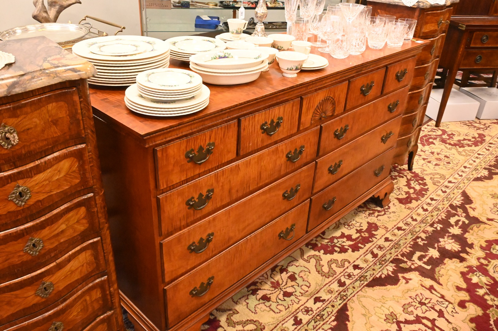 Benchmade Tiger Maple Double Dresser, having five short drawers over long drawers, height 35 inches, top 20″ x 61″.