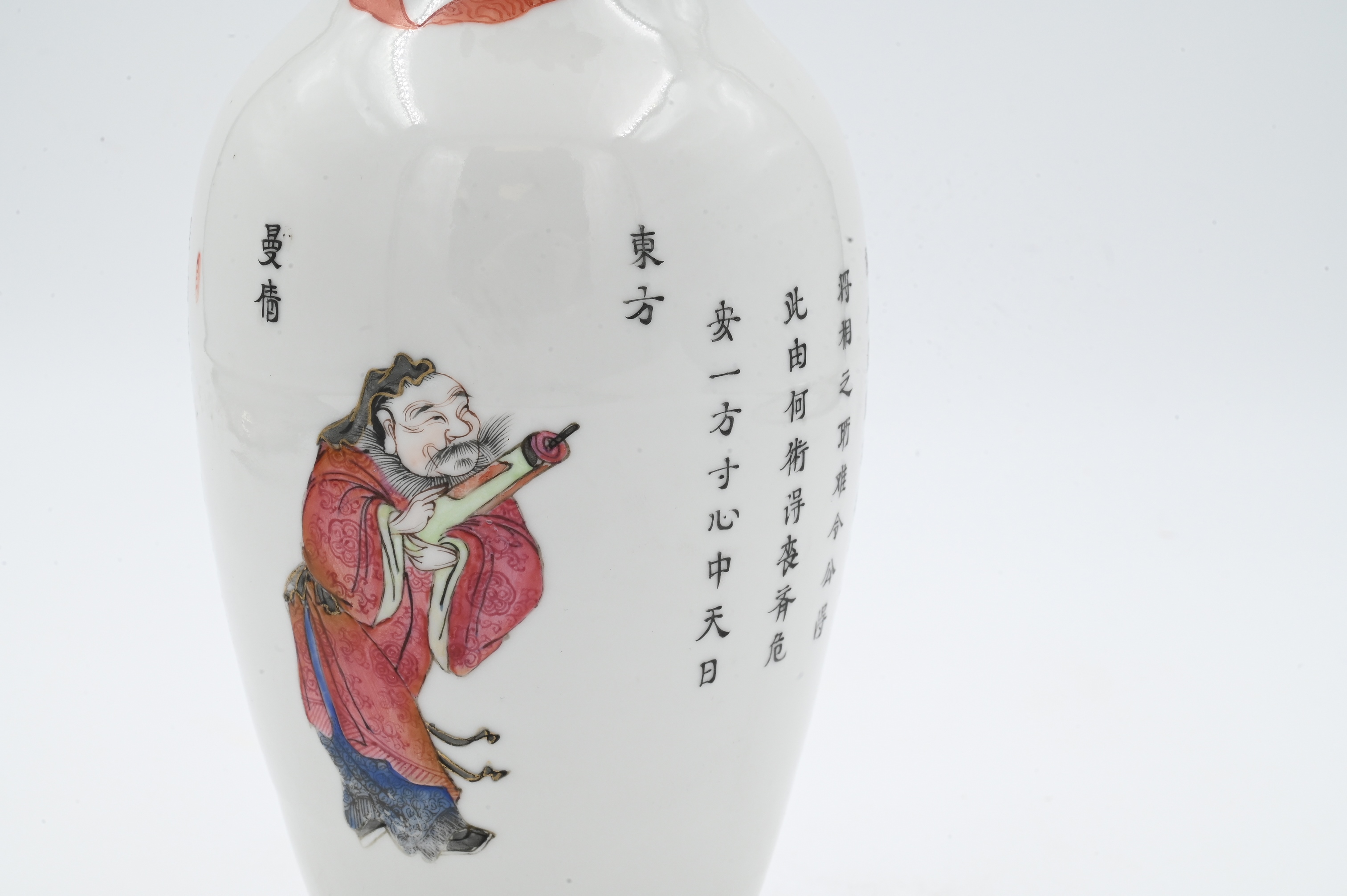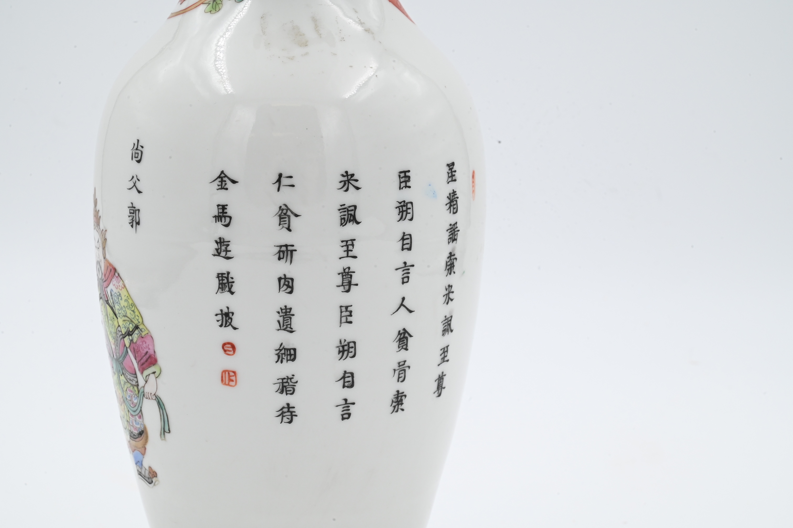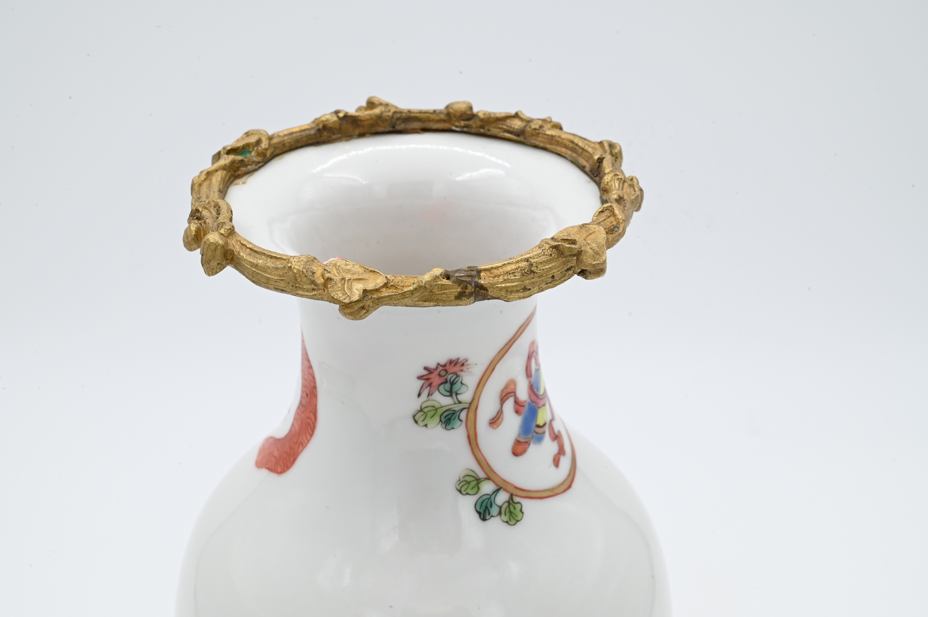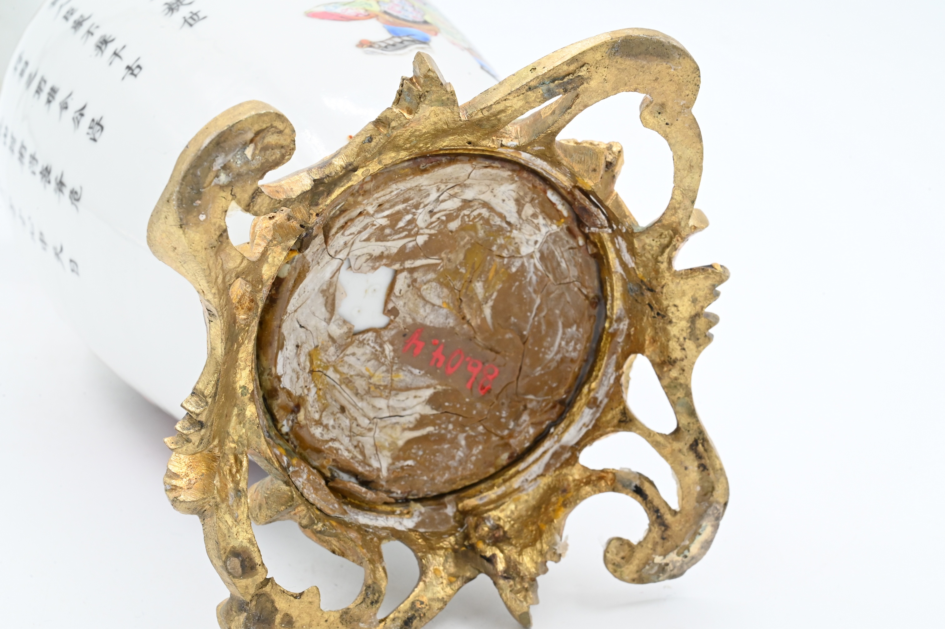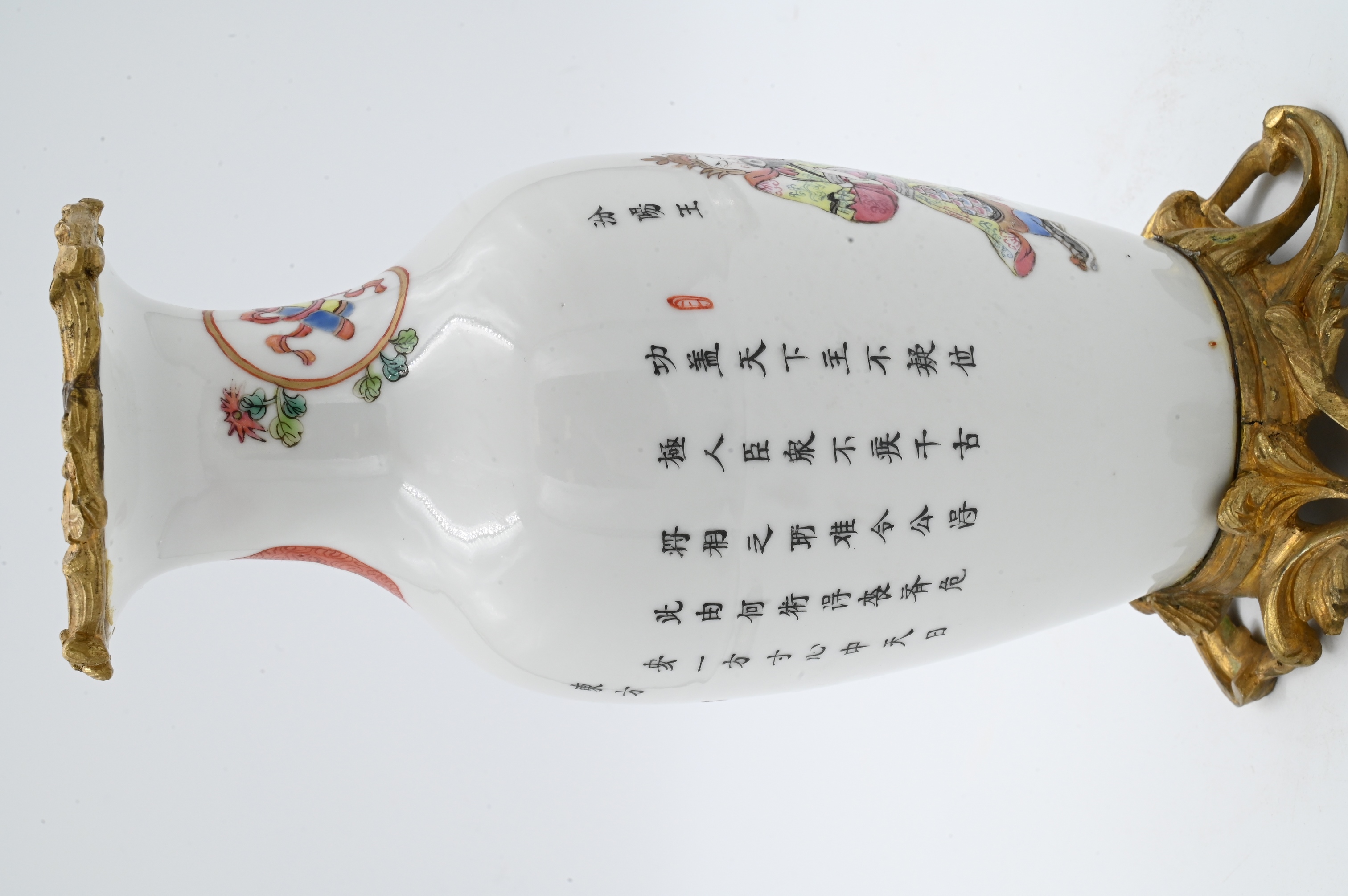 having painted scholar and warrior motif, character marks throughout, red signature stamps, having gilt bronze mounts on top flared rim and foot, appears to be in good condition