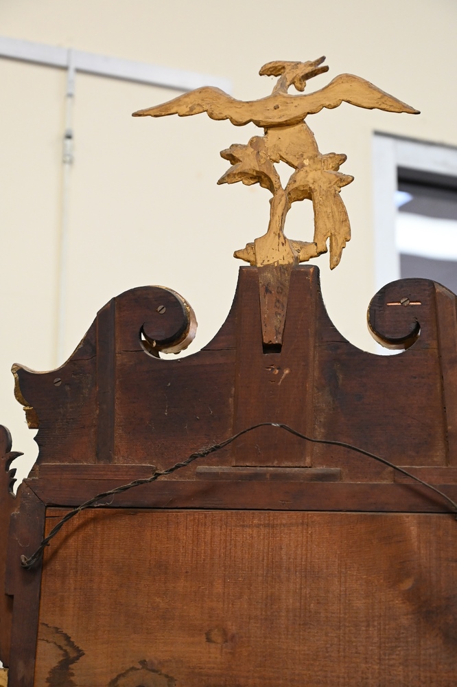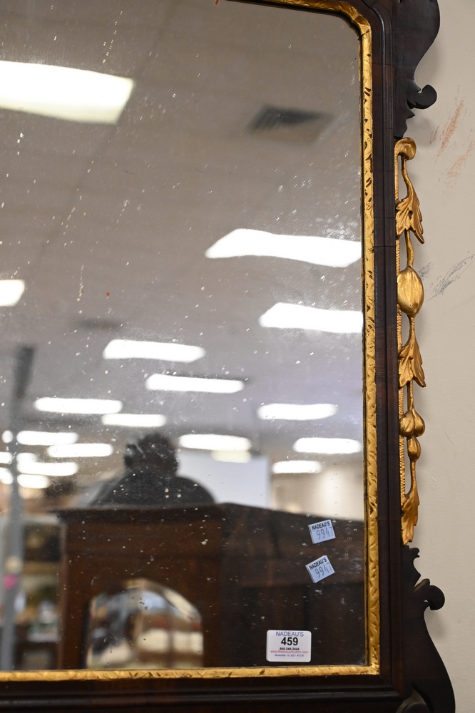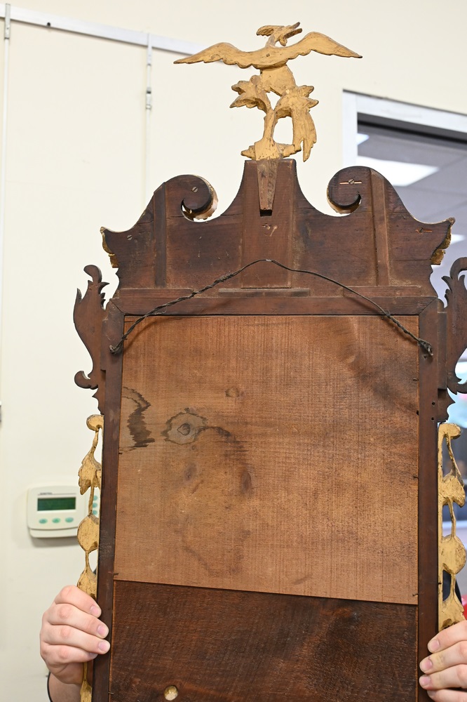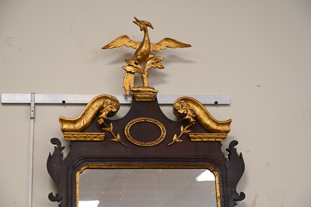 Lot 459: Chippendale Mahogany Mirror, having gilt phoenix bird top, marked with letters on back of eagle, 18th century, height 46 inches.