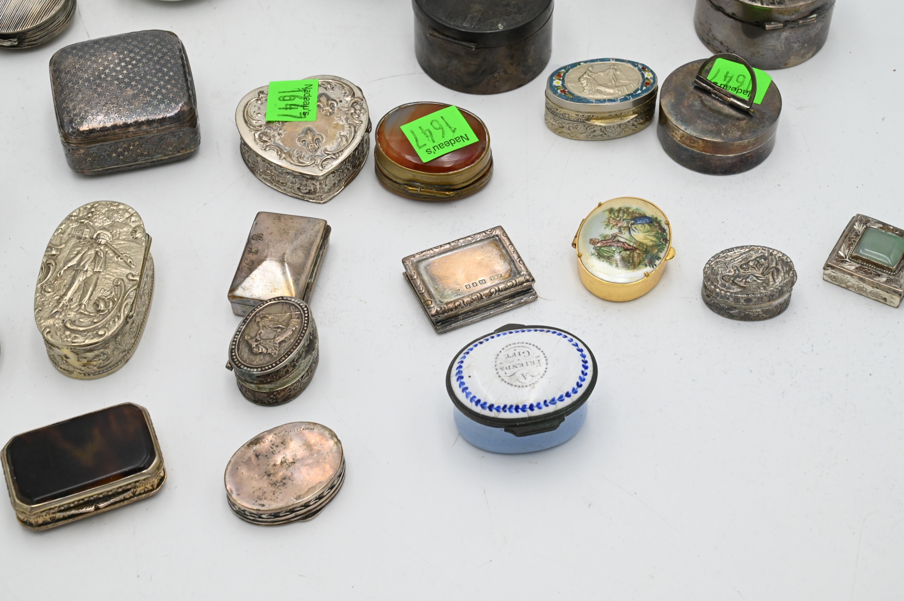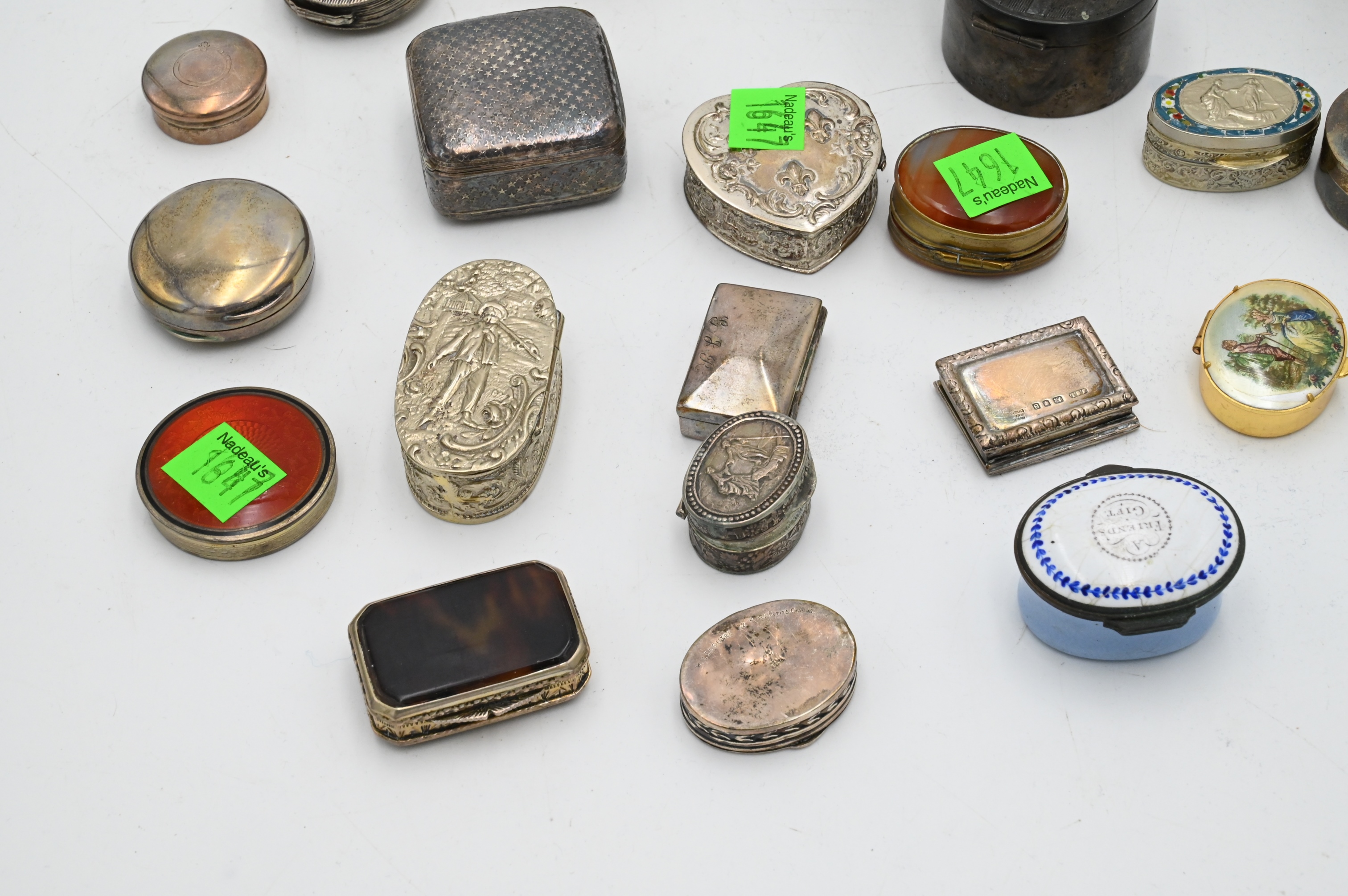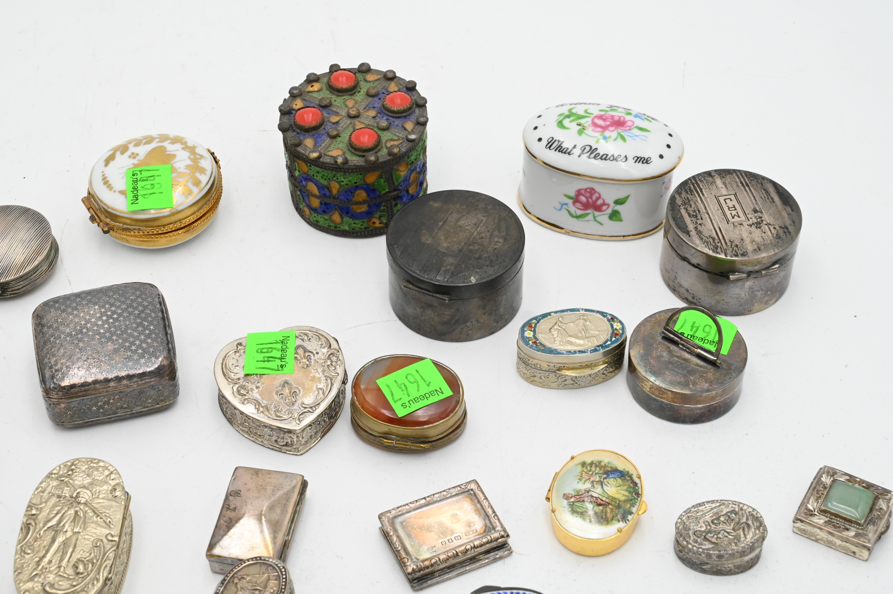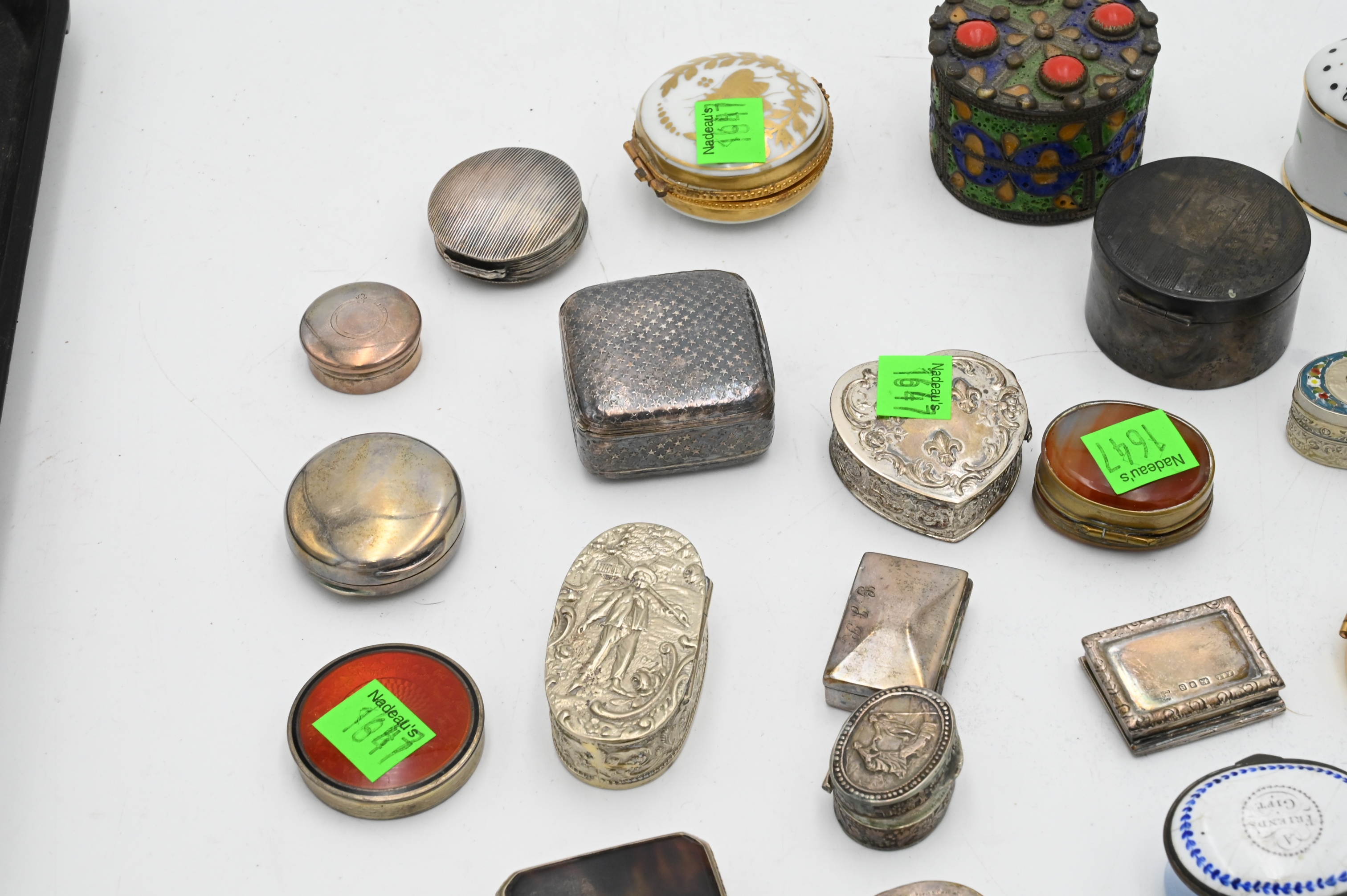 Collection of 25 Various Boxes, including sterling silver, some snuff boxes, one Buttasea, tallest height 1 1/2 inches.