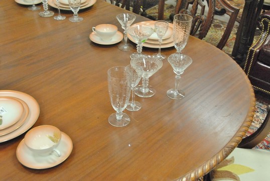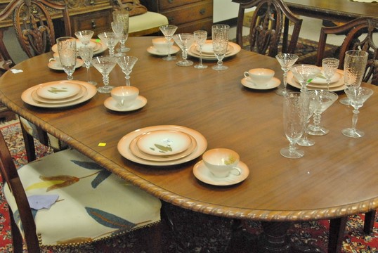 Lot 459: Custom mahogany dining table, double pedestal with oval top having rope edge with two 18 leaves and custom pads. ht. 29 in. top: 4…