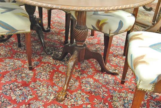 Custom mahogany dining table, double pedestal with oval top having rope edge with two 18 leaves and custom pads. ht. 29 in. top: 44 x 70 opens to 106