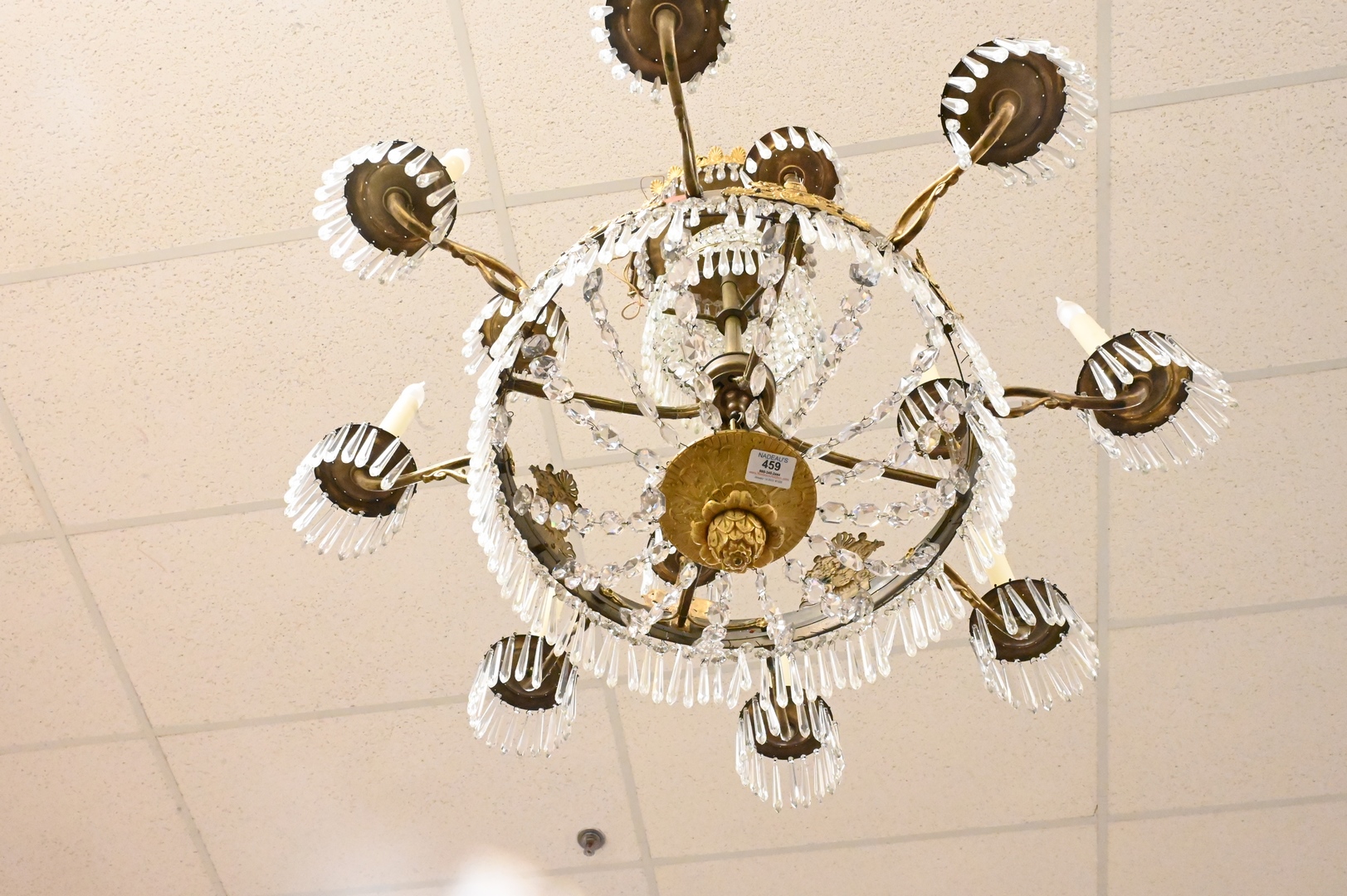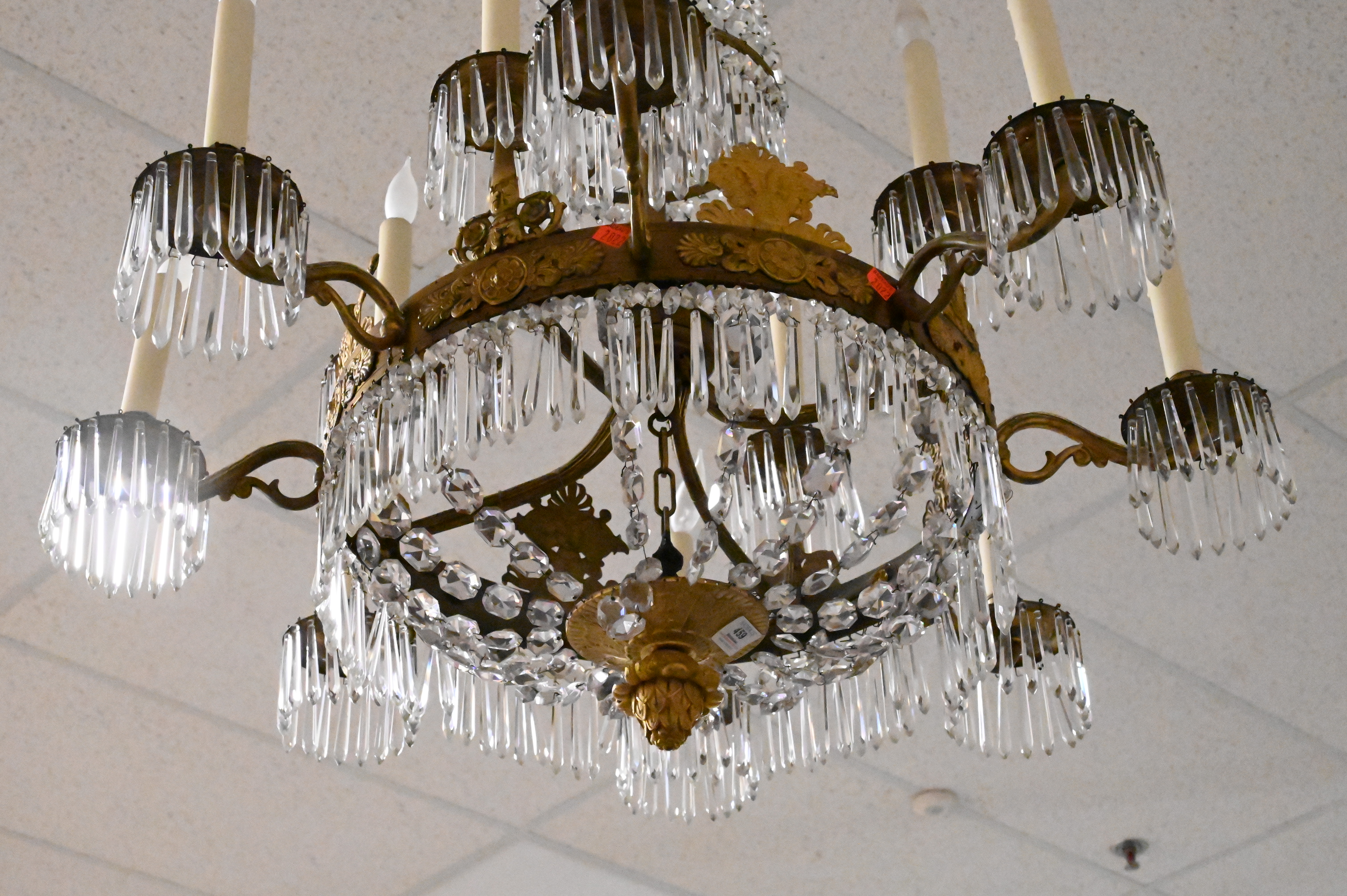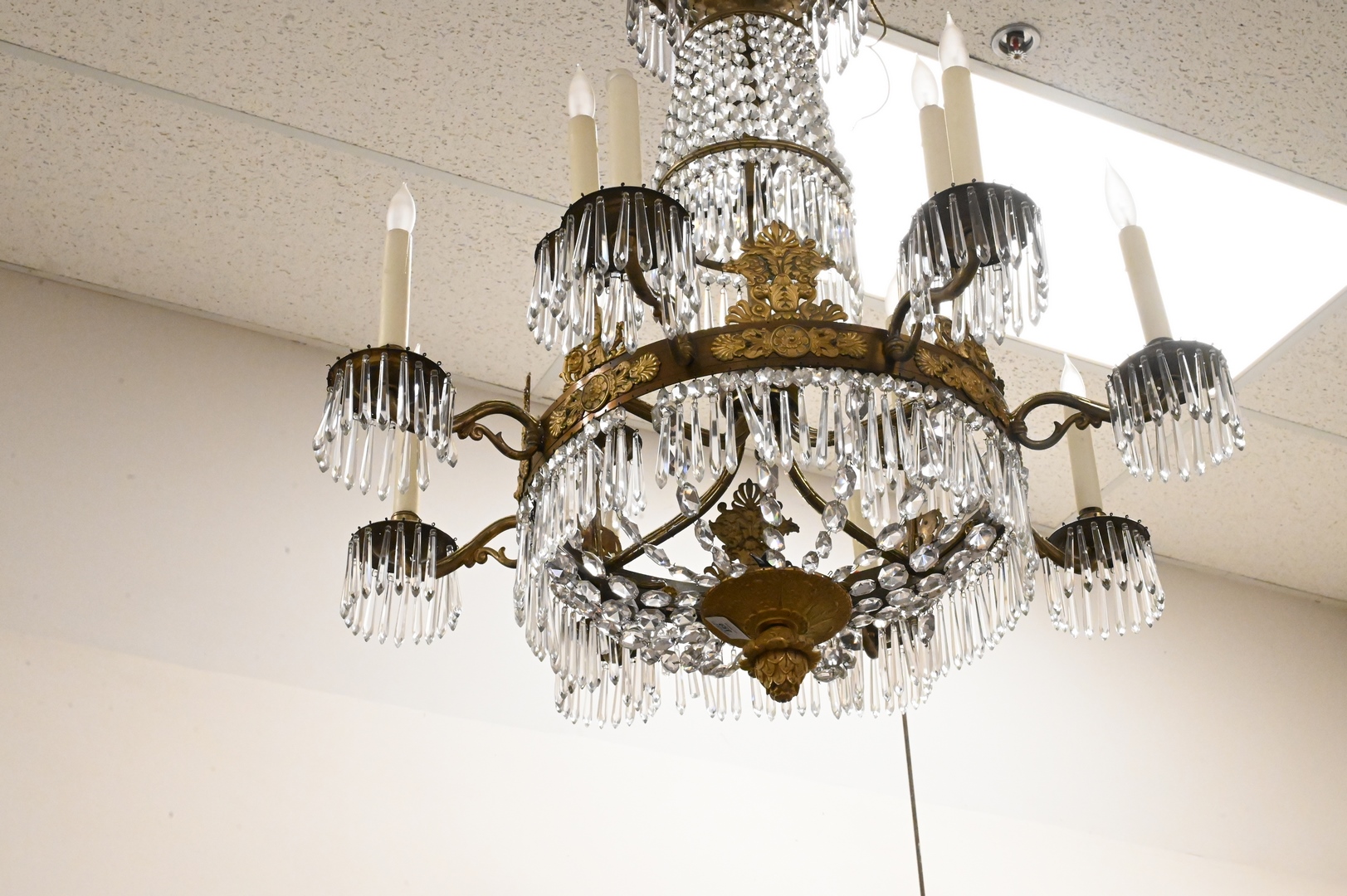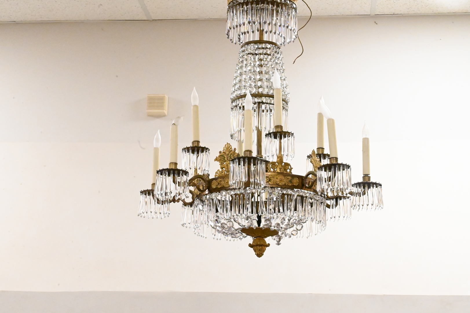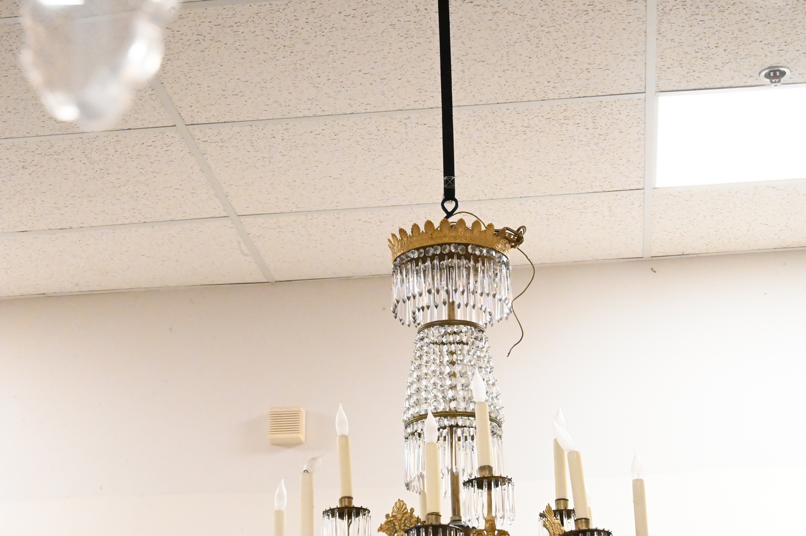 French Neoclassical Hanging Chandelier having circular frame with 12 arms and lights having glass prisms height 38 inches, diameter 32 inches