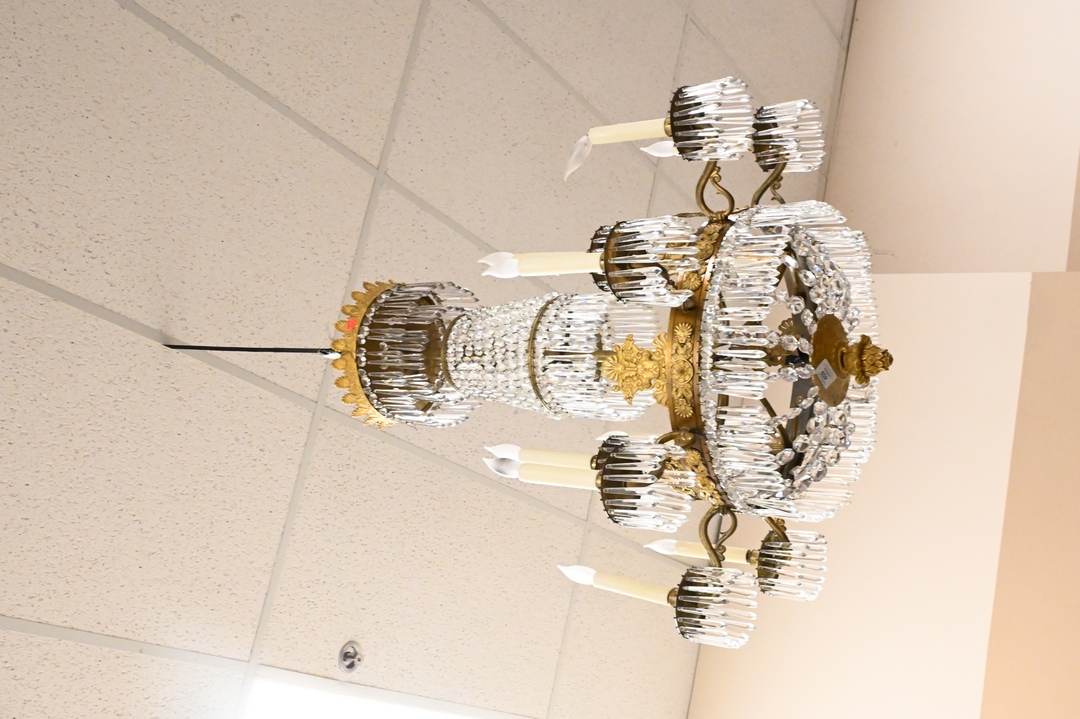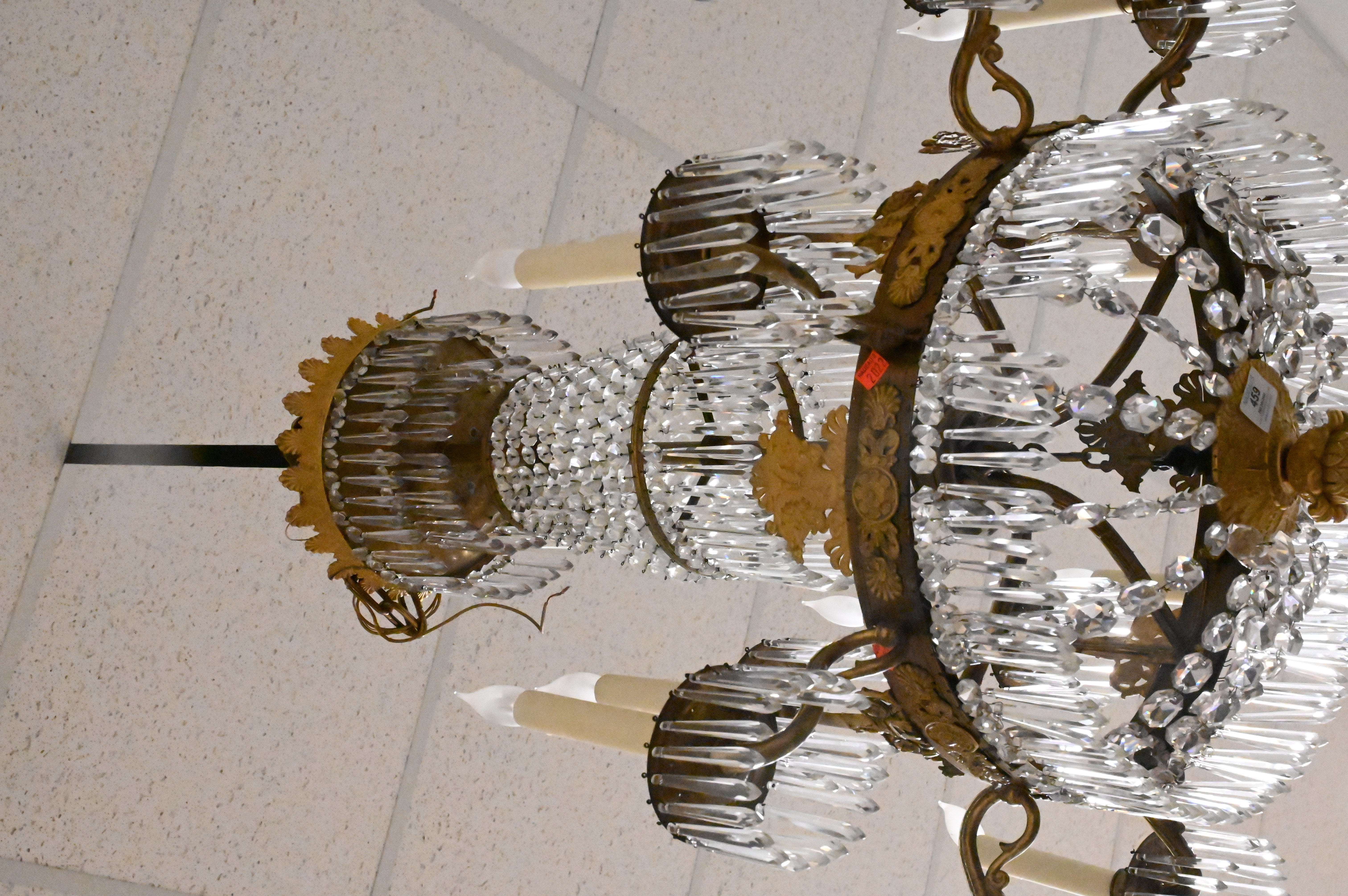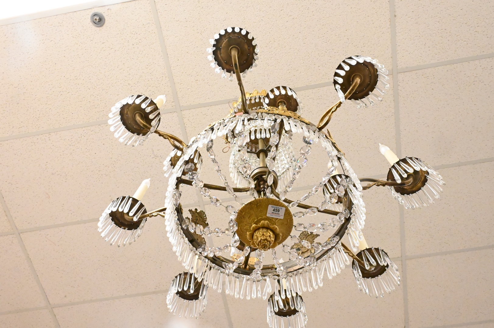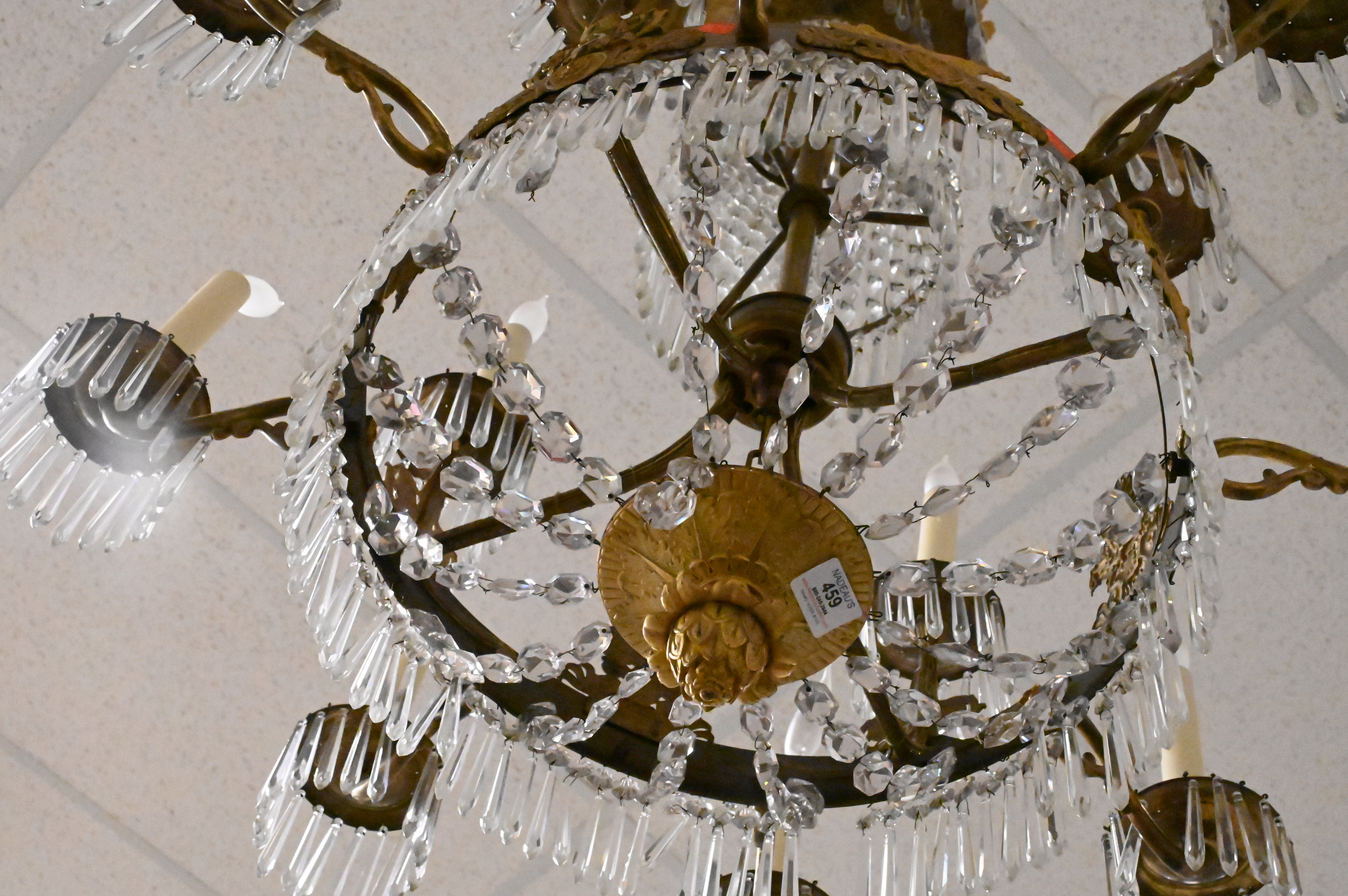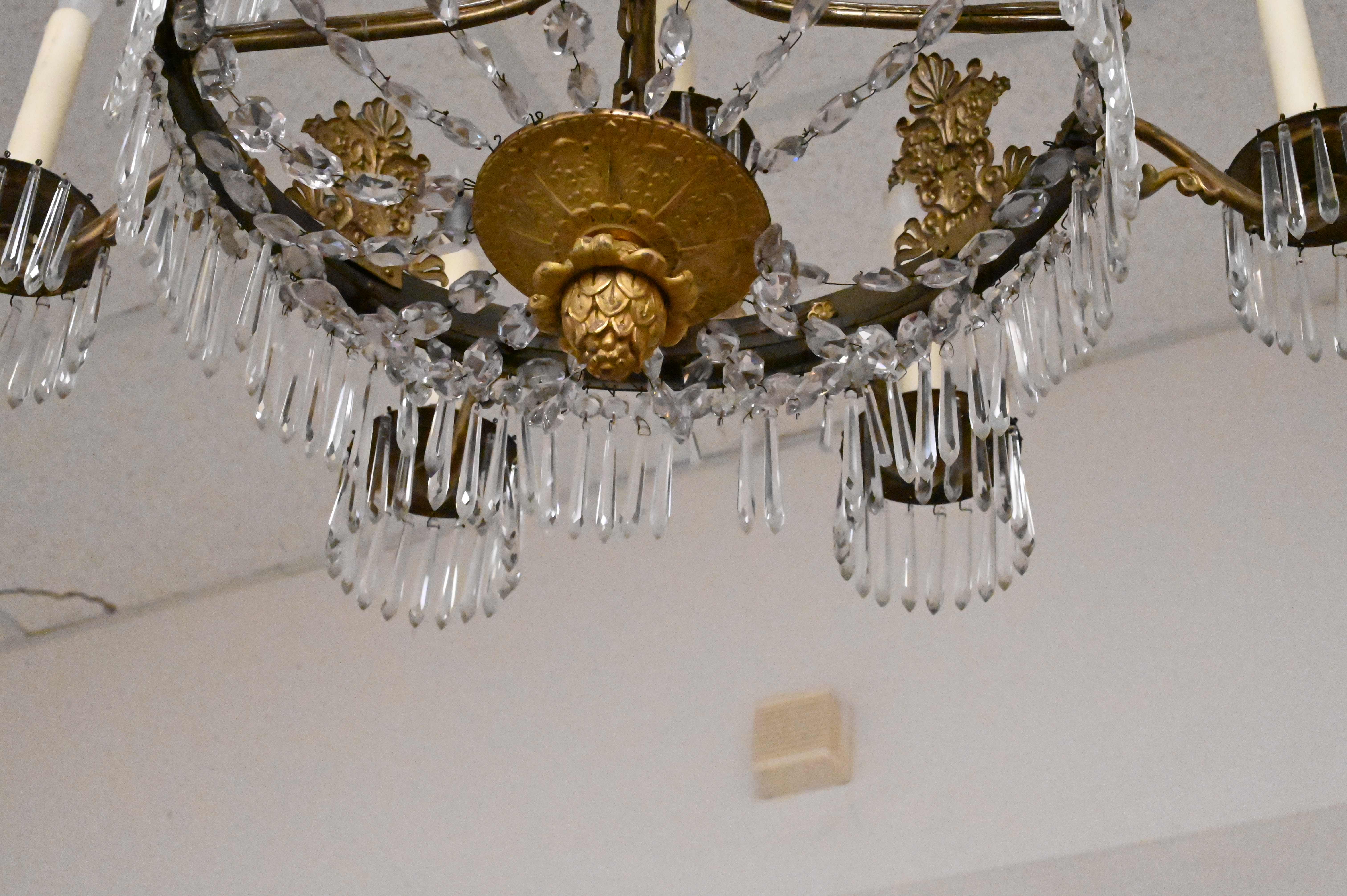 French Neoclassical Hanging Chandelier having circular frame with 12 arms and lights having glass prisms height 38 inches, diameter 32 inches