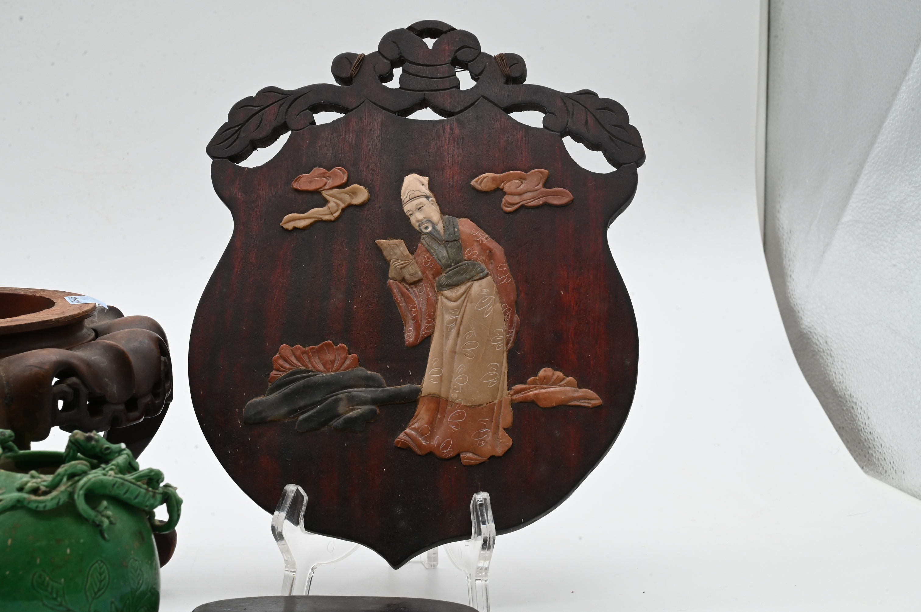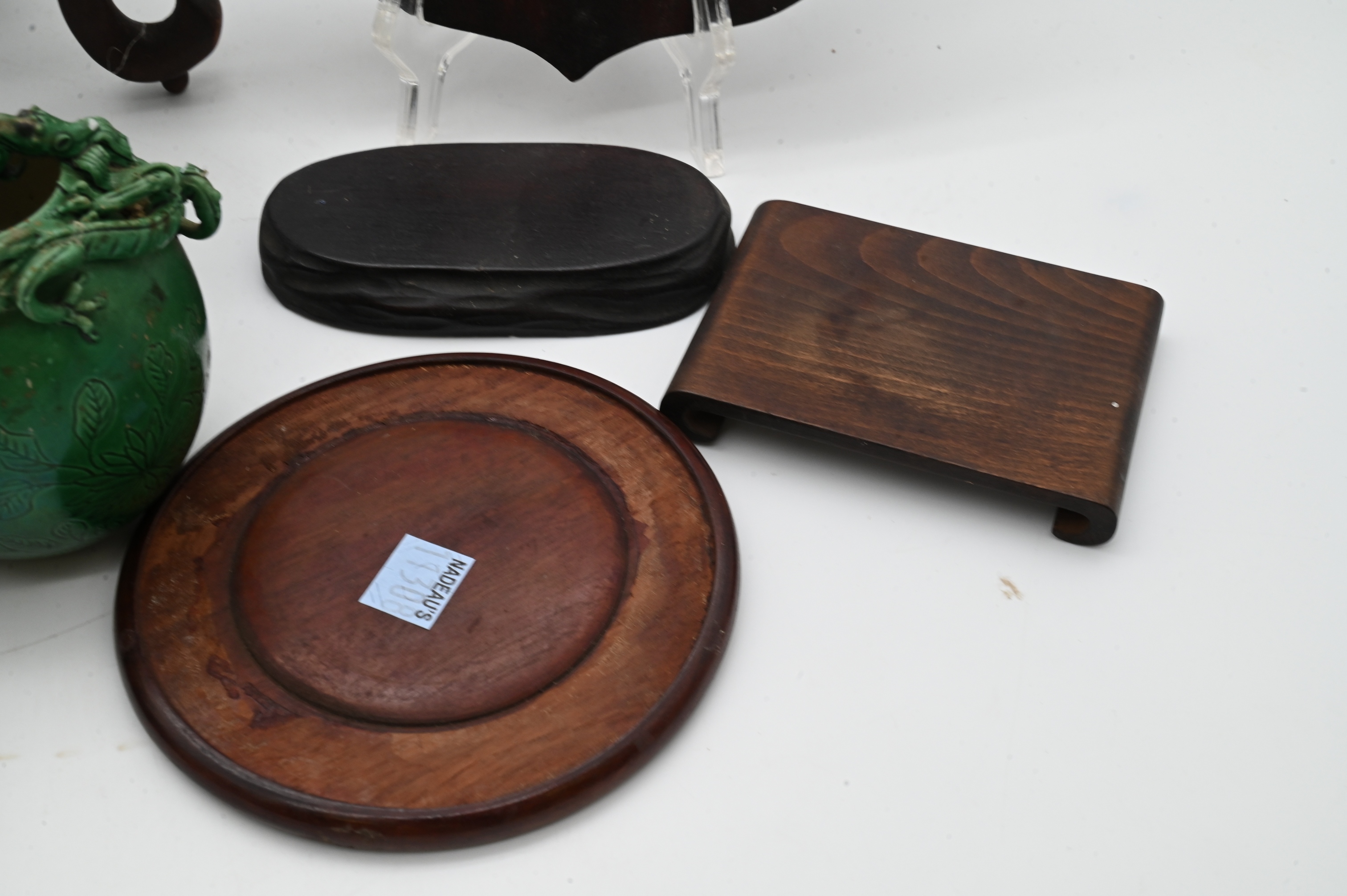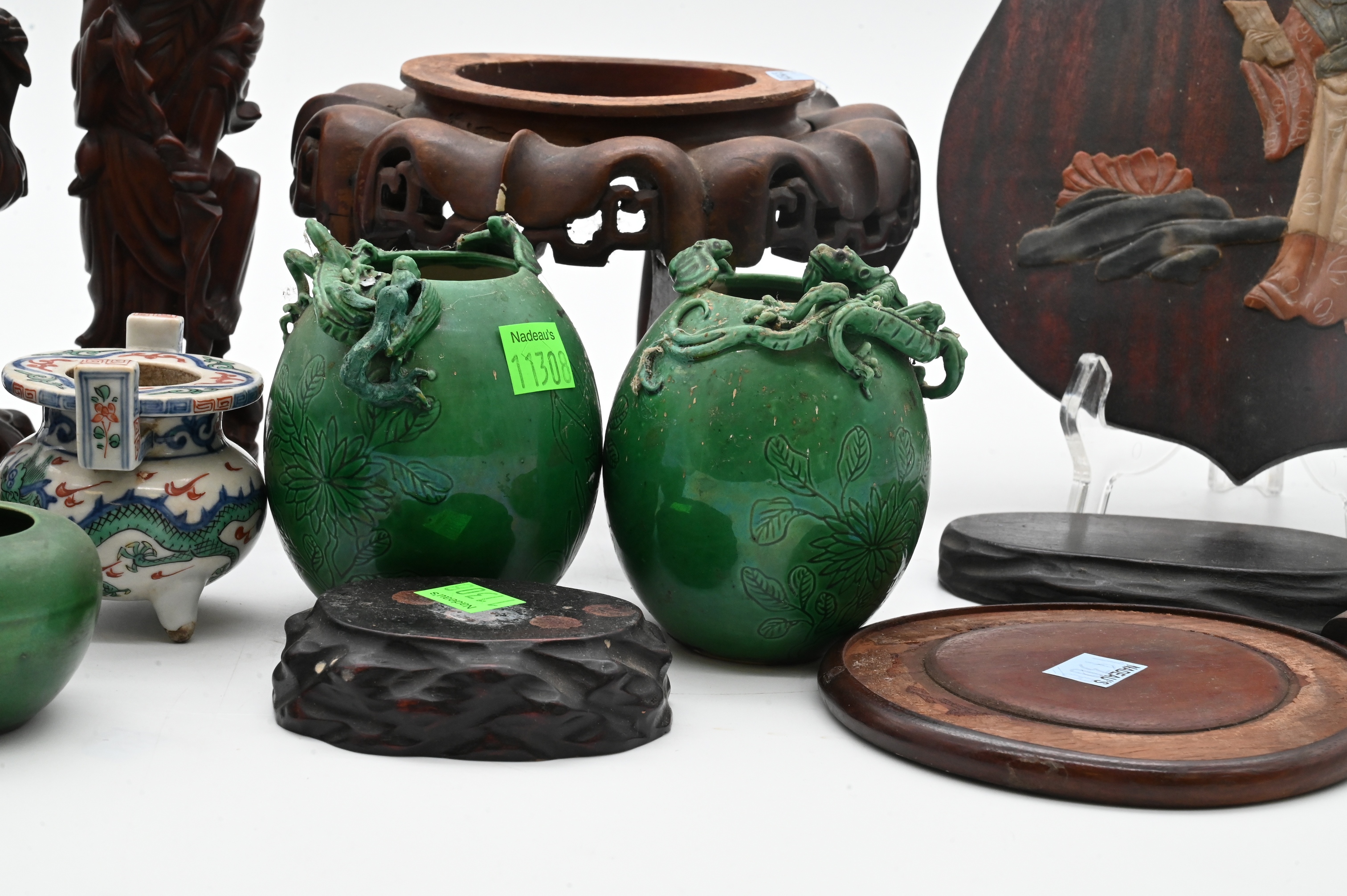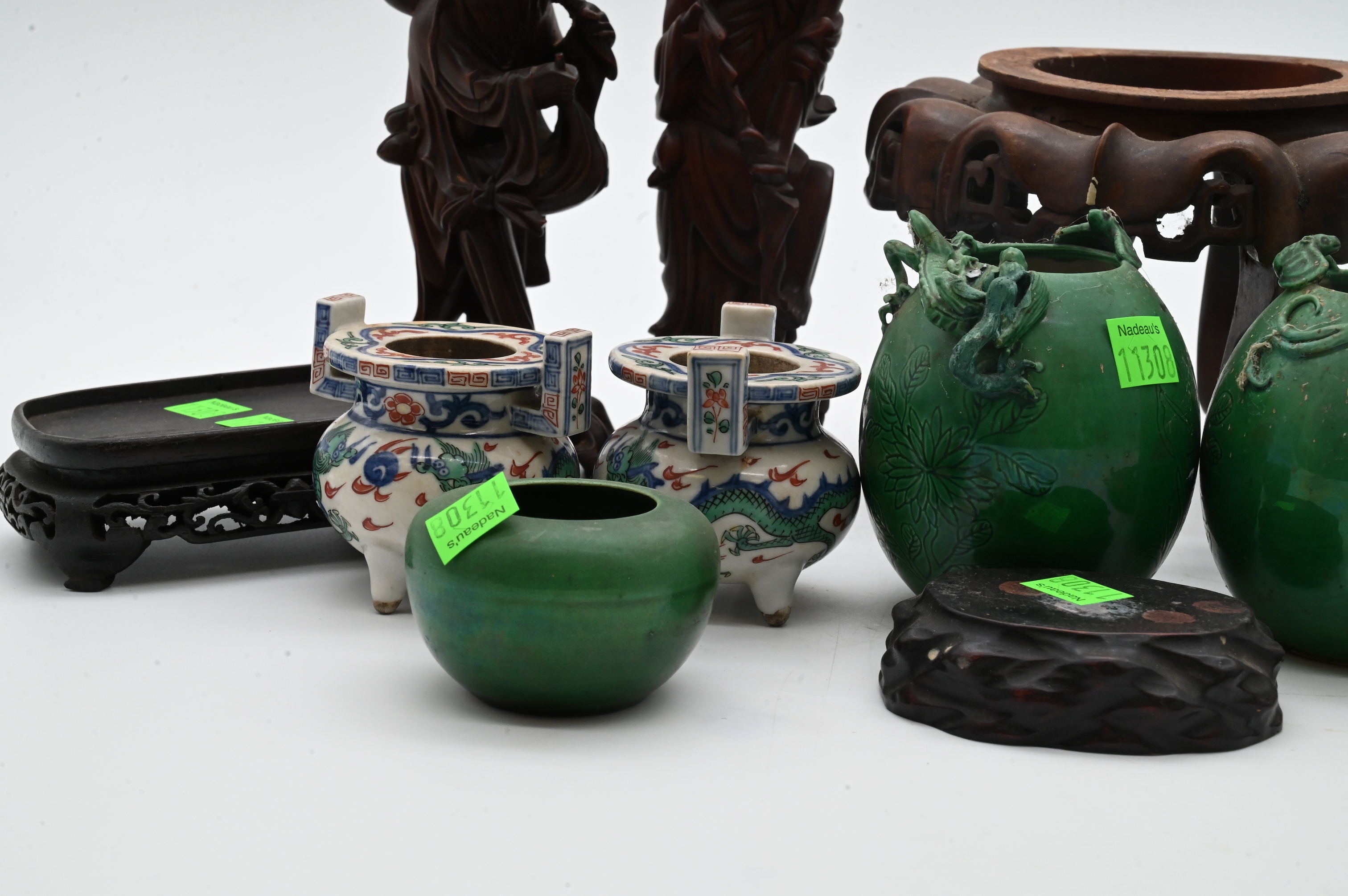 two green glazed pottery vessels with applied chilong style handles and incised leaf decoration, two carved wood figures and assorted wooden stands and small decorative items