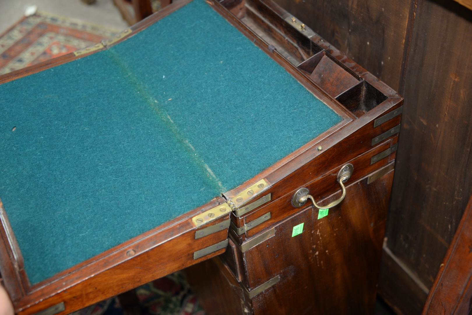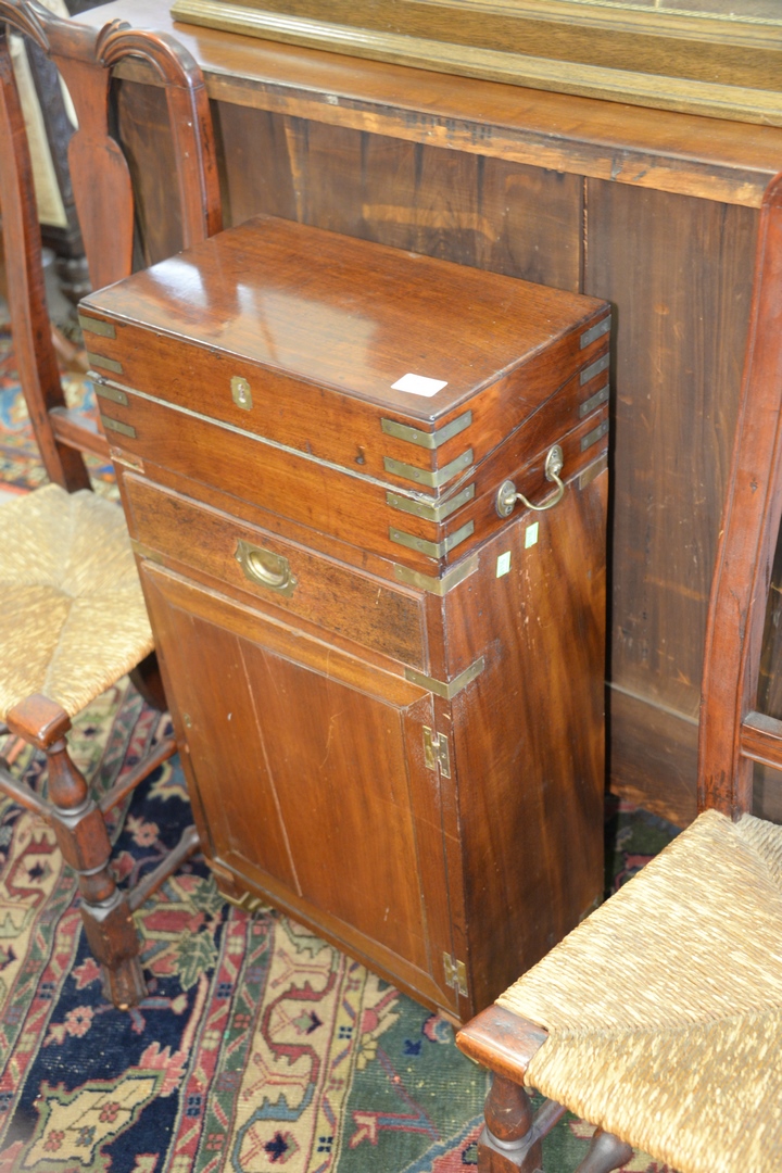 Lot 459: Mahogany Lap Desk mounted on base with drawer and door all with brass mounts height 34 inches, top 9 3/4 x 16 3/4