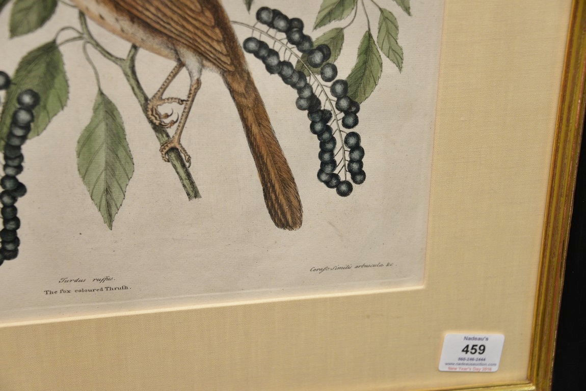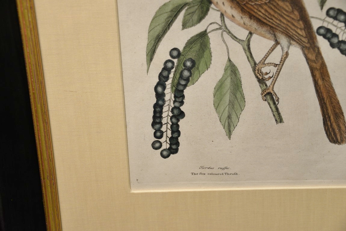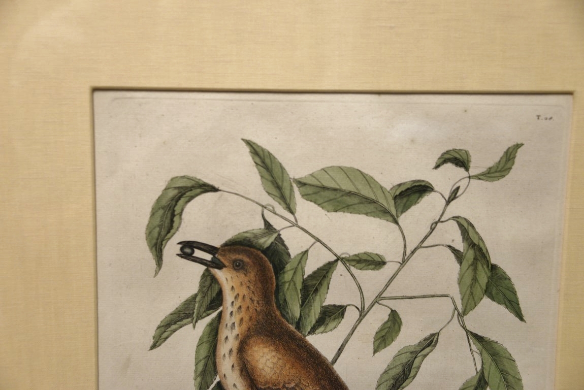 Mark Catesby 1679-1749 pair of hand colored copper engravings The Turtle of Carolina, Turtur Caroliniensis Plate #24 and The Fox Coloured Thrus, Turdus Ruffus Plate #28 From The Natural History of Carolina, Florida and the Bahama Islands sight size: 14 x 10 1/2 Provenance: Property from Credit Suisse’s Americana Collection